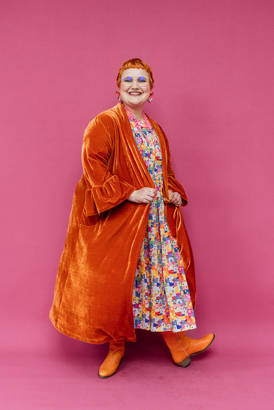 Velvet Ruffle Maxi Cardigan in Burnt Orange