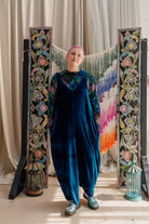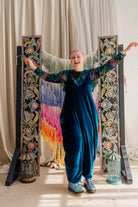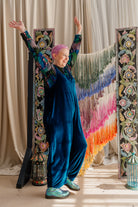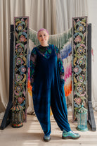 Slink or strut into this room and make a lasting impact in this fabulous velvet dungaree jumpsuit in beautiful teal! Super easy fitting and fantastically versatile!