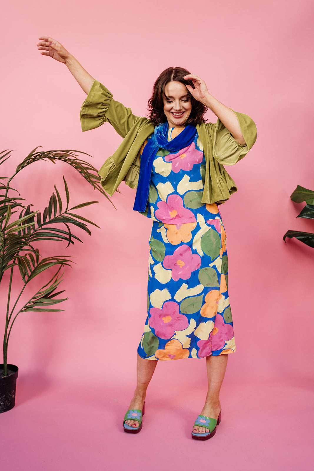 Styled with Velvet Bolero in Lime Green and Wrap Skirt in Bold Floral