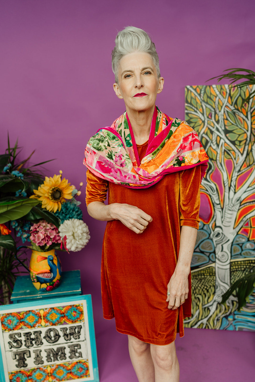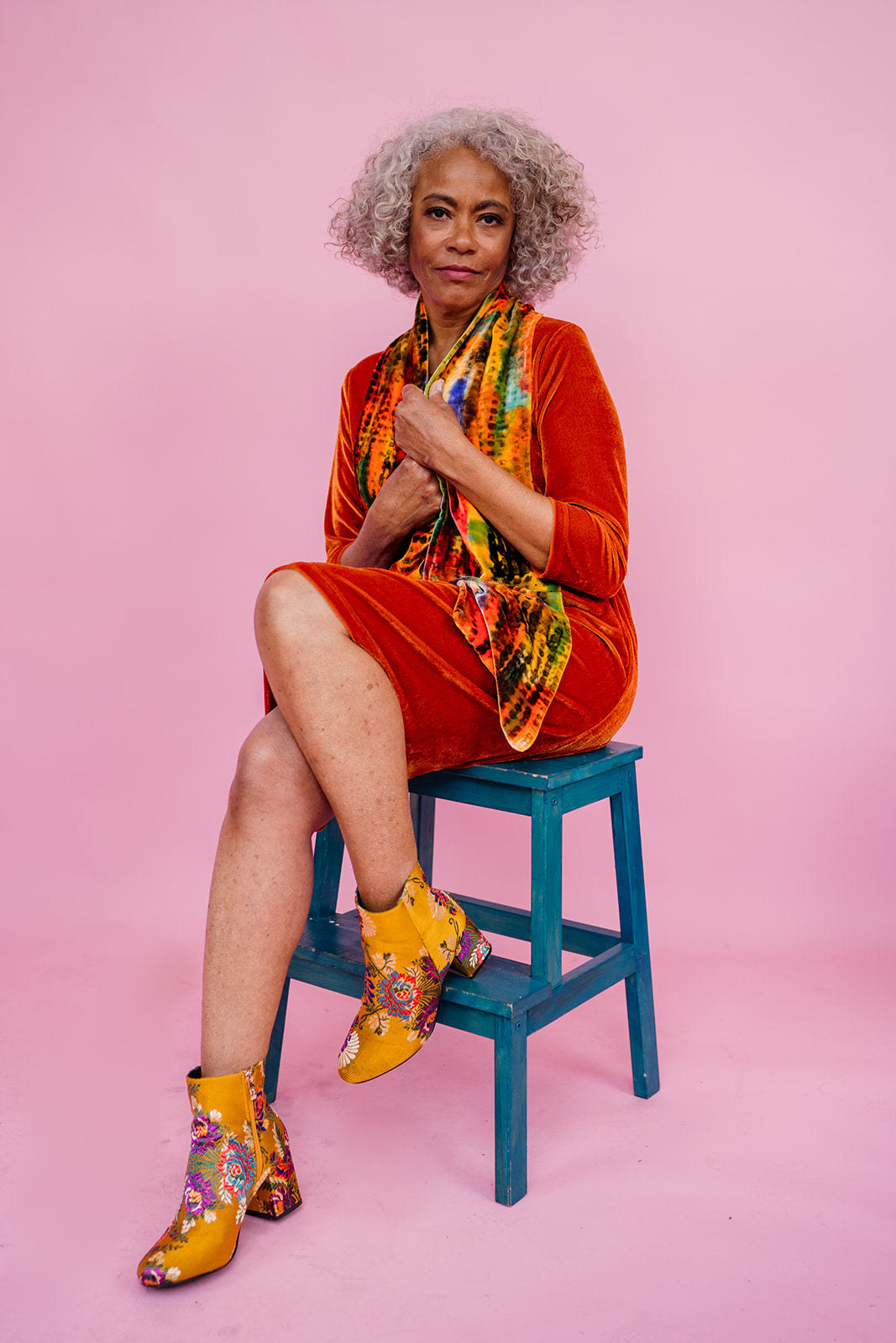 Styled with our Embellished Wool & Velvet Neck Wrap in Burnt Orange and Velvet Scarf in Citrus Devore