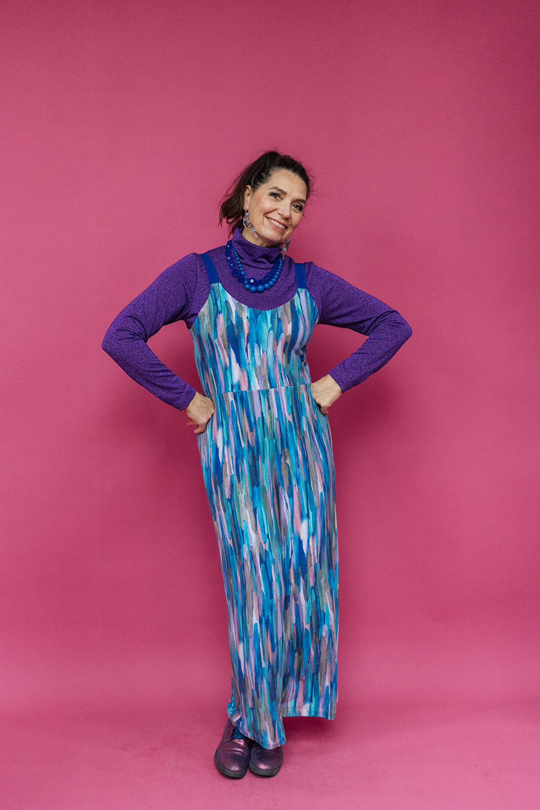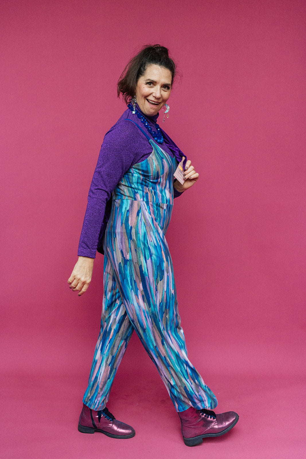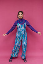 Relaxed fit jumpsuit in super soft and vibrant printed jersey. V-front and back with wide elastic straps and straight legs. This style can be casual or easily dressed up for a special event.