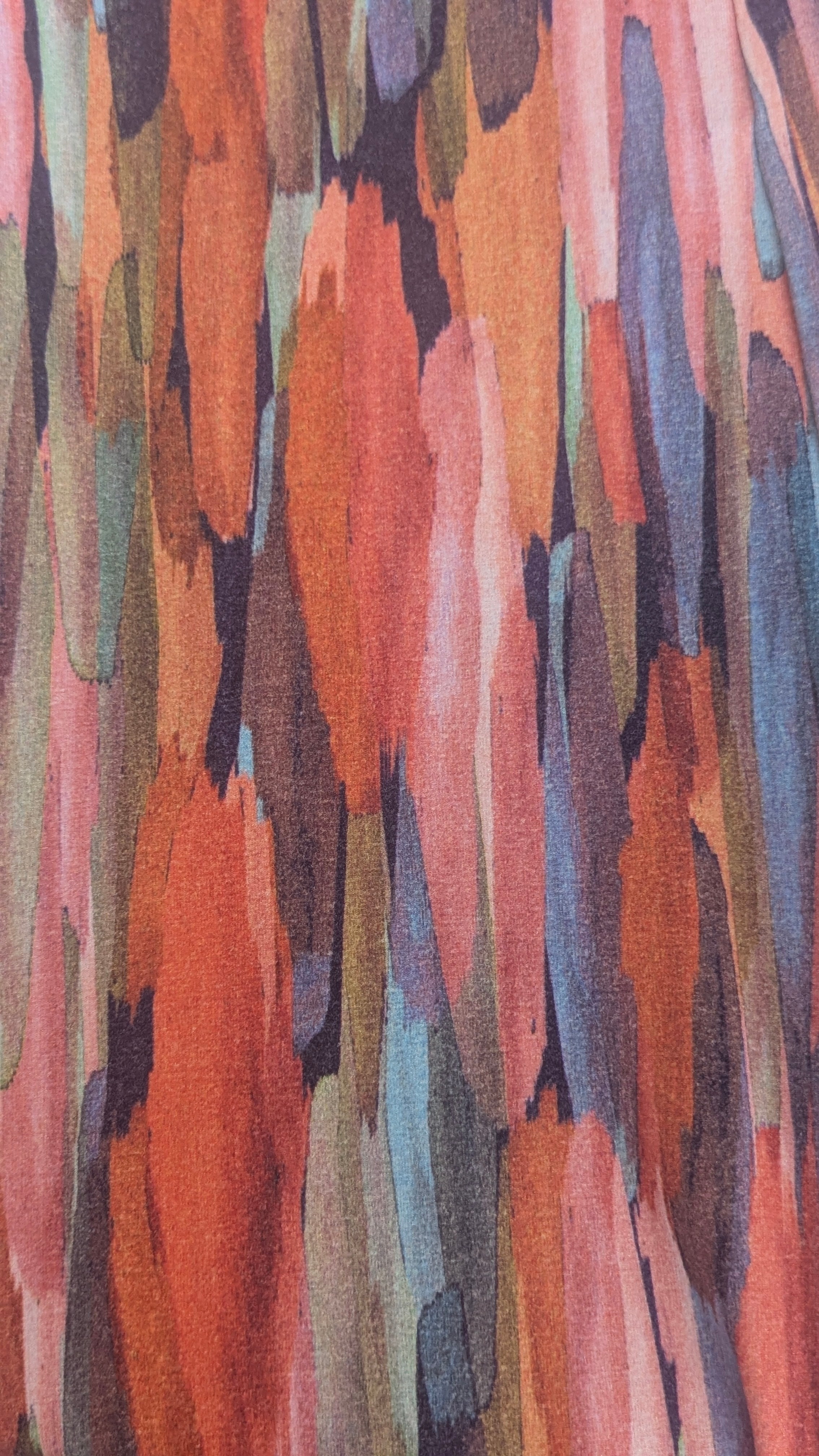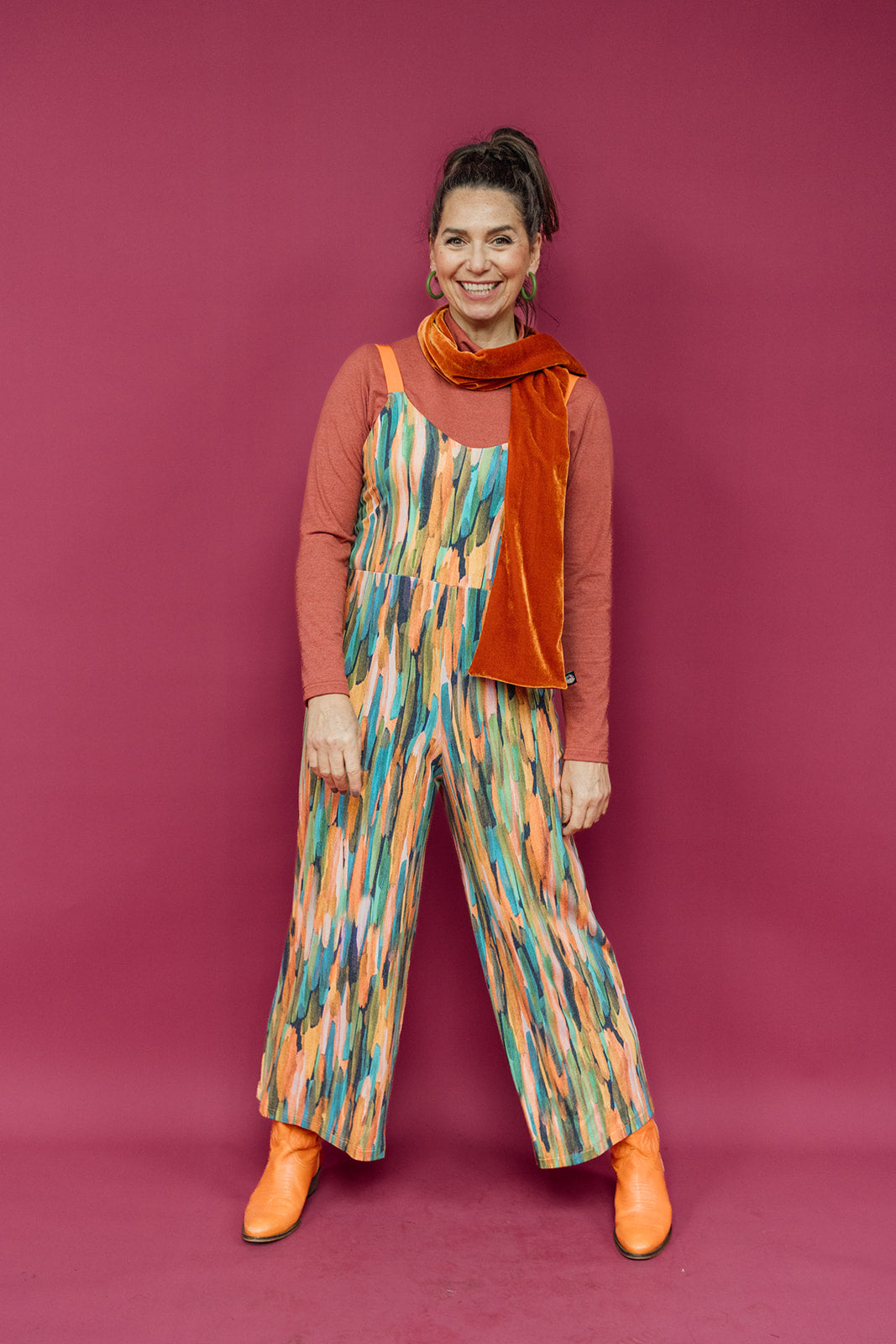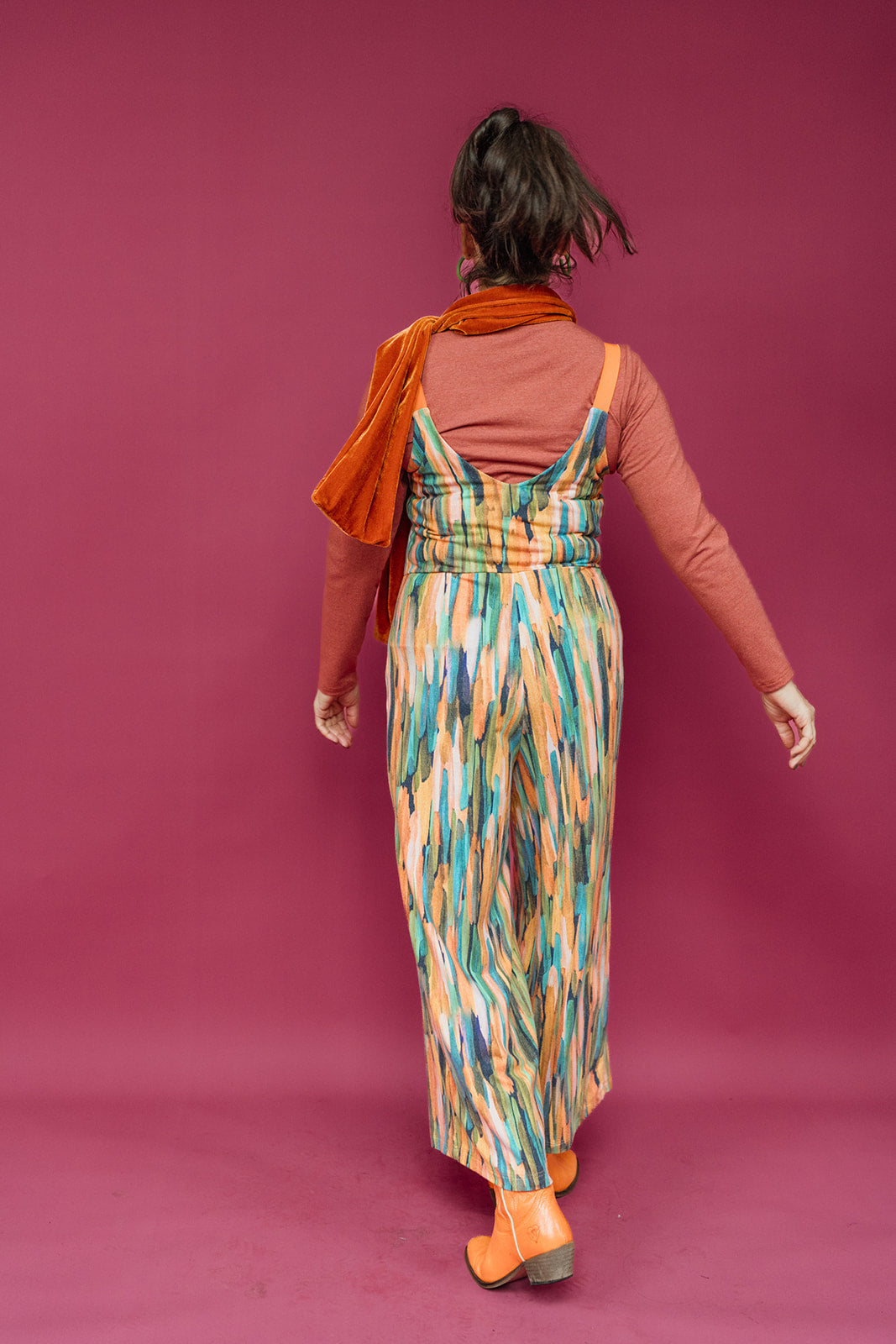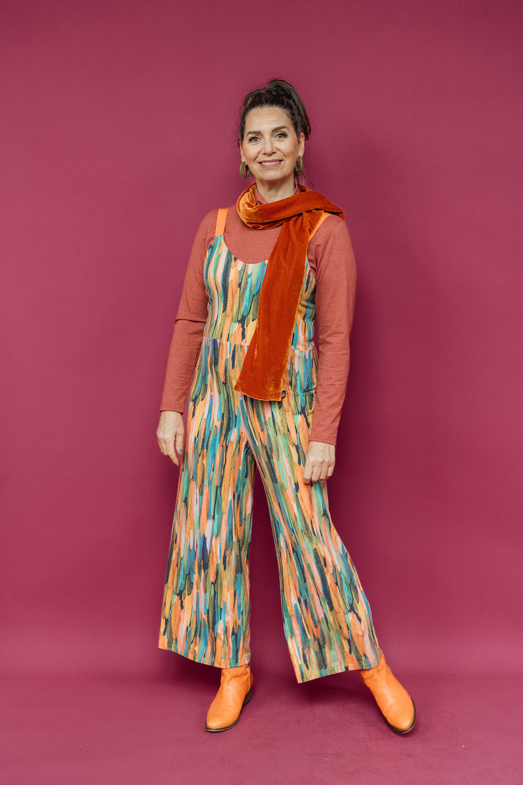 Relaxed fit jumpsuit in super soft and vibrant printed jersey. V-front and back with wide elastic straps and straight legs. This style can be casual or easily dressed up for a special event.