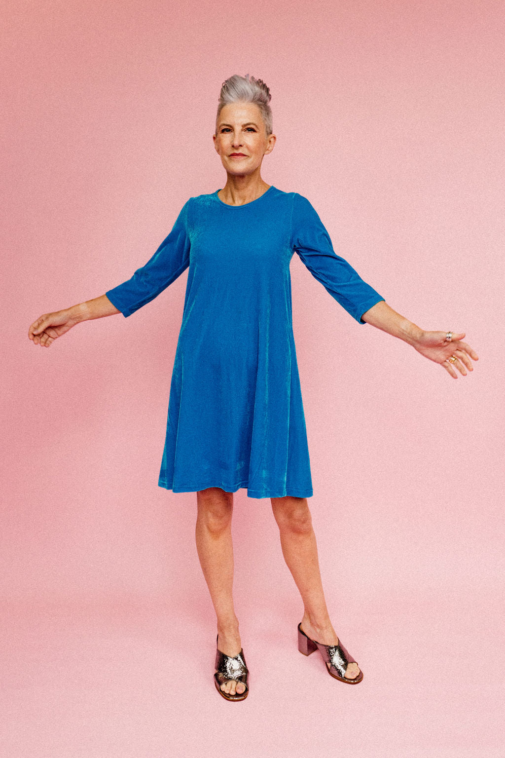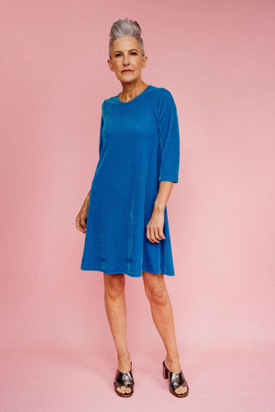 Swing dress with 3/4 sleeve in gorgeous, soft velvet and cut on an a-line for a lovely, flattering drape. This dress can be worn as a tunic over trousers, with bare legs and sandals in the summer or layered up with tights and boots to keep out the winter chill. Great for dressing up or down making is a versatile addition to any wardrobe and available in a wide range of luxurious colours.