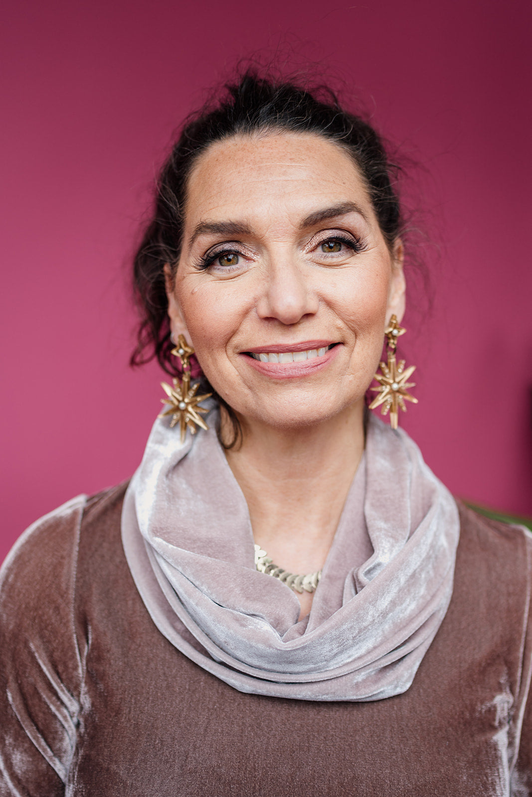Styled with Velvet Straight Leg Trousers and Jacket in Mushroom, and Velvet Cowl in Oyster