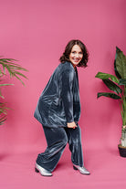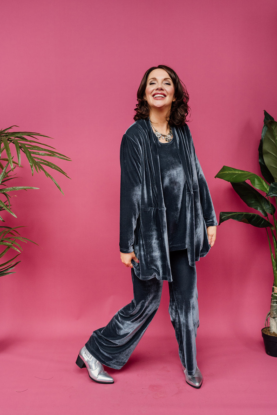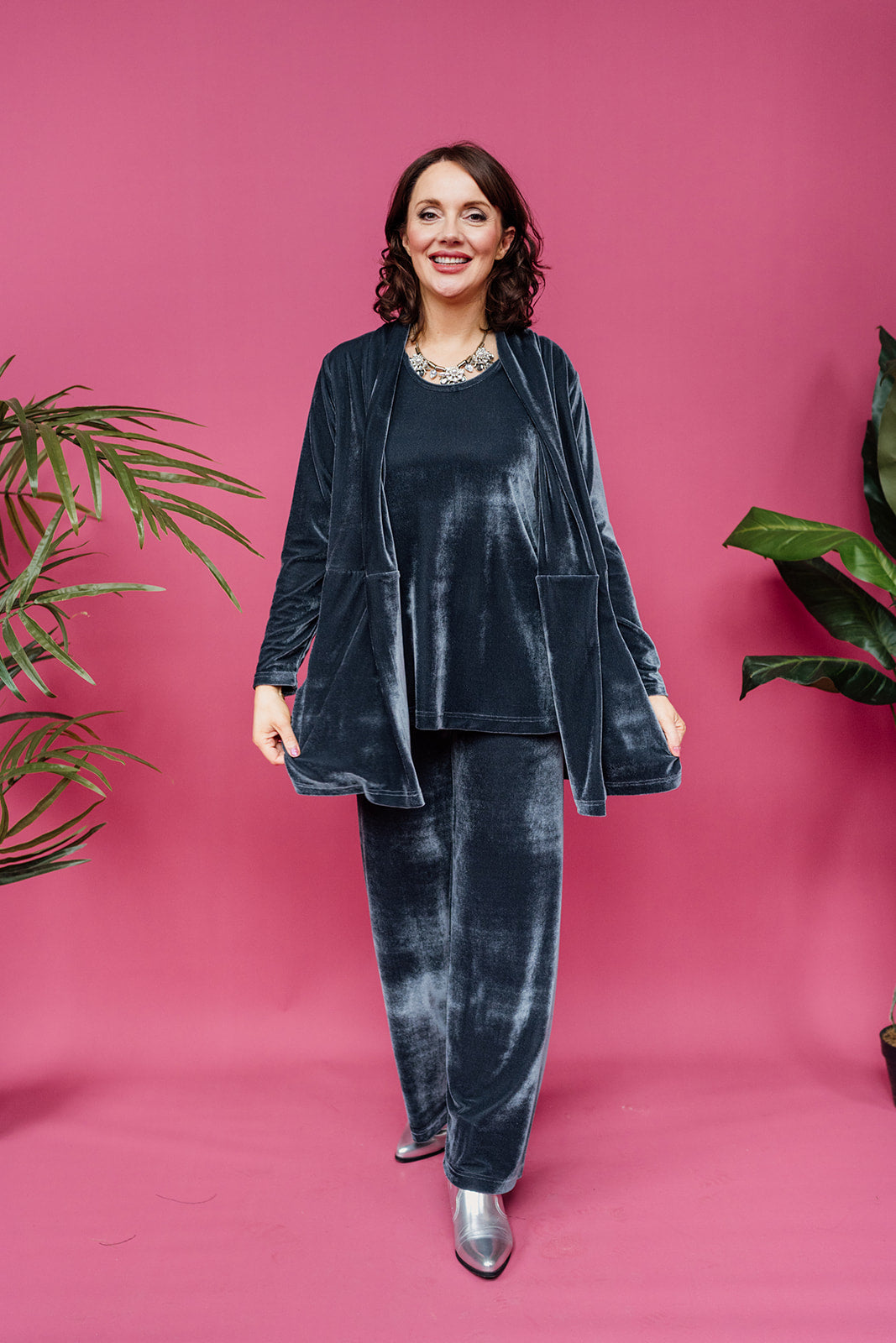 Styled with Straight Leg trousers and Jacket in Slate Grey Velvet.