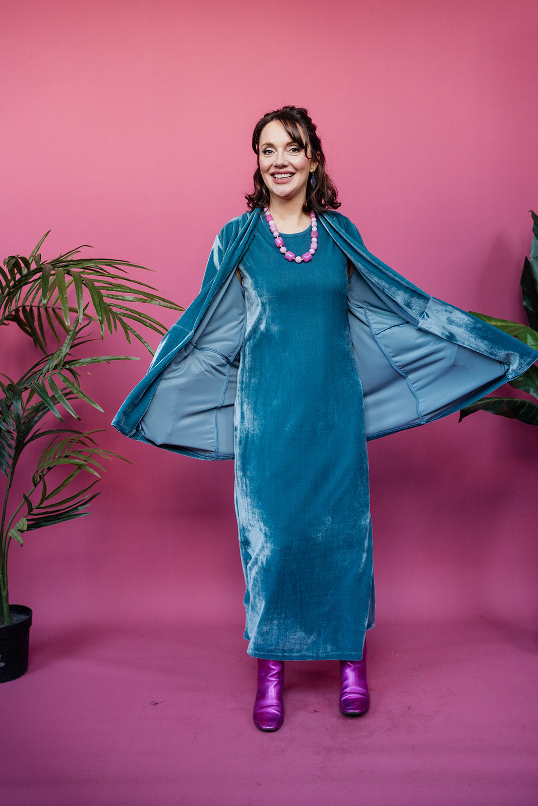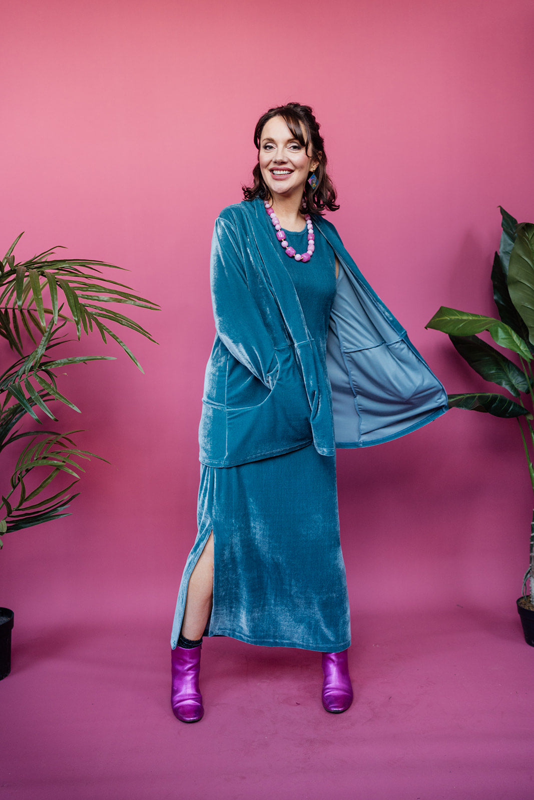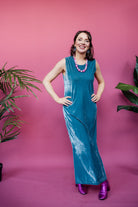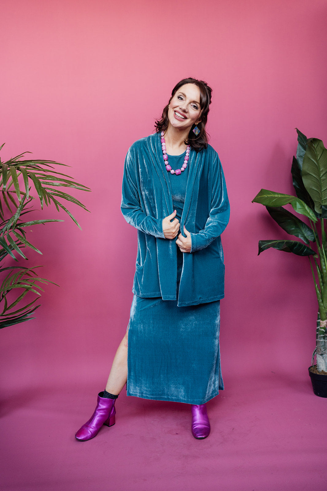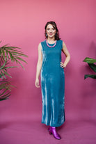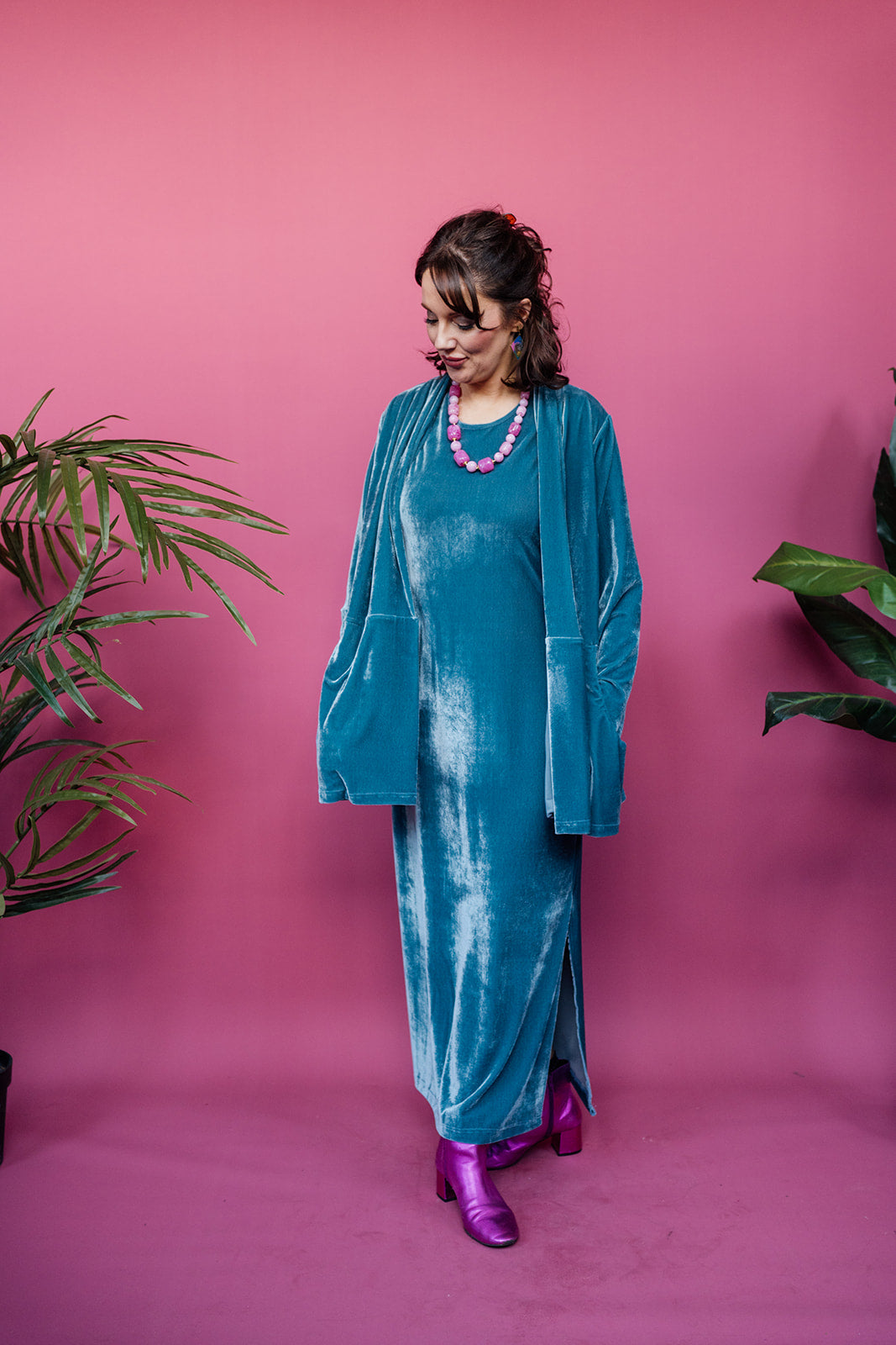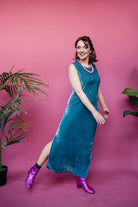 Stunning velvet maxi dress, great for dressing up or down making it a versatile addition to any wardrobe and available in a wide range of luxurious colours. Complete with side splits..