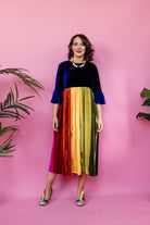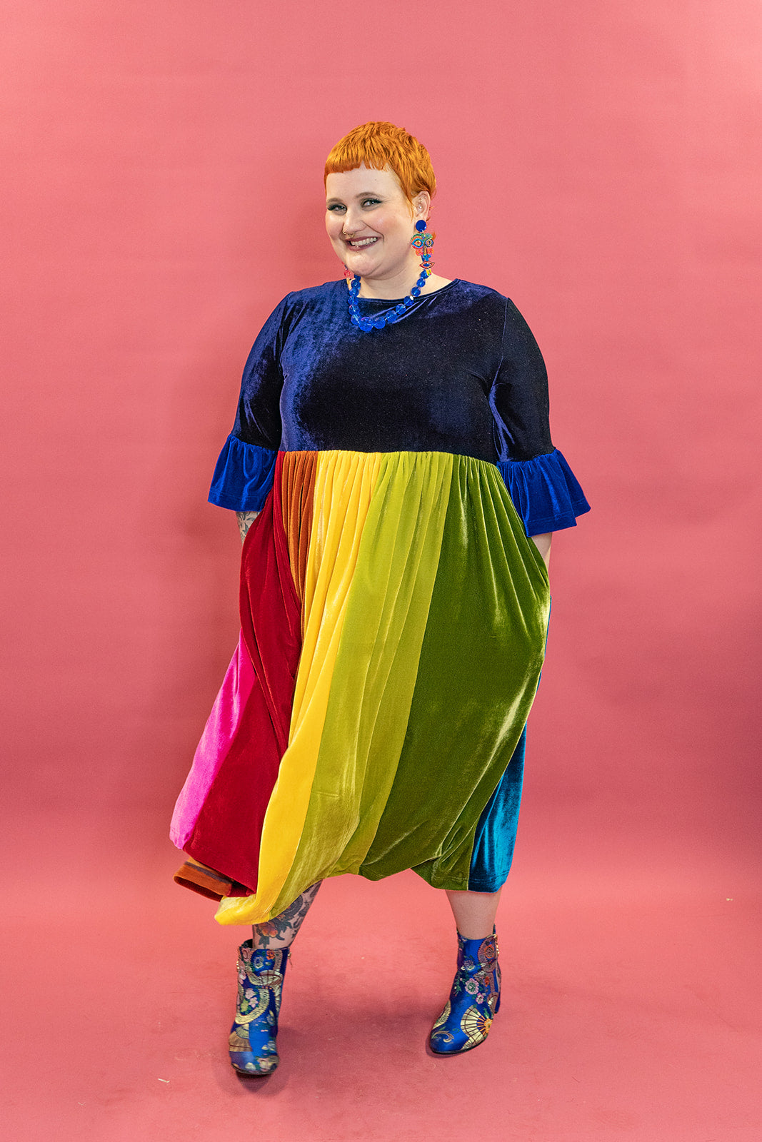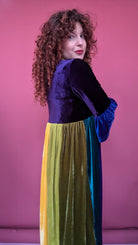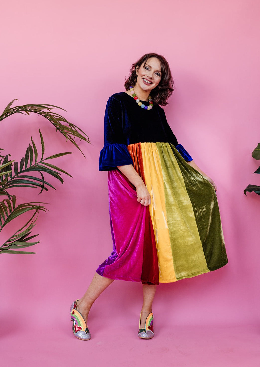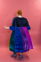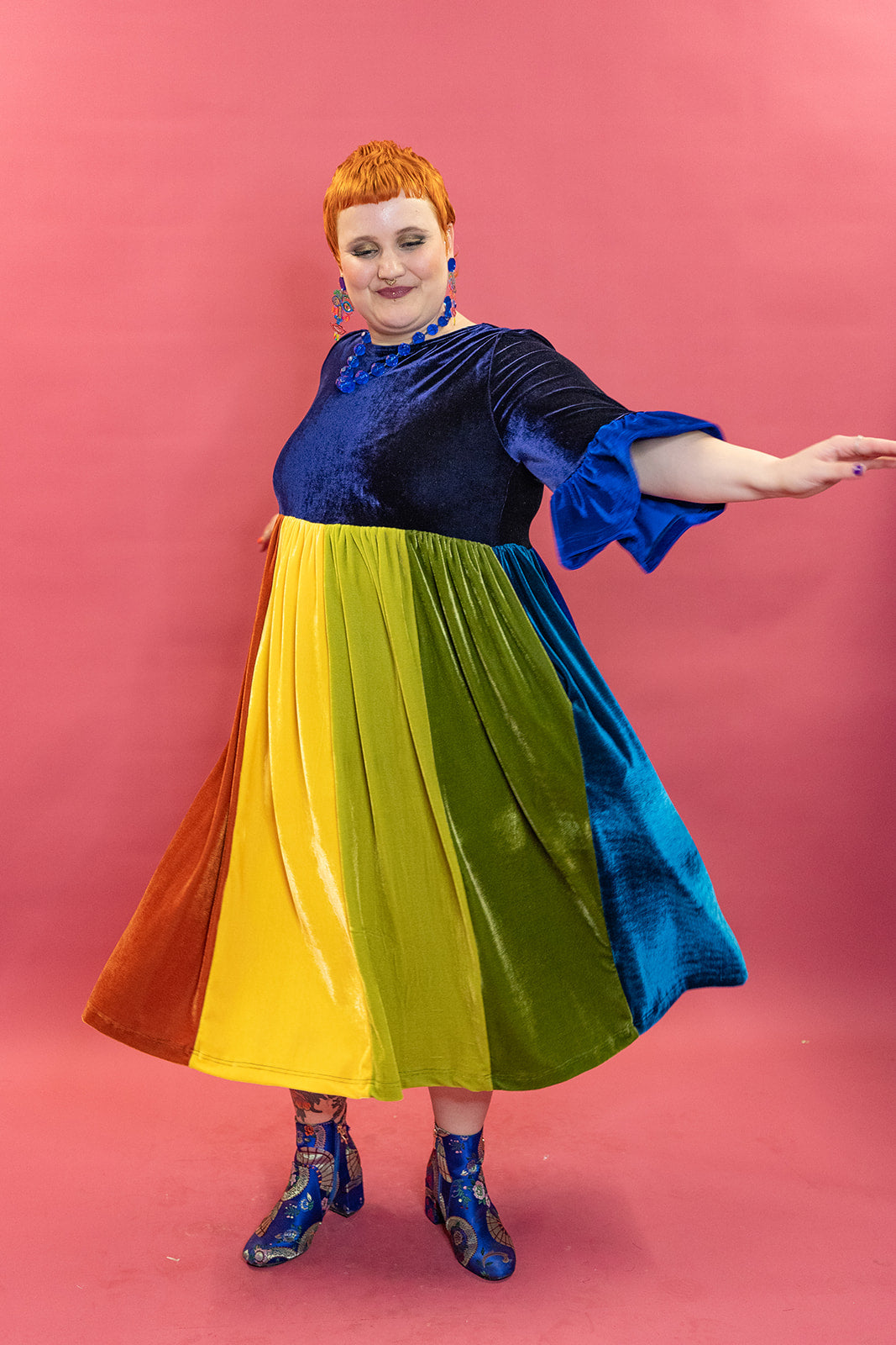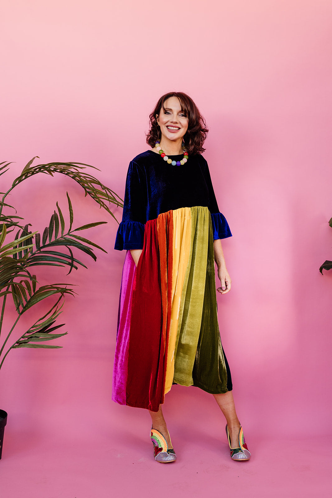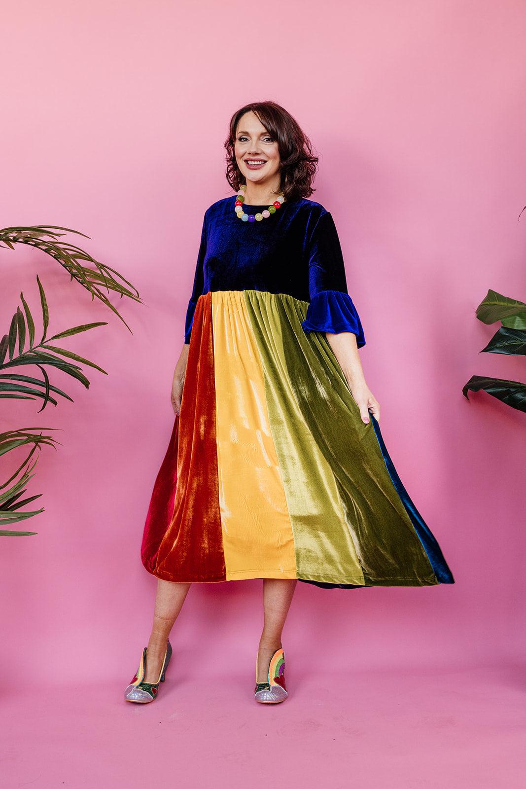 Handmade smock dress with a statement ruffle sleeve in luxurious velvet. Dress to impress as we transition through the seasons in comfort and style. In our signature zero waste patchwork this is a feel good dress in every way!
