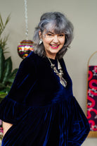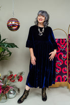 Handmade smock dress with a statement ruffle sleeve in luxurious midnight purple velvet. Dress to impress as we transition through the seasons in comfort and style.