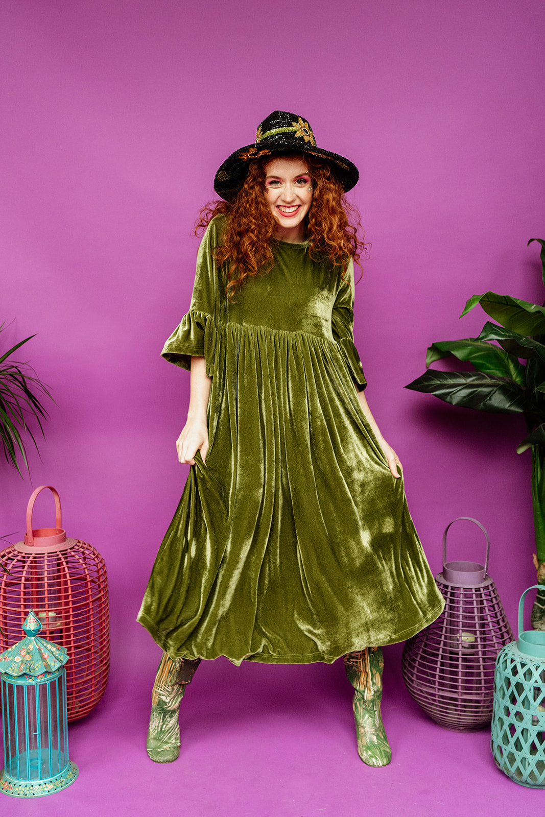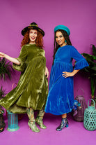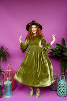 Handmade smock dress with a statement ruffle sleeve in luxurious olive green velvet. Dress to impress as we transition through the seasons in comfort and style.