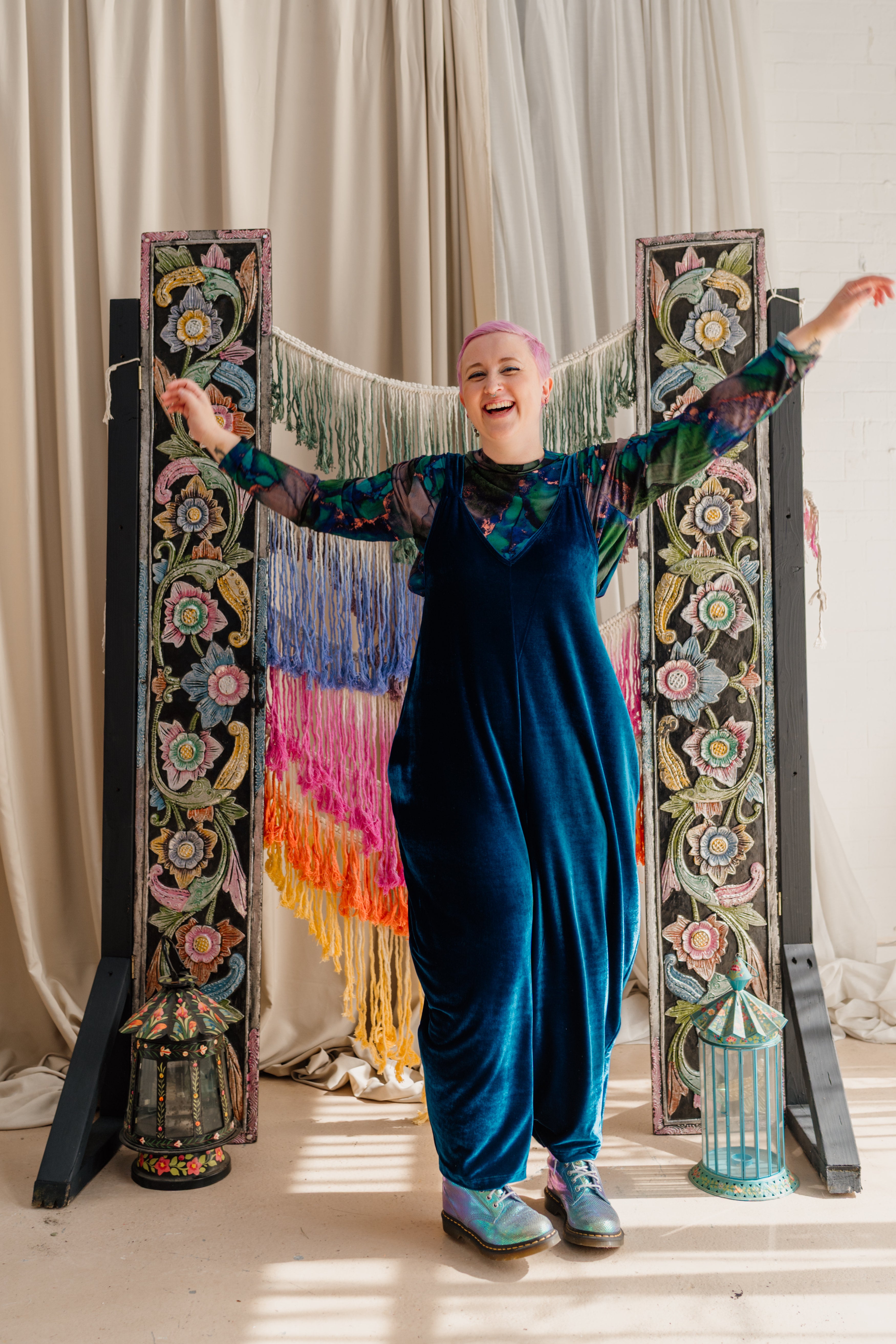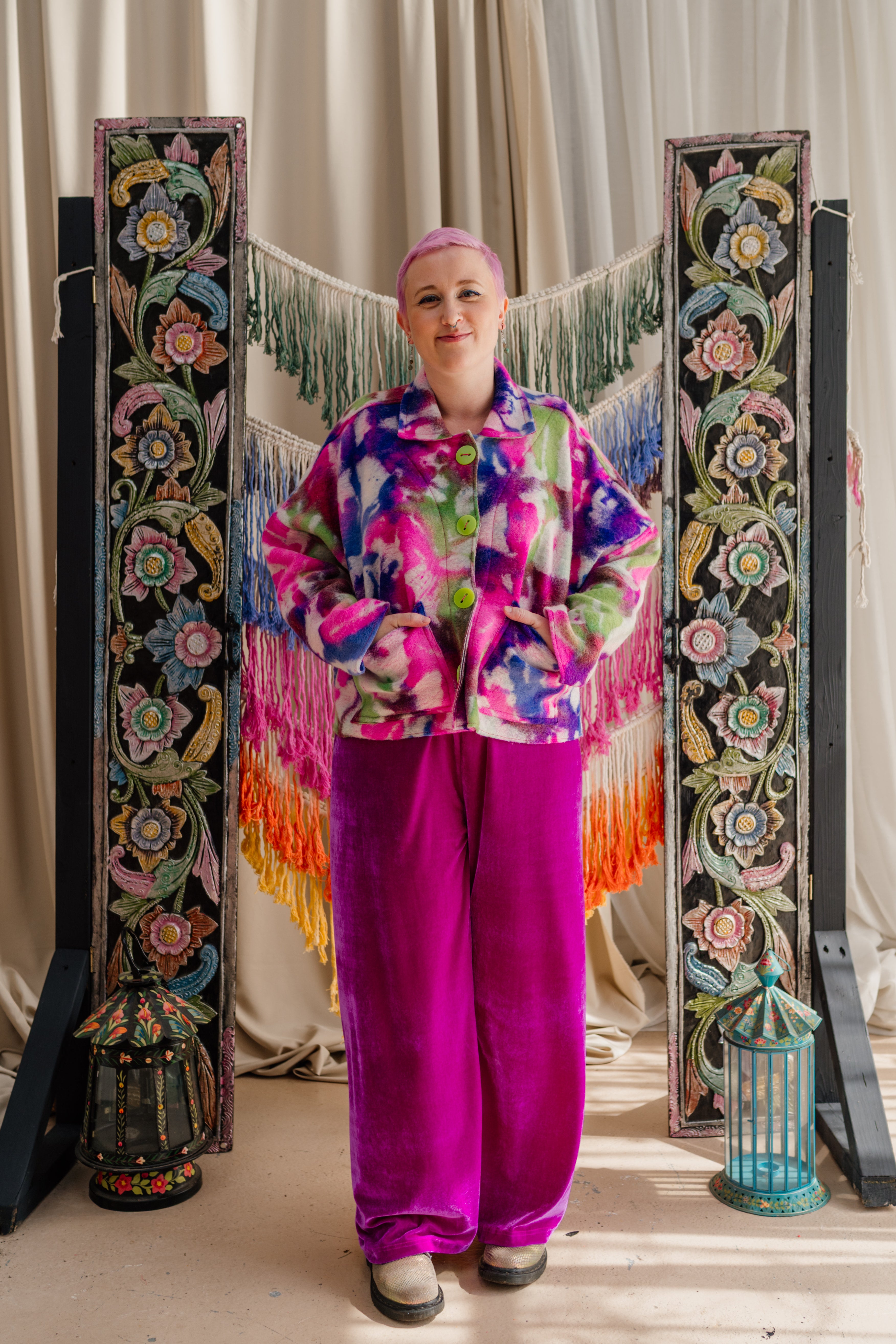 Colour filled slow fashion handmade in Megan’s Nottingham studio. Every piece is designed, cut, sewn and finished from hand selected materials. The range varies from accessories such as bestselling Velvet Wrist Warmers to larger bespoke pieces like Hand Embellished Boiled Wool Coats. For 20 years Megan has been making beautiful garments encompassing a multitude of textile processes in an array of colours and prints. Our 3 cornerstones are: