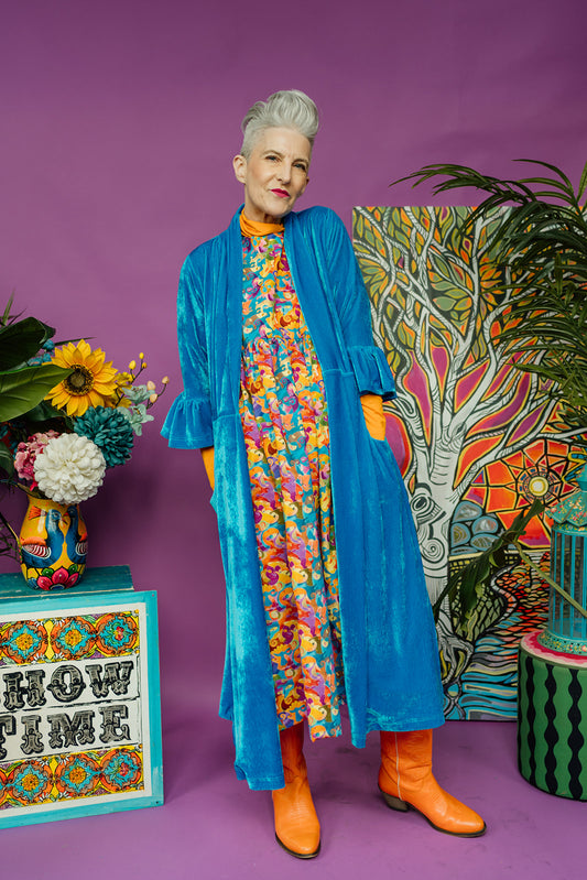 Velvet Ruffle Maxi Cardigan in Turquoise
