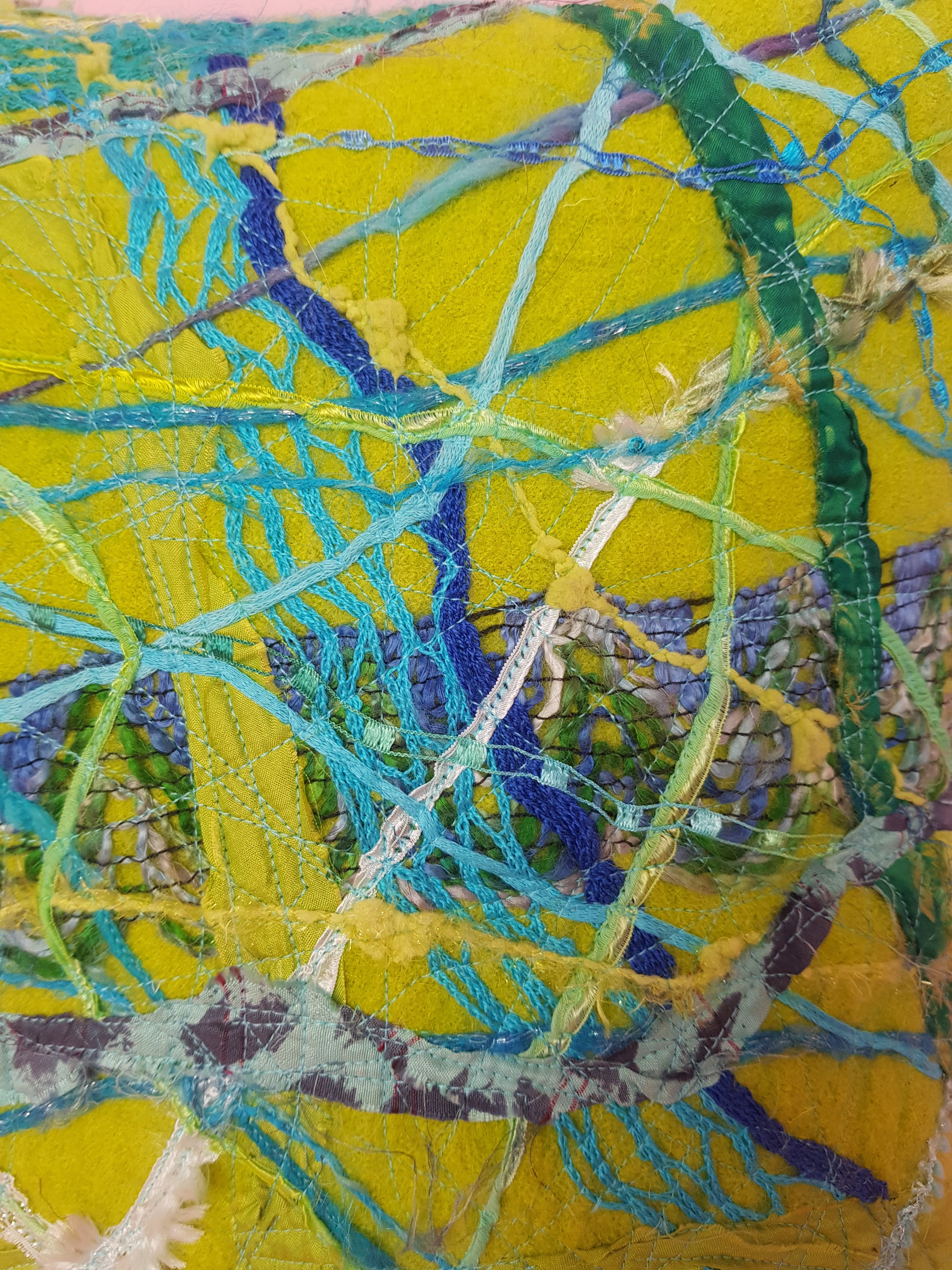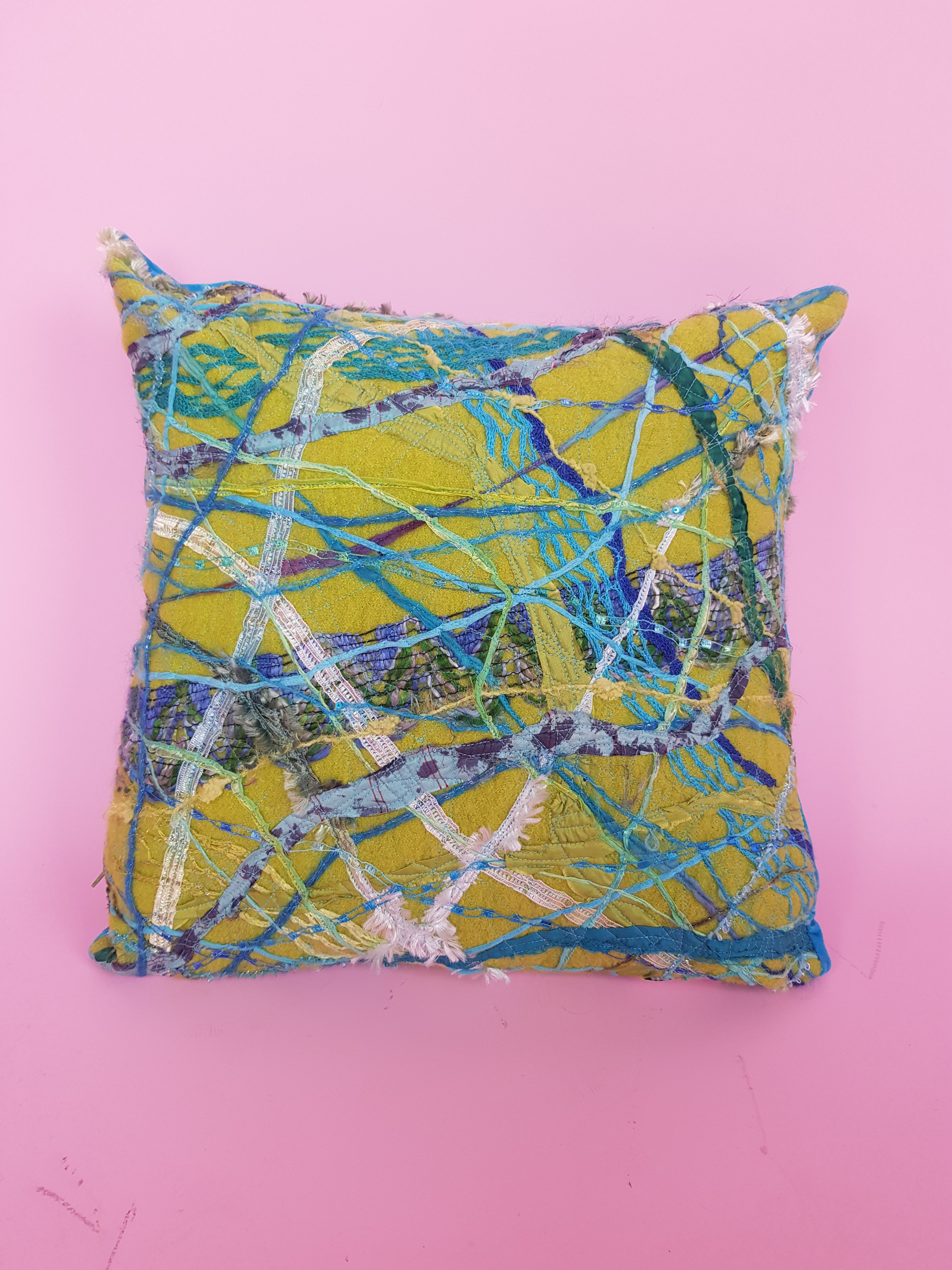 Medium square cushion in boiled wool with matching velvet on reverse. Front features embellishment made using machine embroidery and mixed materials on boiled wool. Zip closure. Pillow insert not included.