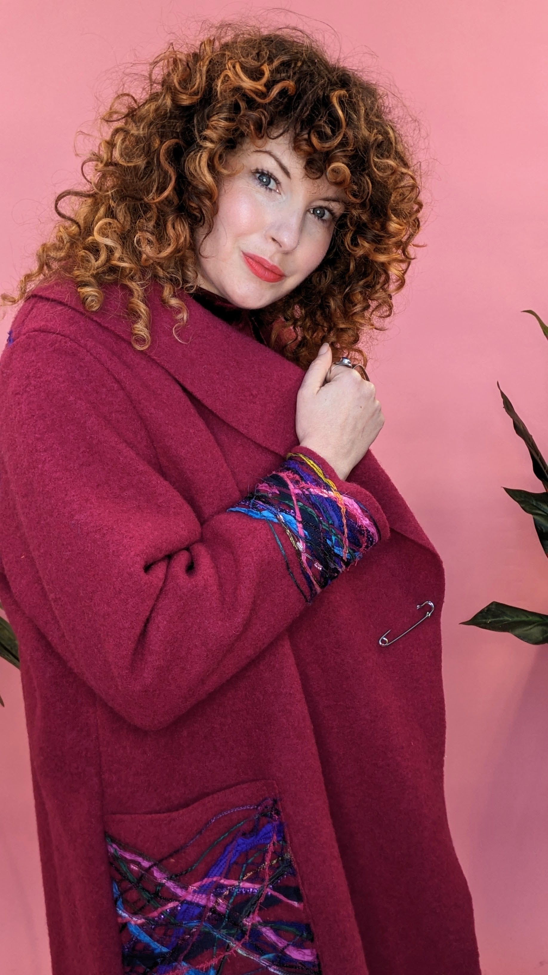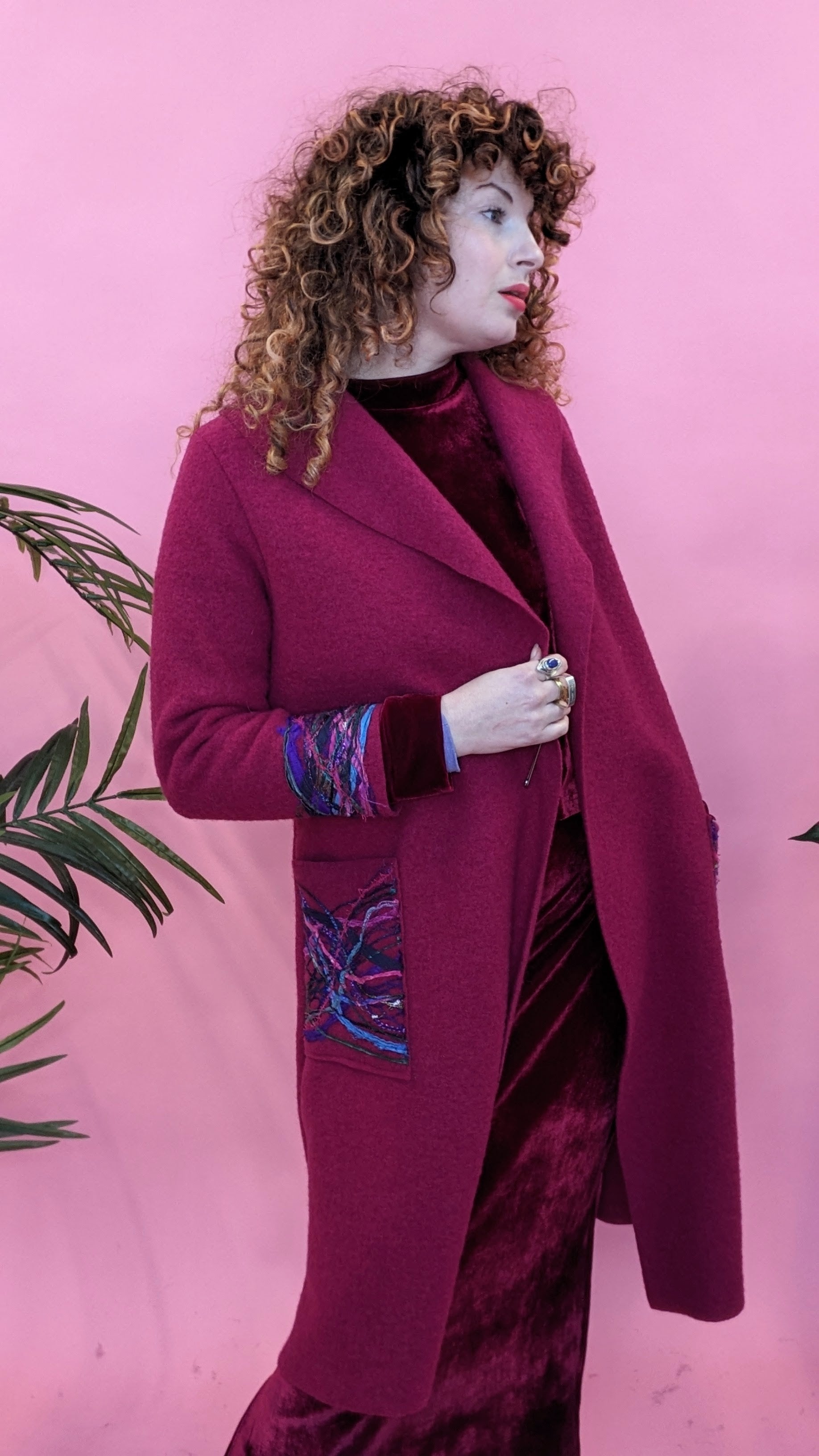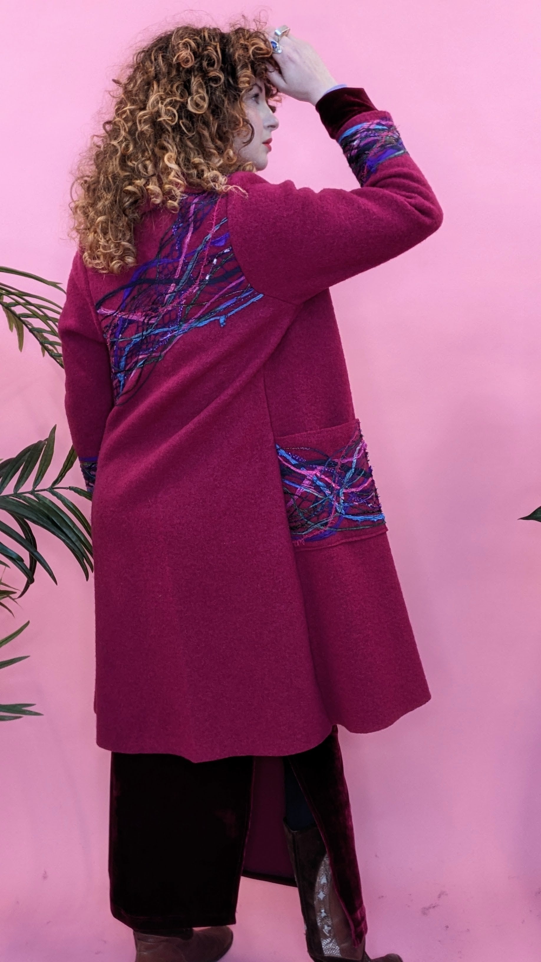 Beautifully embellished long wool coat in cherry. Finished with a striking yarn embellishment across back, cuffs and pockets. Think of it like painting with textiles, each strand is considerately placed to create a wearable work of art.