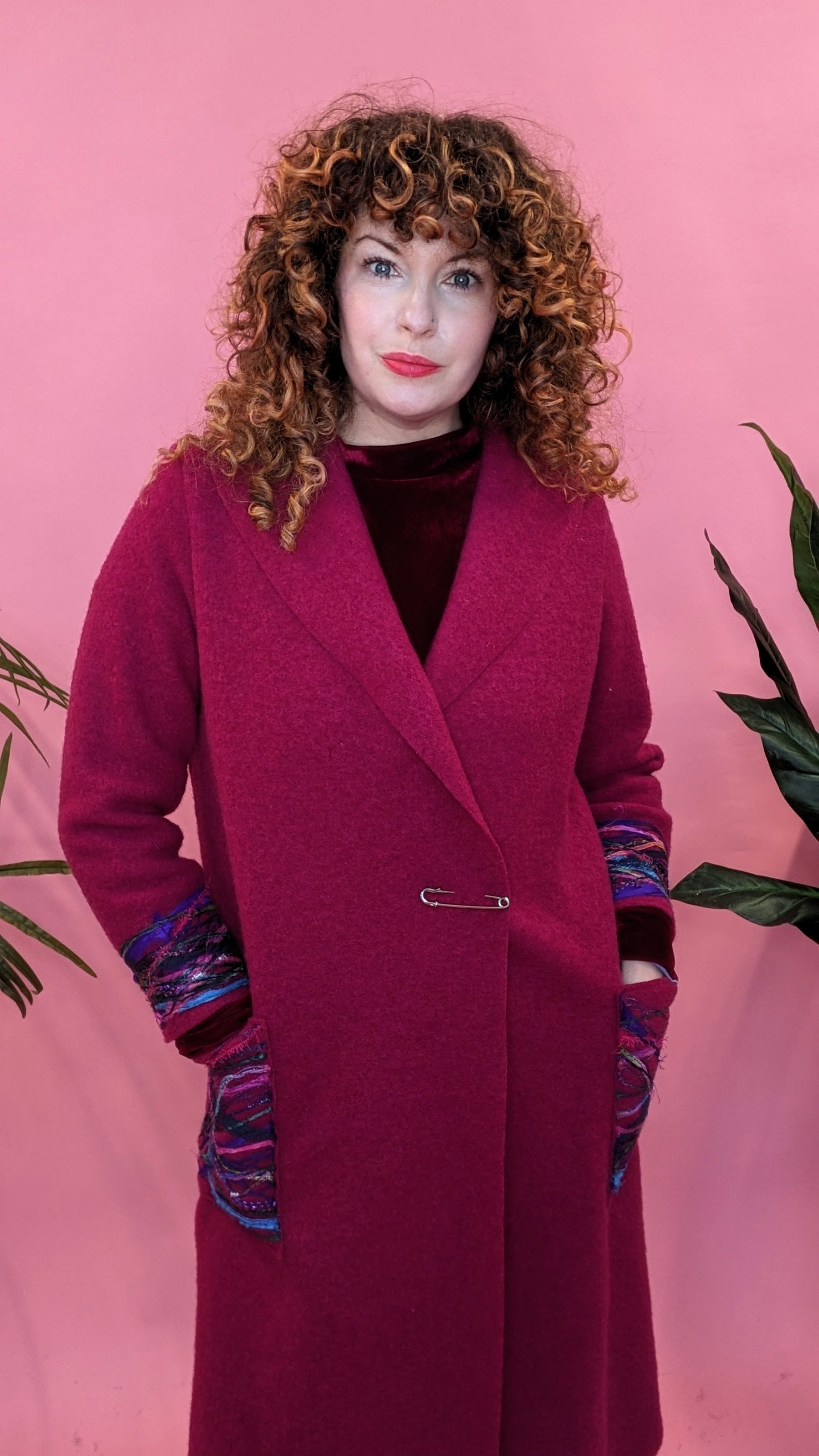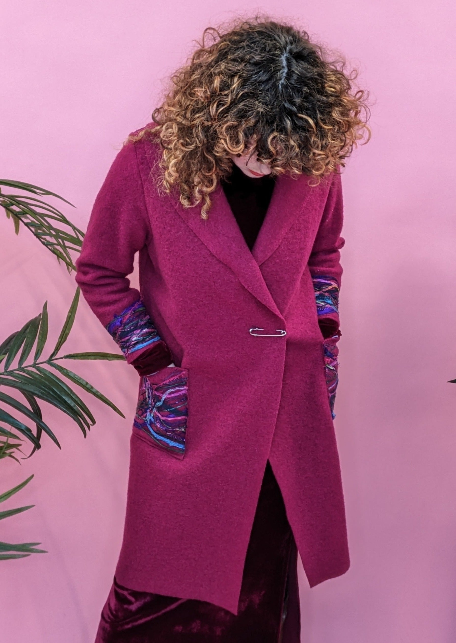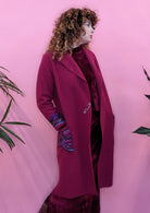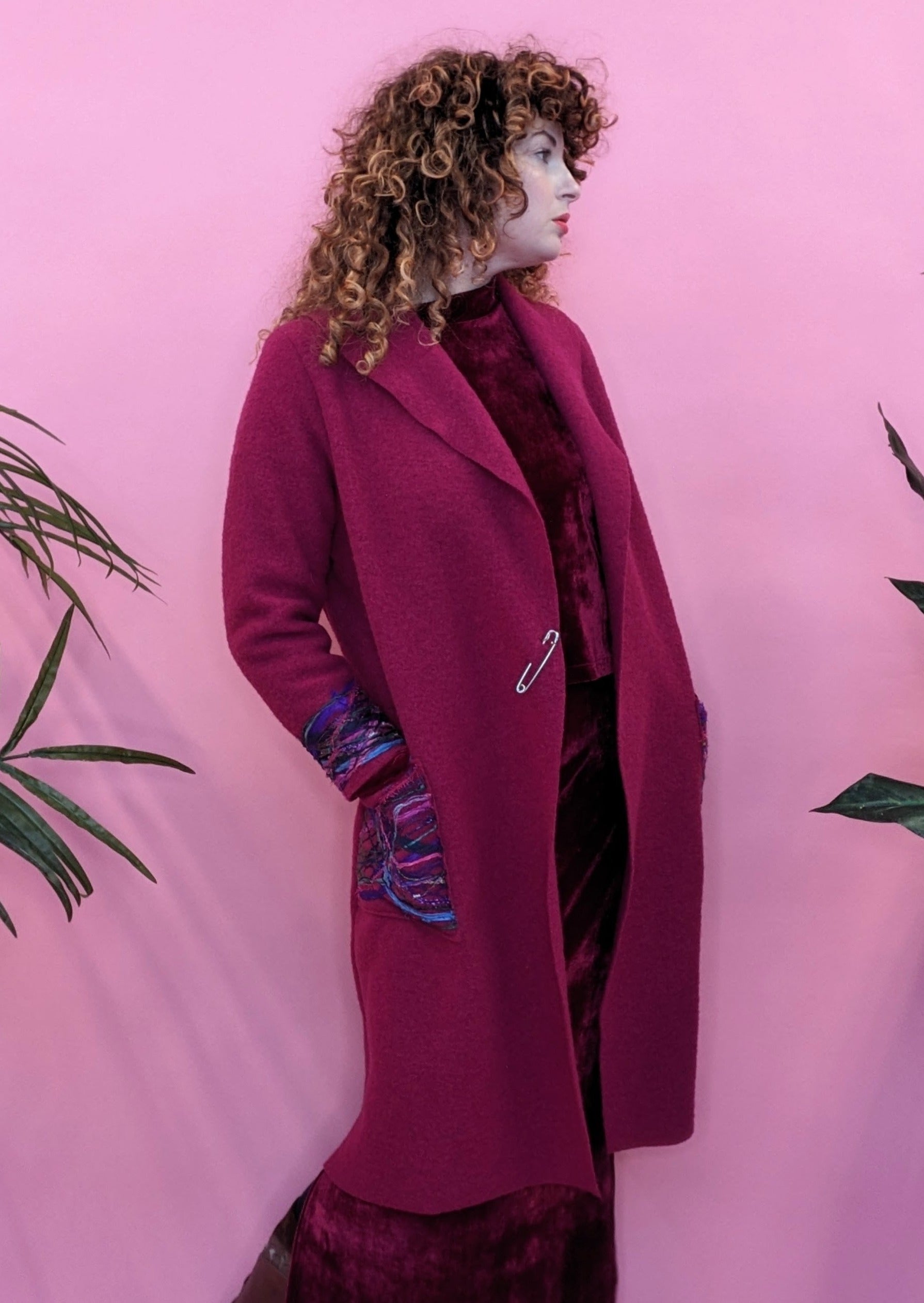 Beautifully embellished long wool coat in cherry. Finished with a striking yarn embellishment across back, cuffs and pockets. Think of it like painting with textiles, each strand is considerately placed to create a wearable work of art.