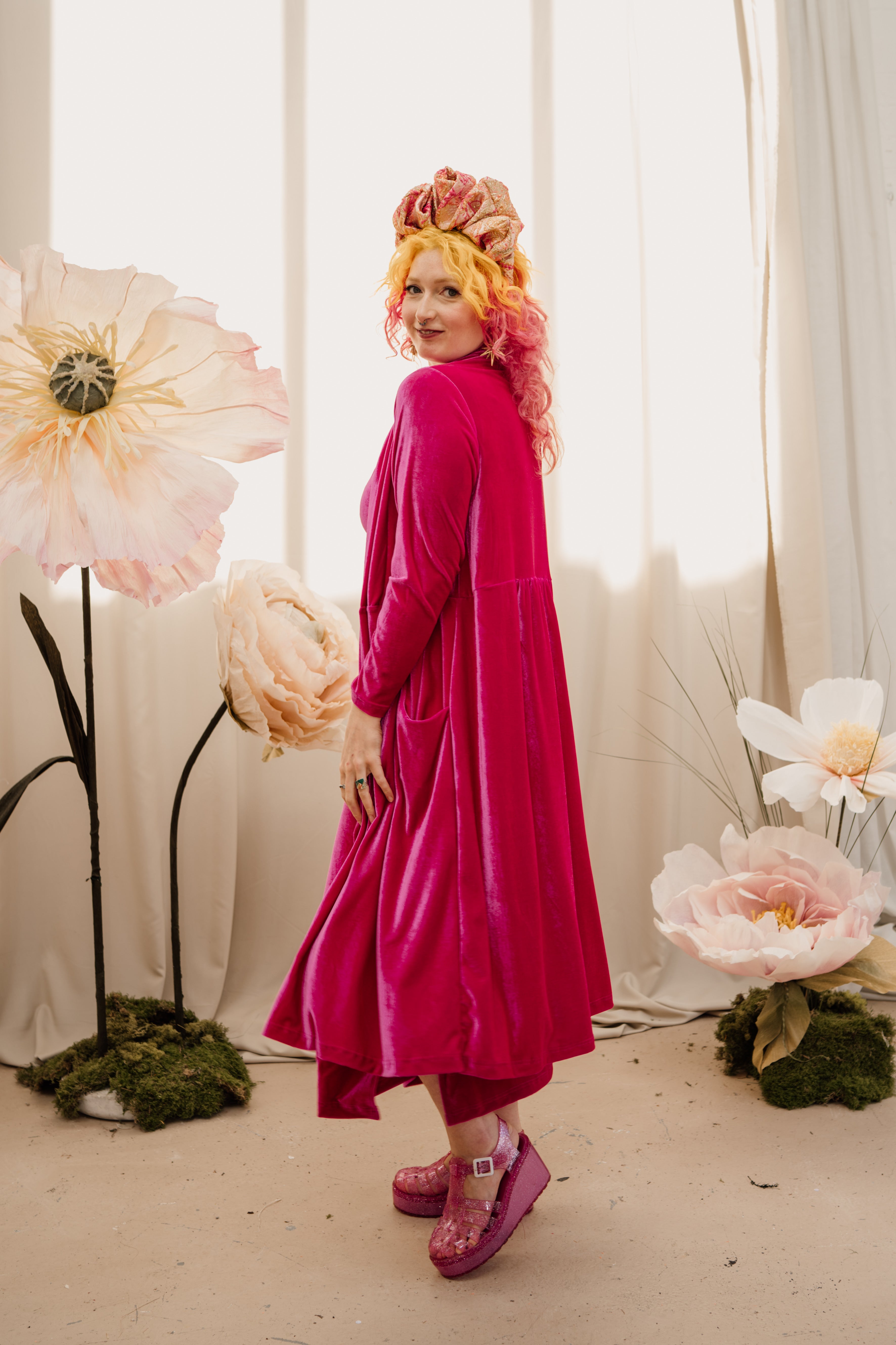 Handmade long-line duster length cardigan in the most luxurious velvet. This is the perfect topper for layering up and a showstopper for a special occasion!