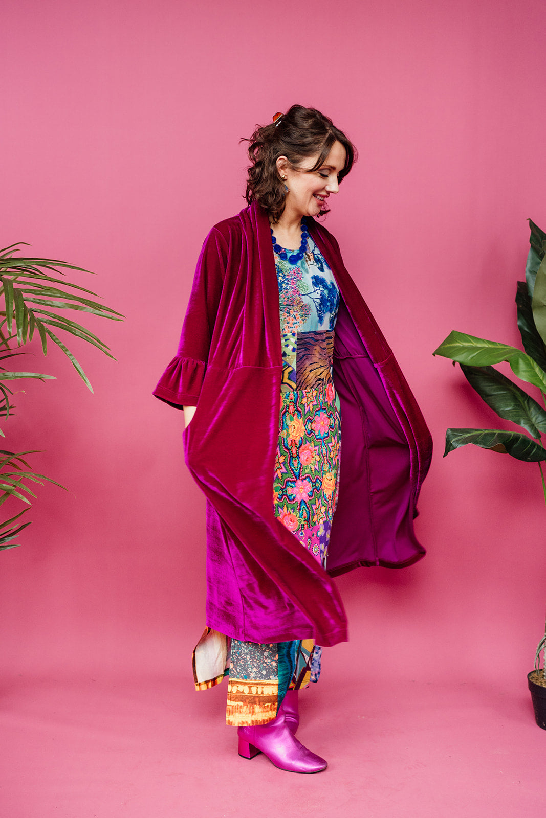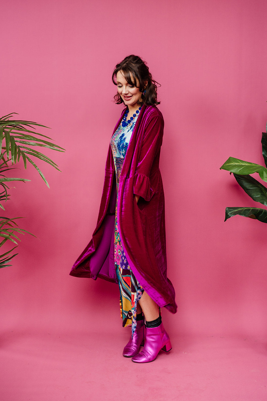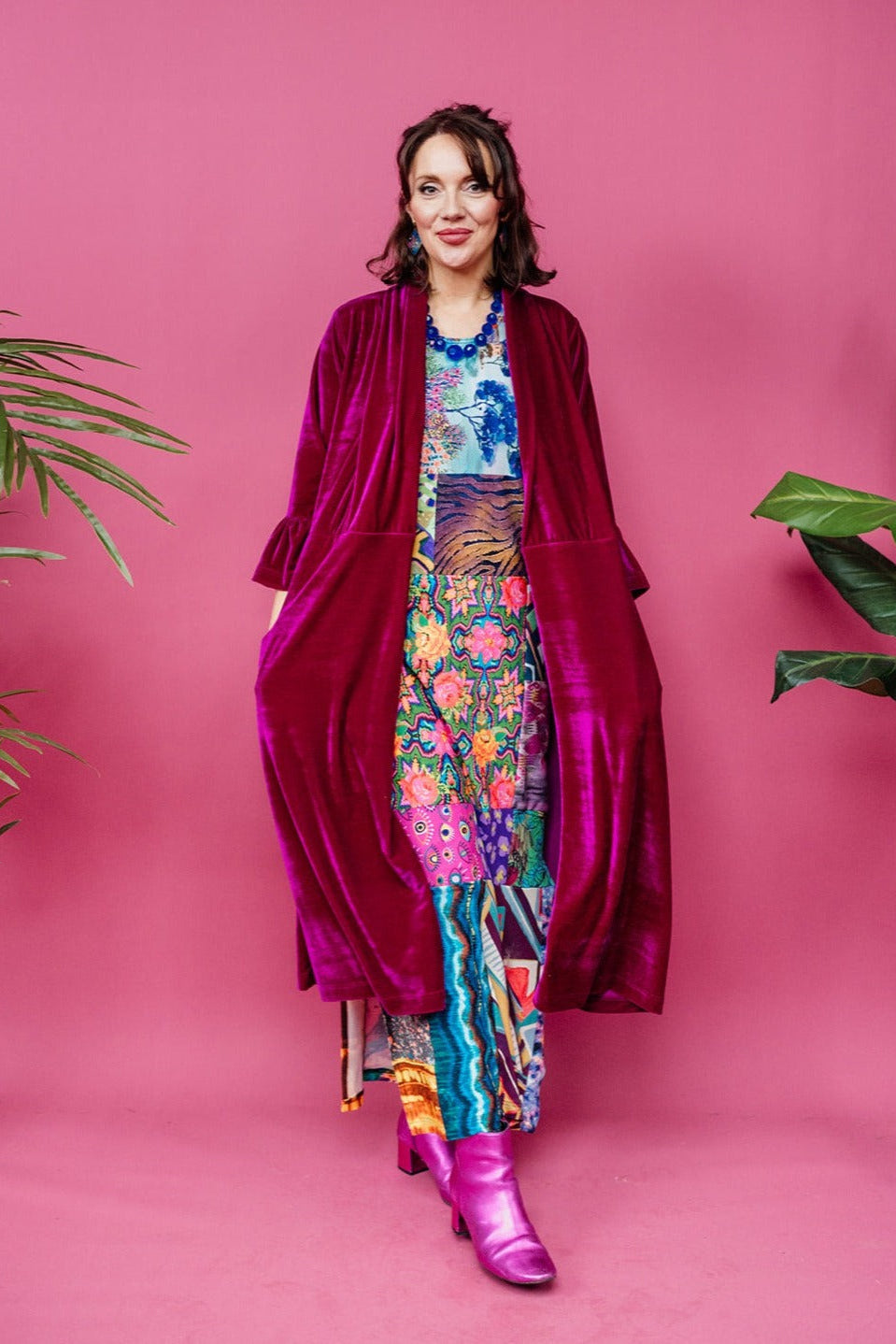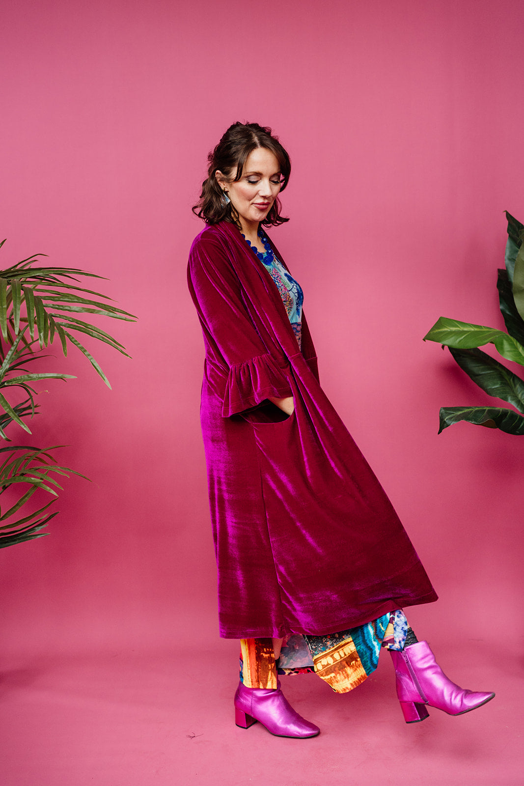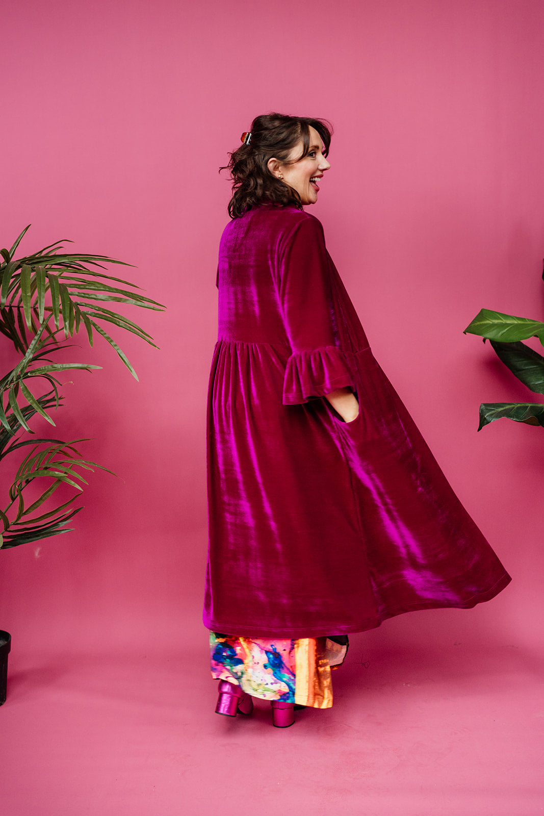 Handmade long-line duster length cardigan in the most luxurious velvet featuring the cutest ruffle 3/4 length sleeves! This is the perfect topper for autumnal layering.