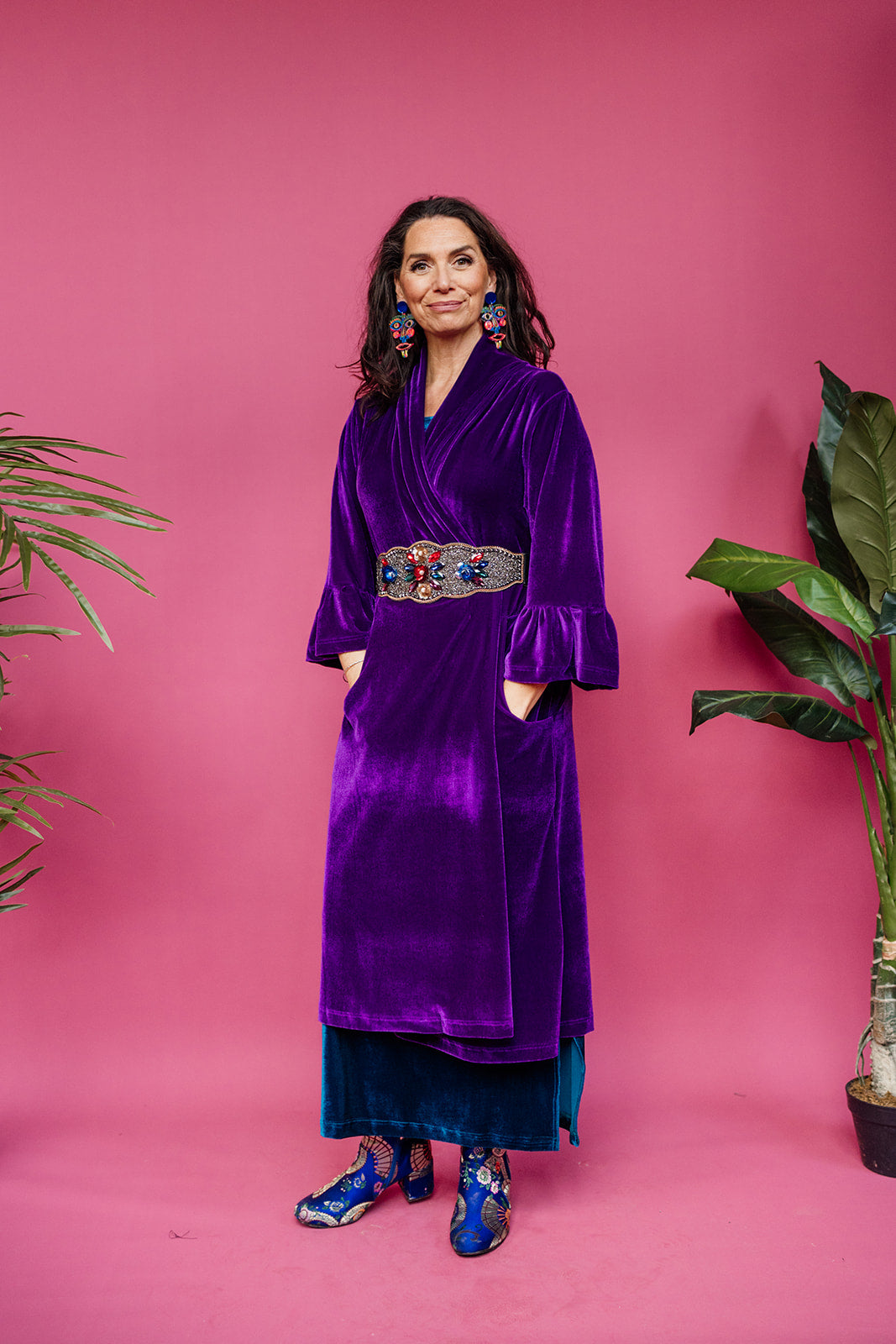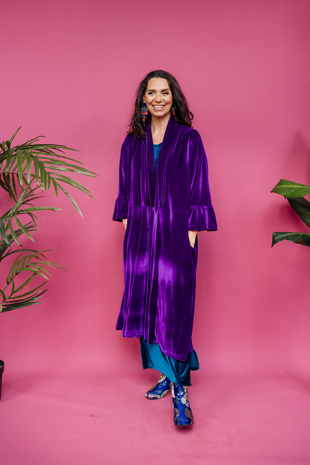 Handmade long-line duster length cardigan in the most luxurious velvet featuring the cutest ruffle 3/4 length sleeves! This is the perfect topper for autumnal layering.