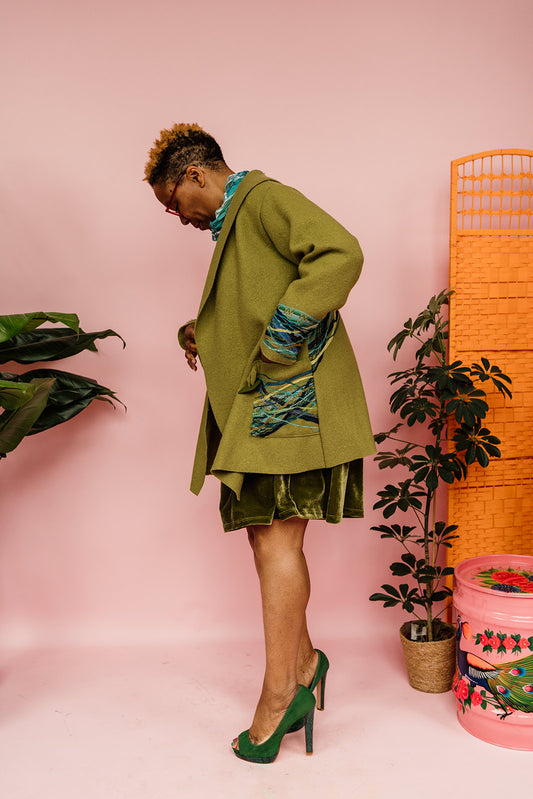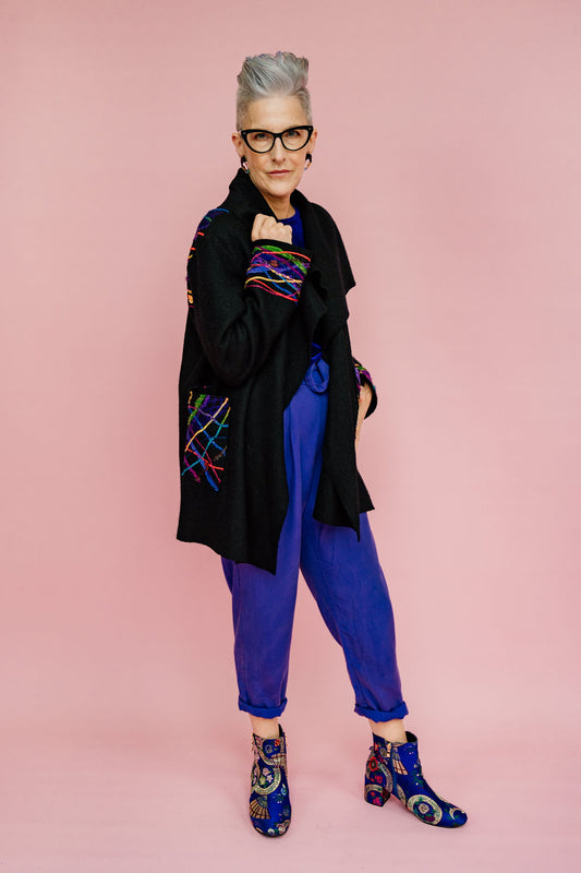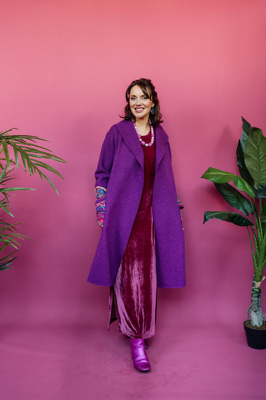 Embellished Long Wool Coat in Berry - Rainbow Embellishment
