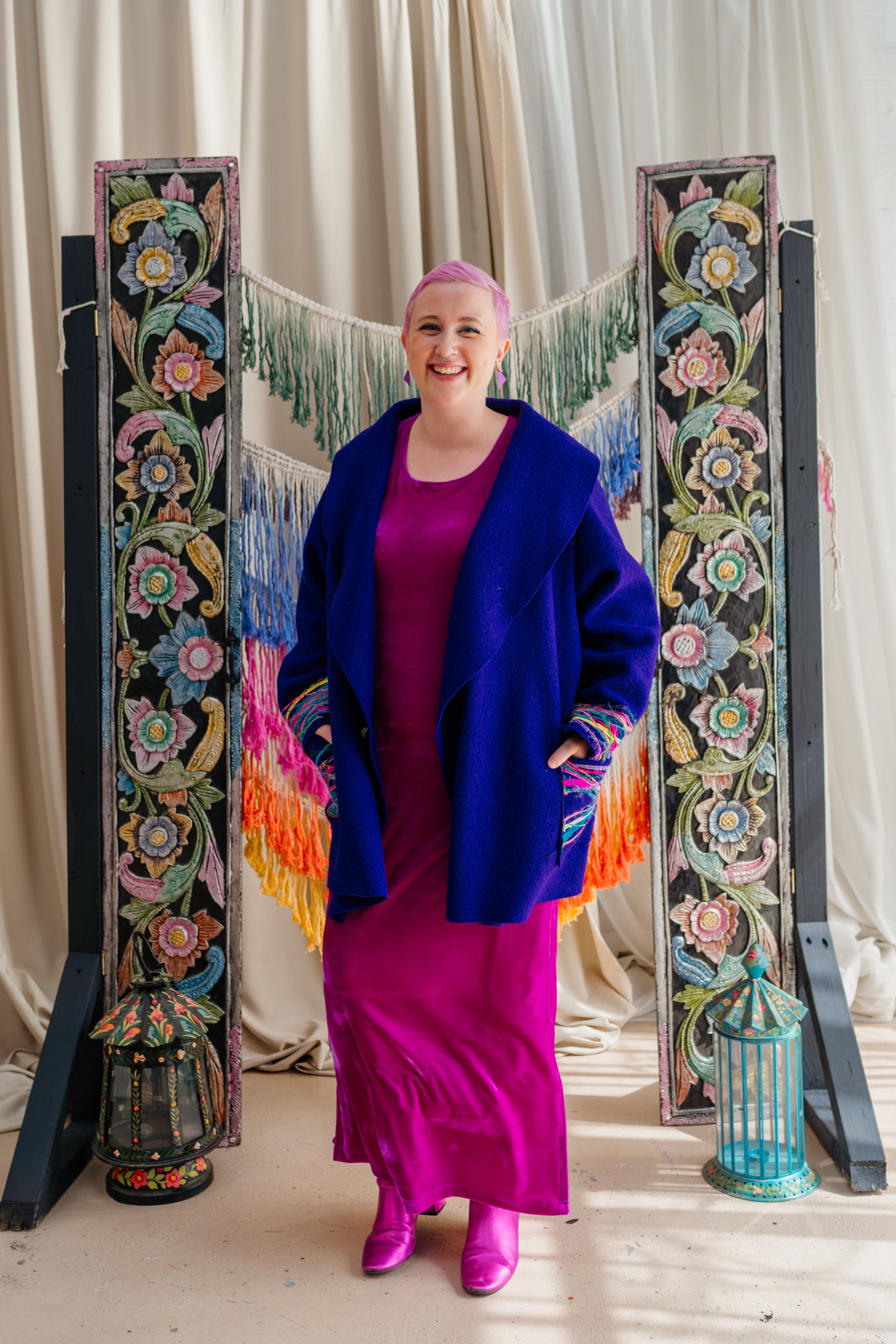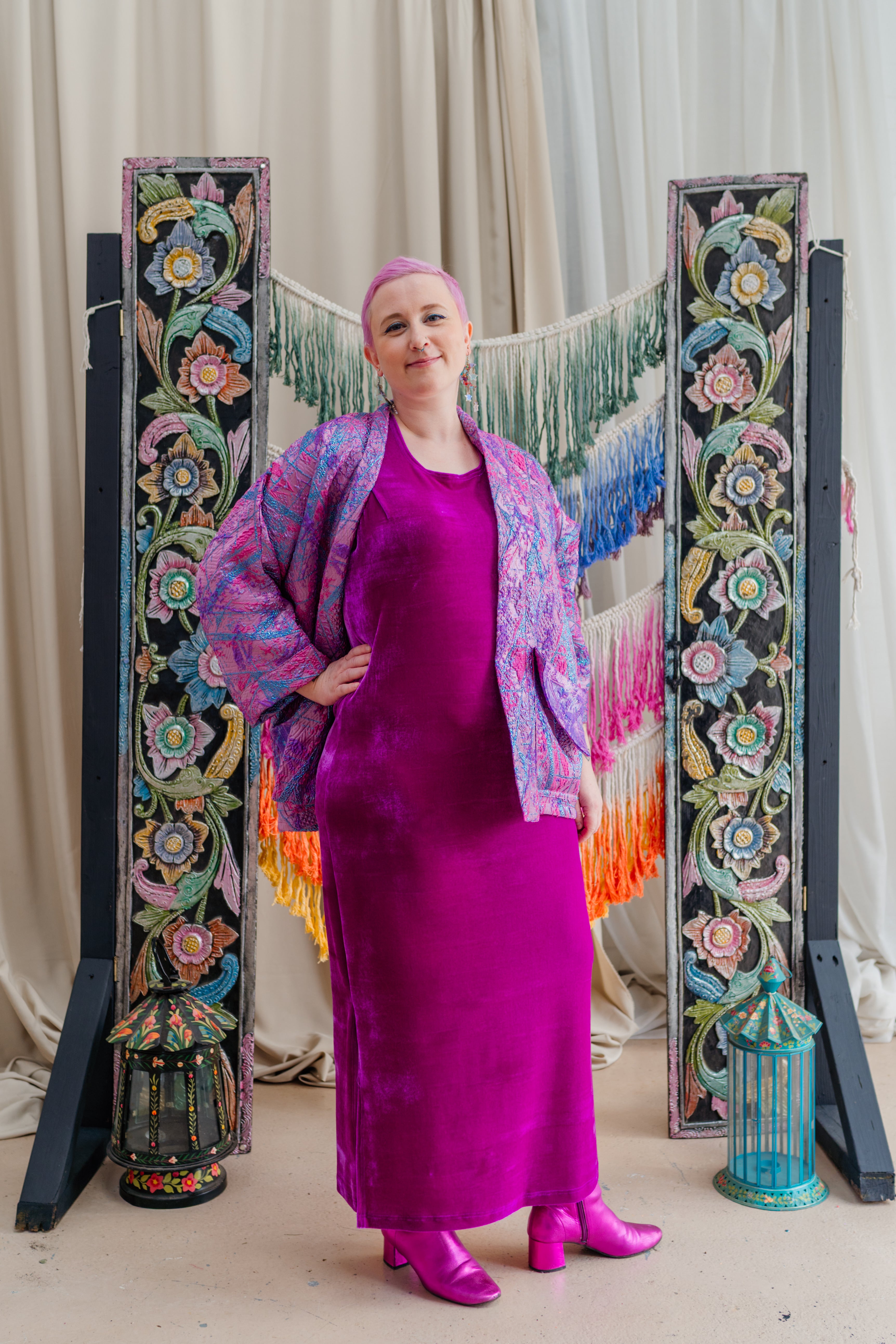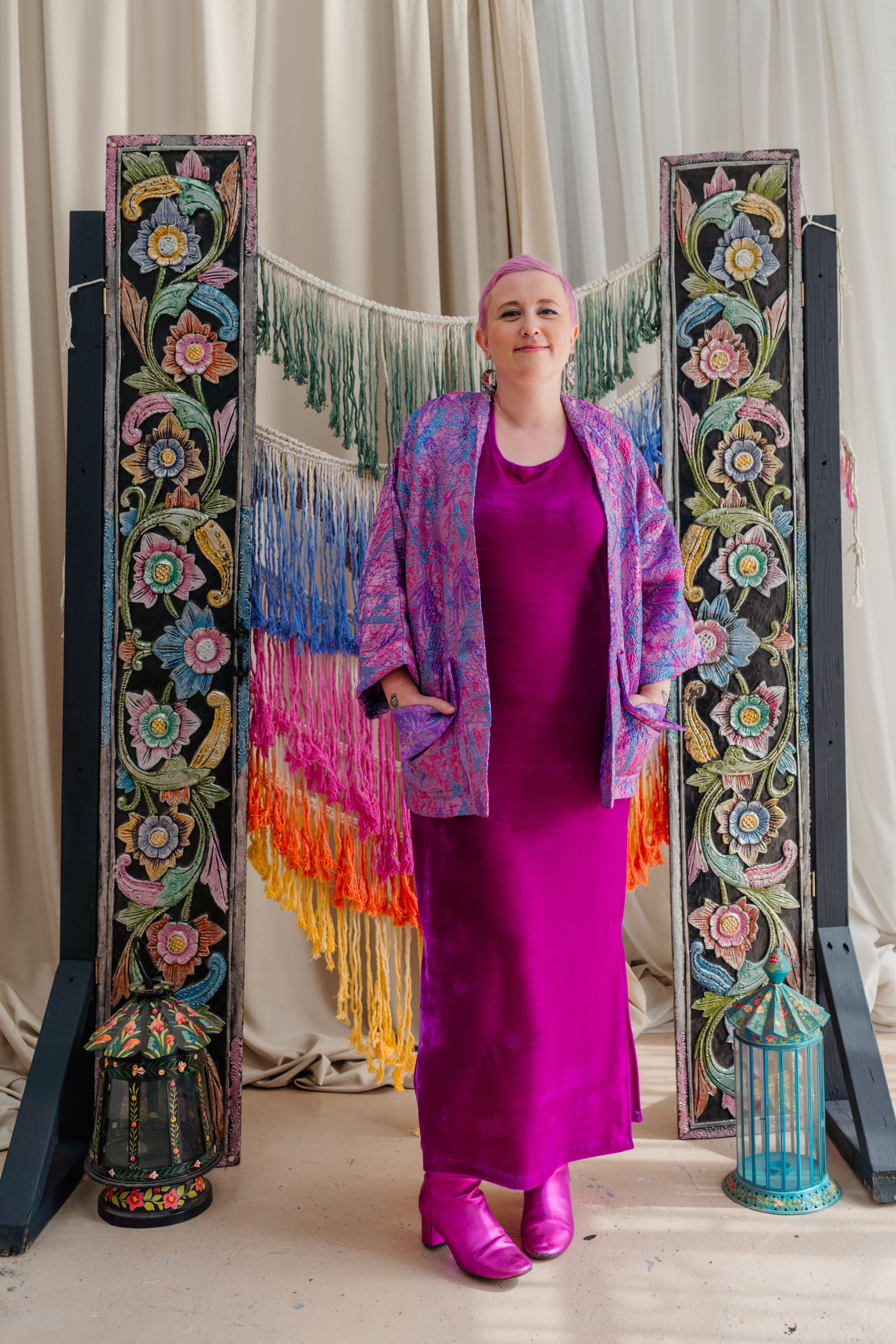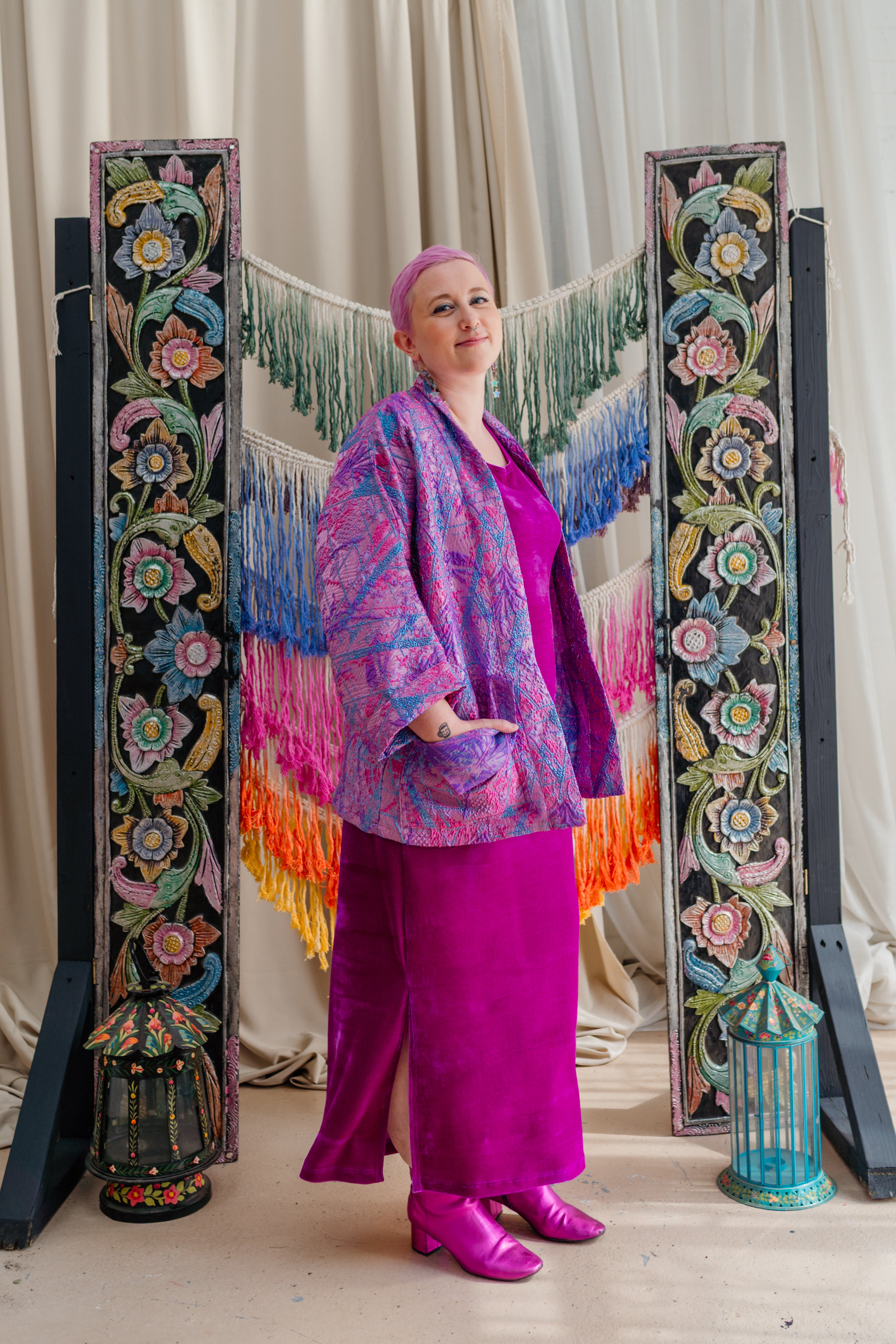 Colour filled slow fashion handmade in Megan’s Nottingham studio. Every piece is designed, cut, sewn and finished from hand selected materials. The range varies from accessories such as bestselling Velvet Wrist Warmers to larger bespoke pieces like Hand Embellished Boiled Wool Coats. For 20 years Megan has  been making beautiful garments encompassing a multitude of textile processes in an array of colours and prints. Our 3 cornerstones are: