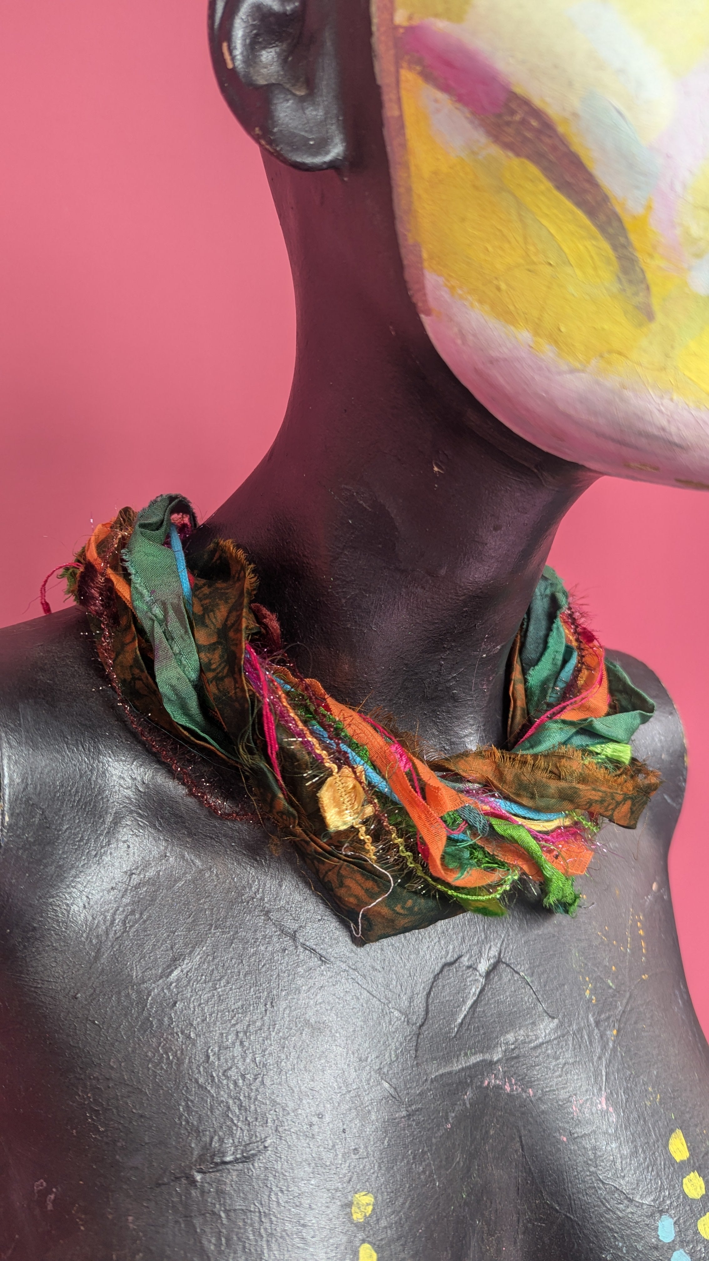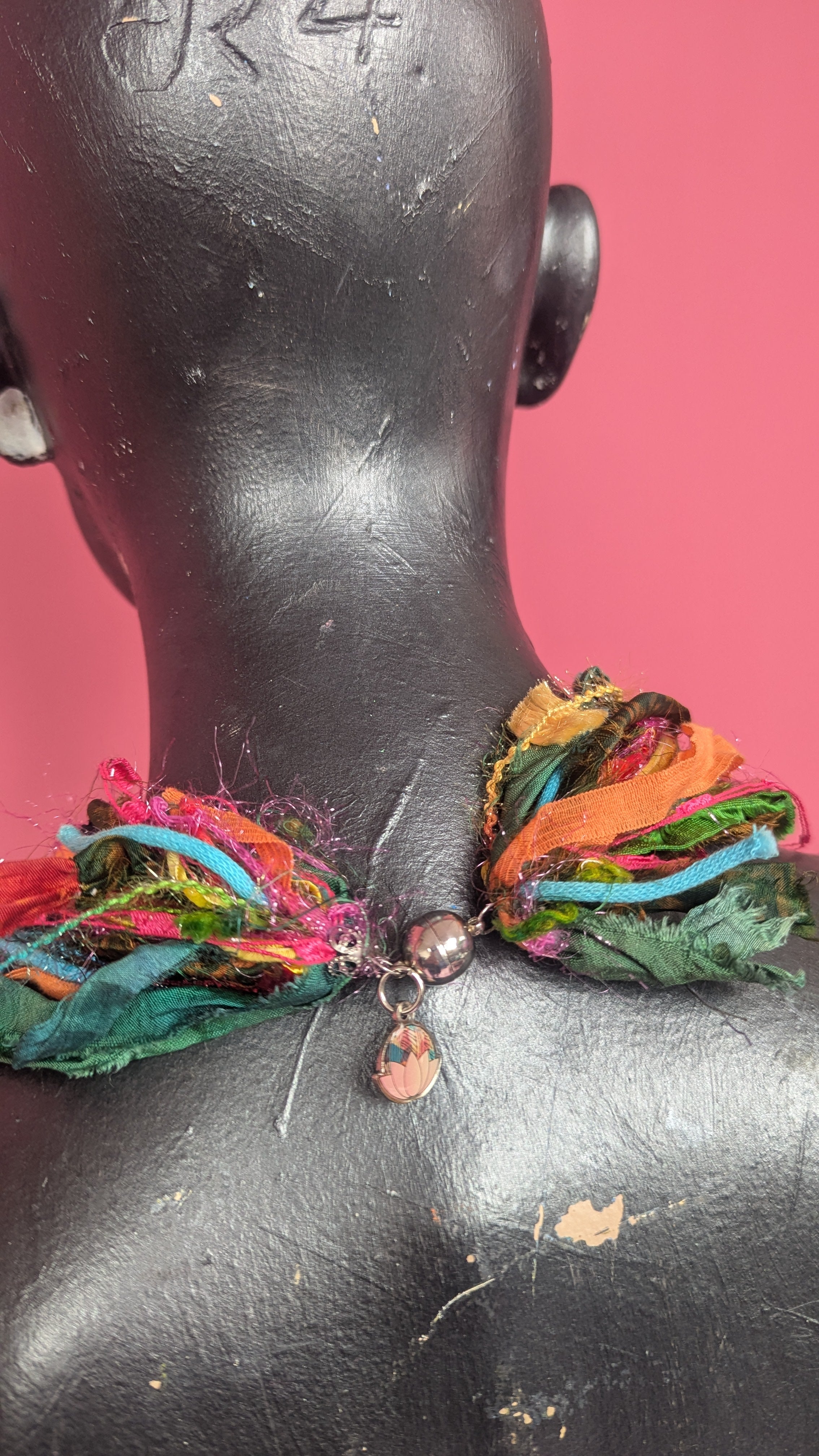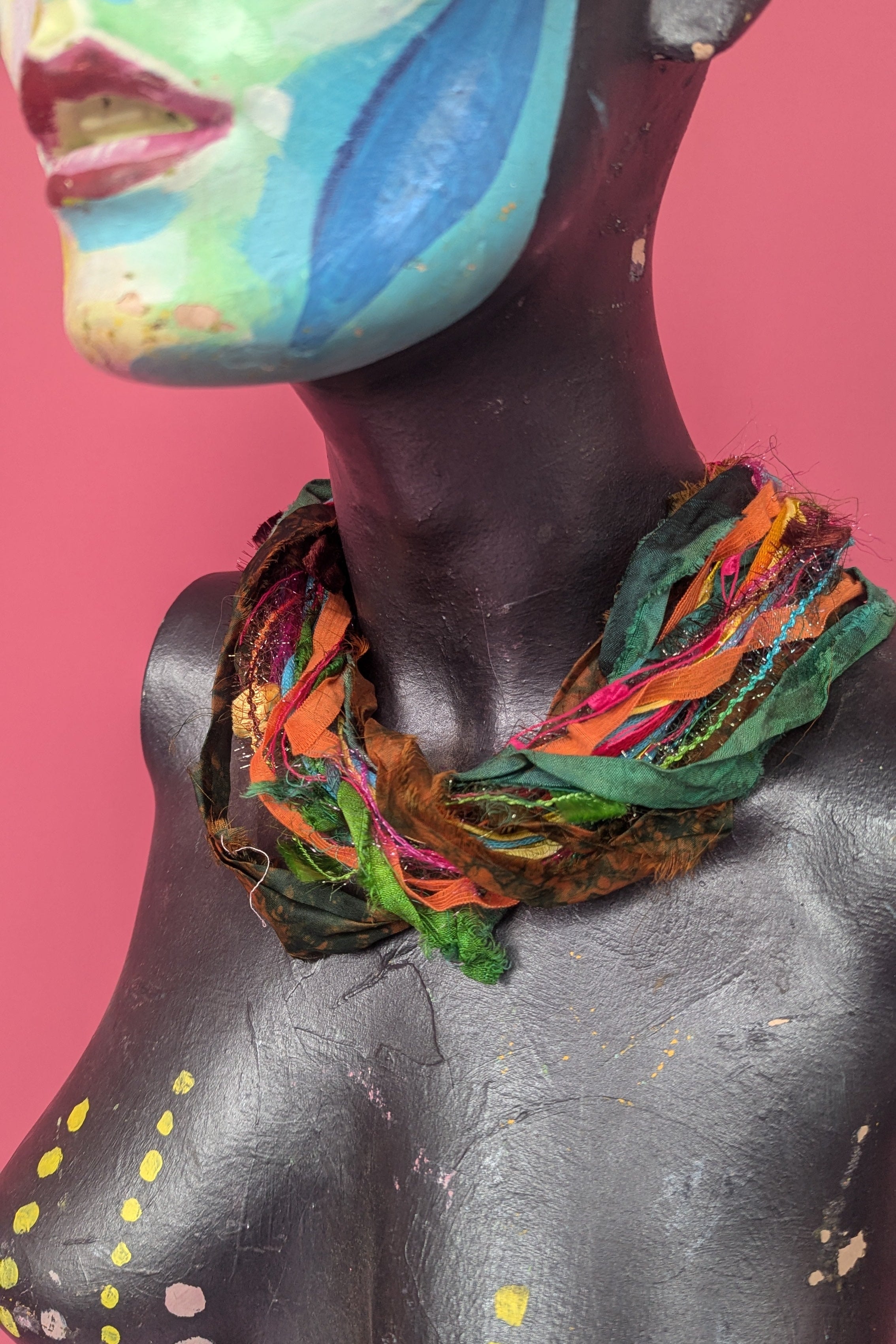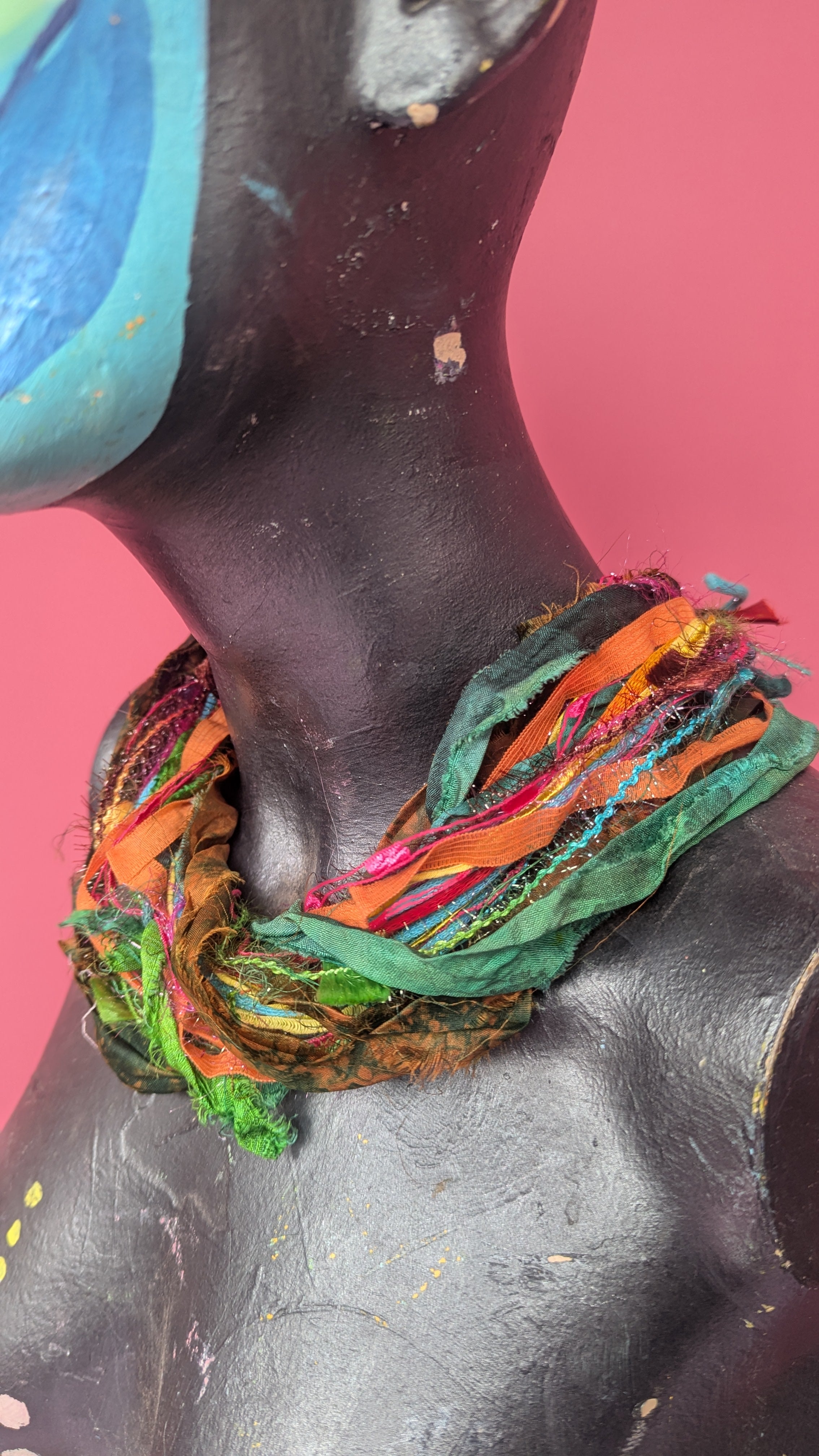 Multi strand, silk yarn necklace with magnetic clap. Features over twenty strands of various novelty yarns. Torn sari silks and hand painted polyamide are often used. Over 30 colourways available and updated regularly. Each necklace is unique and may not include every material pictured but will follow the same colour theme. Please contact us directly for custom or alternative colour options.