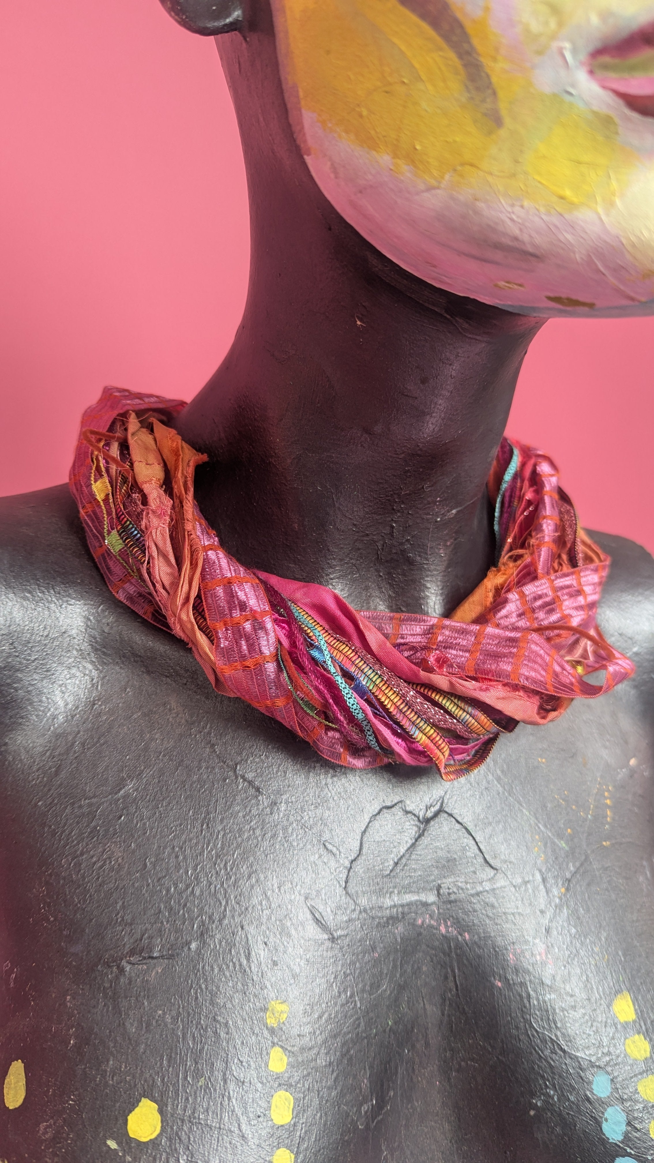 Multi strand, silk yarn necklace with magnetic clap. Features over twenty strands of various novelty yarns. Torn sari silks and hand painted polyamide are often used. Over 30 colourways available and updated regularly.  Each necklace is unique and may not include every material pictured but will follow the same colour theme. Please contact us directly for custom or alternative colour options.