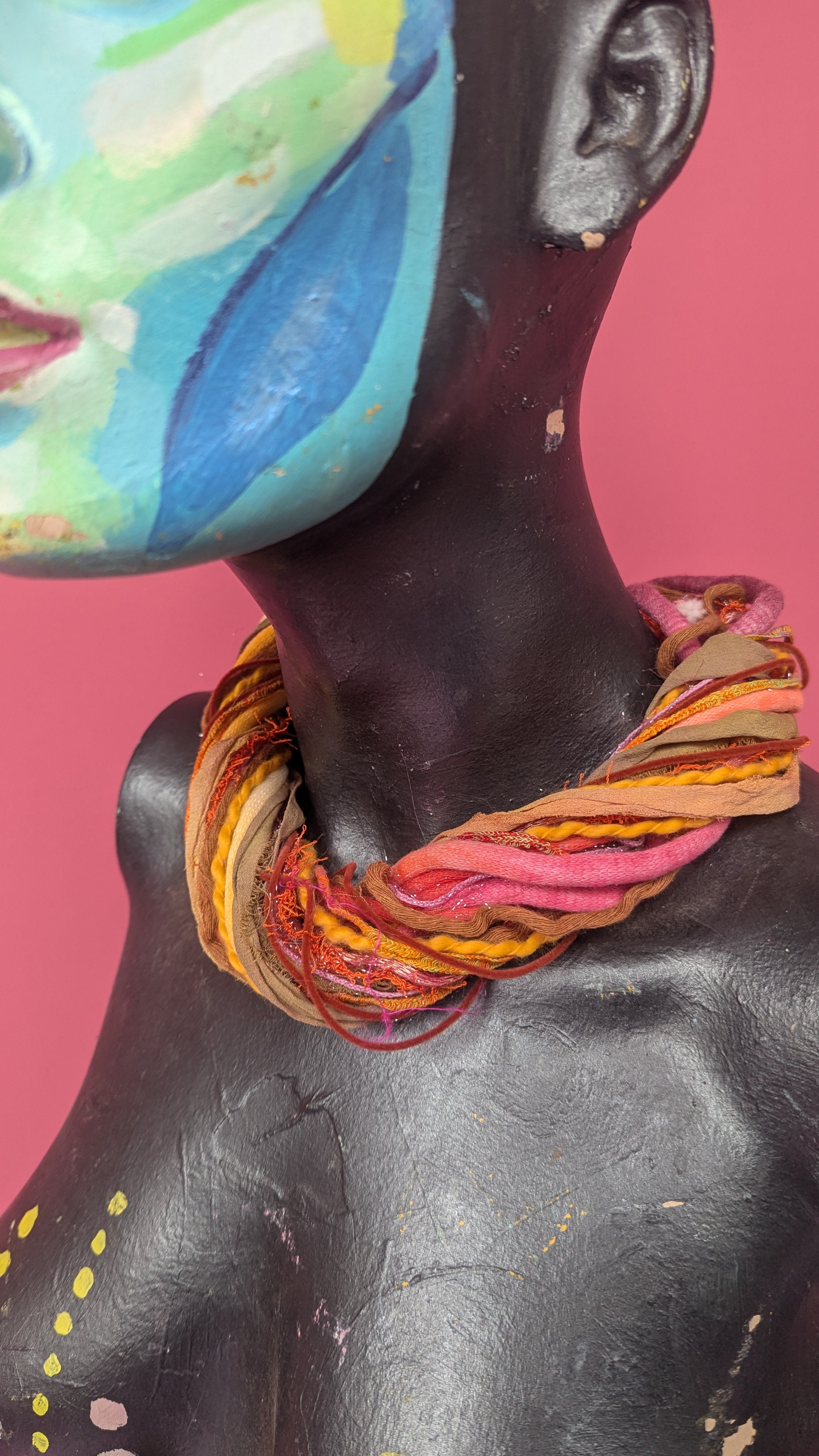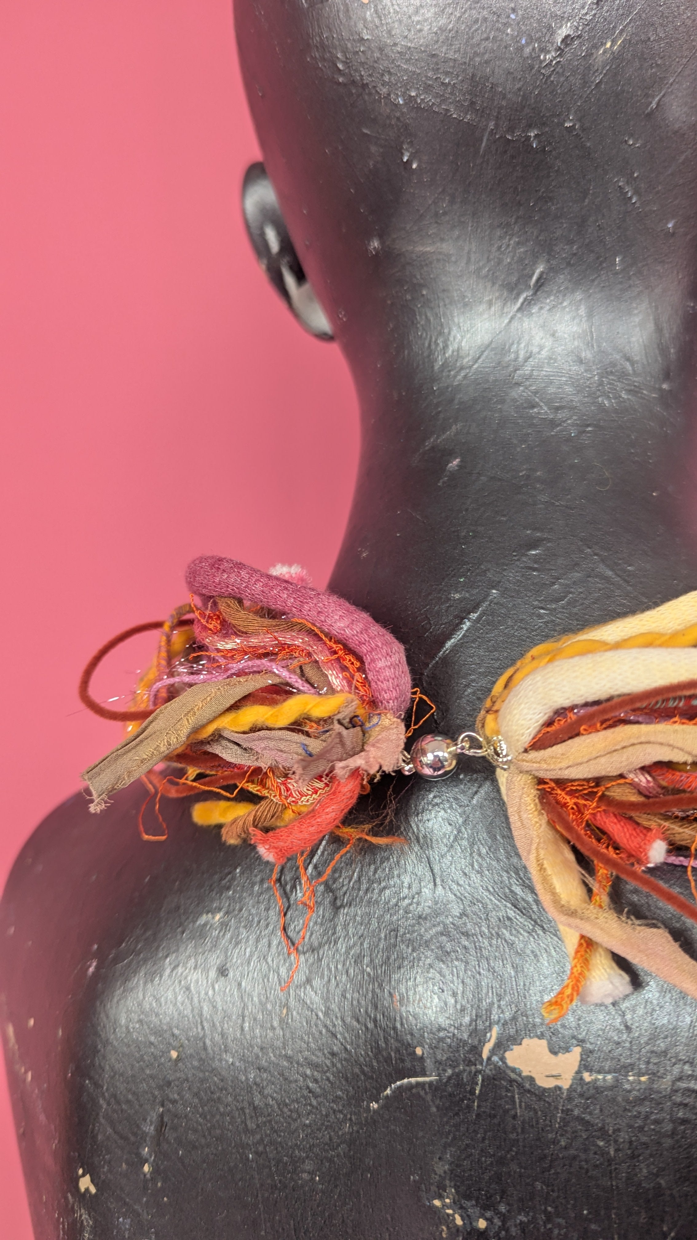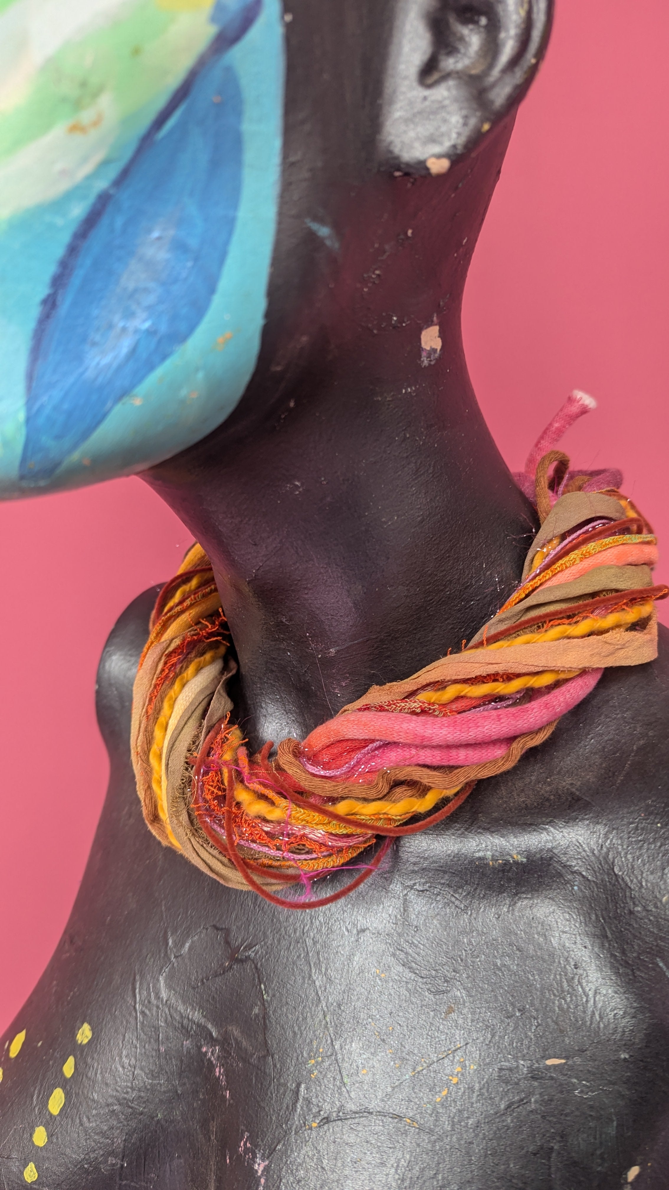 Multi strand, silk yarn necklace with magnetic clap. Features over twenty strands of various novelty yarns. Torn sari silks and hand painted polyamide are often used. Over 30 colourways available and updated regularly. Each necklace is unique and may not include every material pictured but will follow the same colour theme. Please contact us directly for custom or alternative colour options.