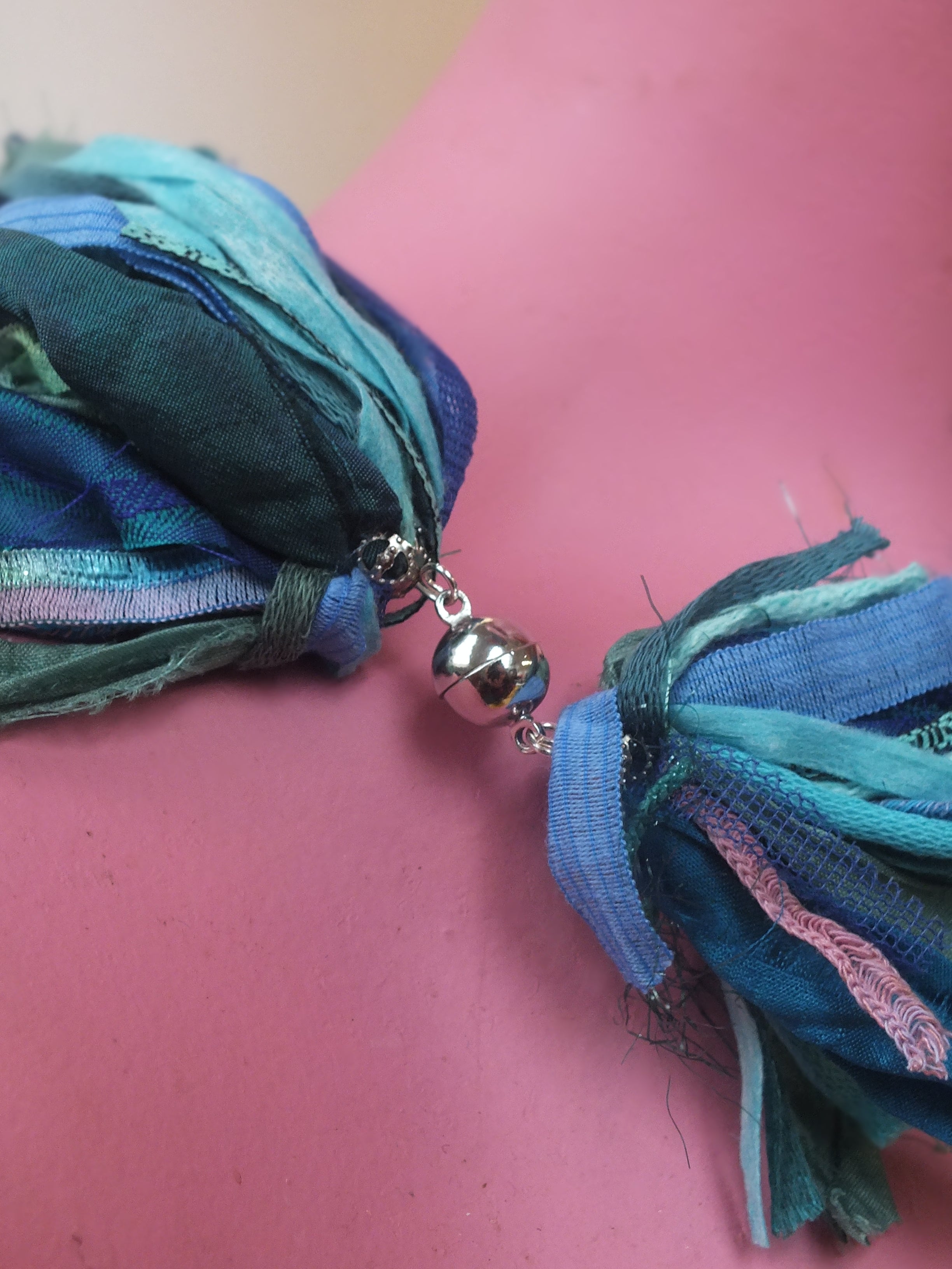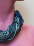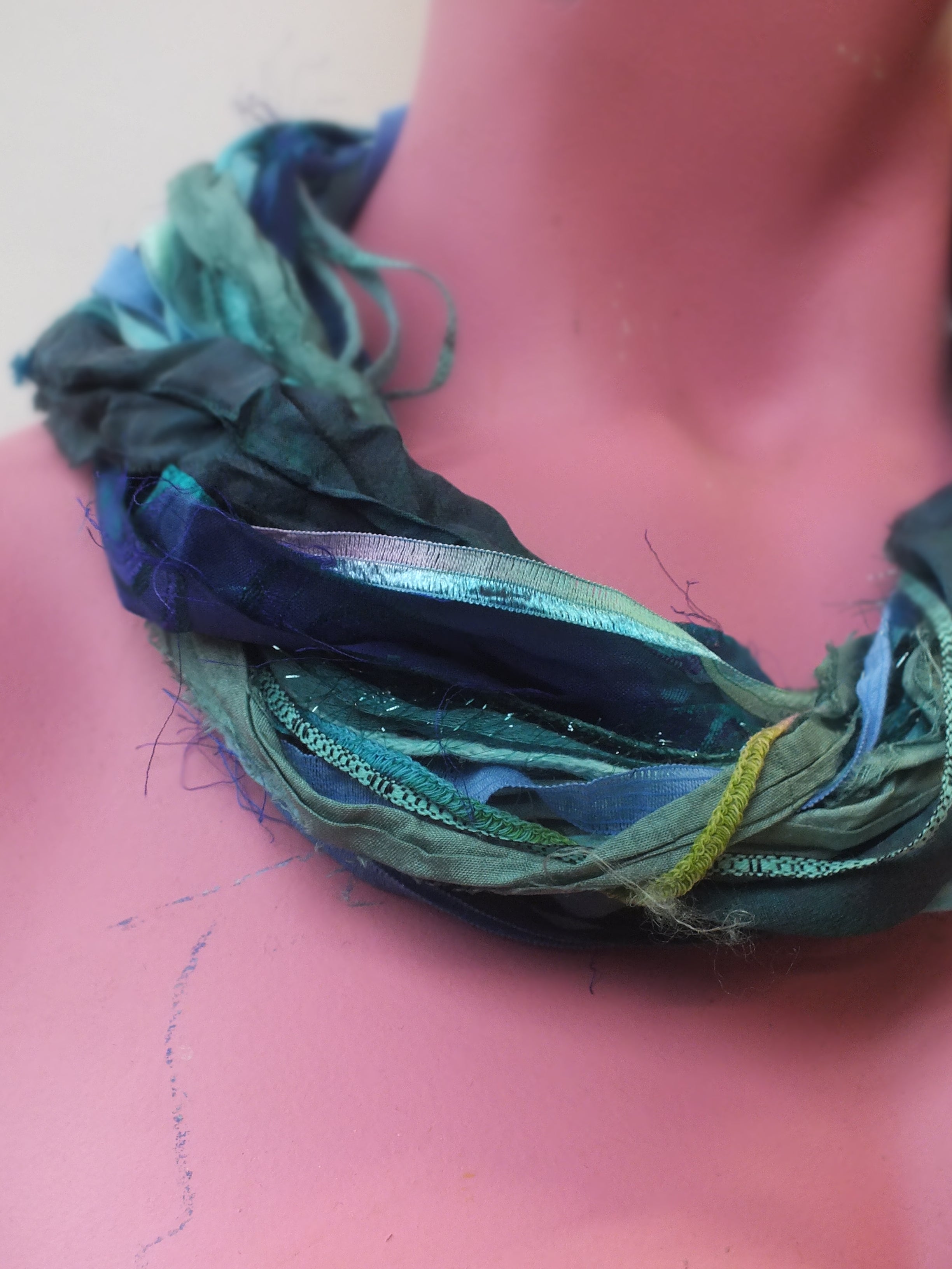 Multi strand, silk yarn necklace with magnetic clap. Features over twenty strands of various novelty yarns. Torn sari silks and hand painted polyamide are often used. Over 30 colourways available and updated regularly.