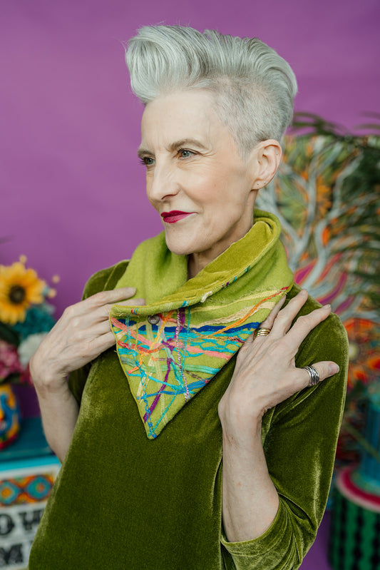 Embellished Wool & Velvet Neck Wrap in Lime Green