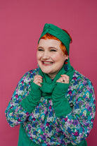 Beautifully soft cable knit jersey cowl and wrist warmer set. A gorgeous gift idea and a stunning colour pop to any outfit. Cowl fits over the head like a snood to drape beautifully around the neck. Comes with matching wrist warmers.