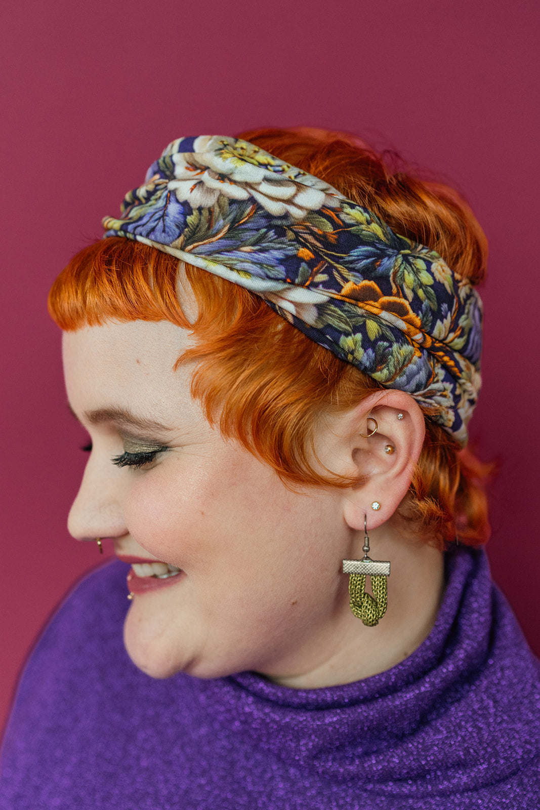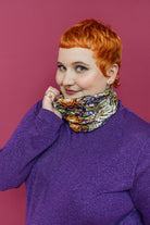 Snood in beautiful floral embroidery digital print soft jersey. Fits over the head and drape beautifully around the neck. Can be worn as a hood, worn over the nose for a temporary face covering or as a cowl style scarf.