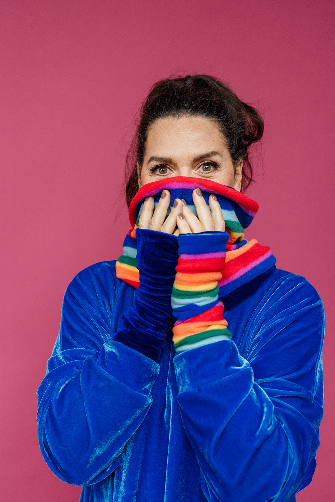 THIS FLEECE! Super vibrant and beautifully soft fleece is featured on this cosy cowl. With a luxurious velvet reverse it is simply stunning and snuggly either way you wear it!