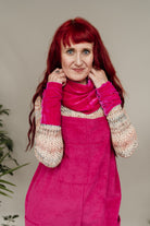 Velvet cowl in bright pink. Fits over the head like a snood to drape beautifully around the neck. Matching wrist warmers also available HERE