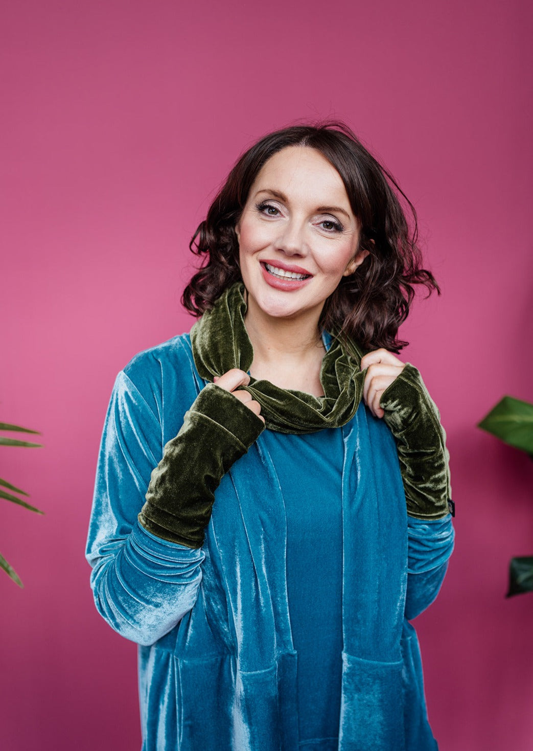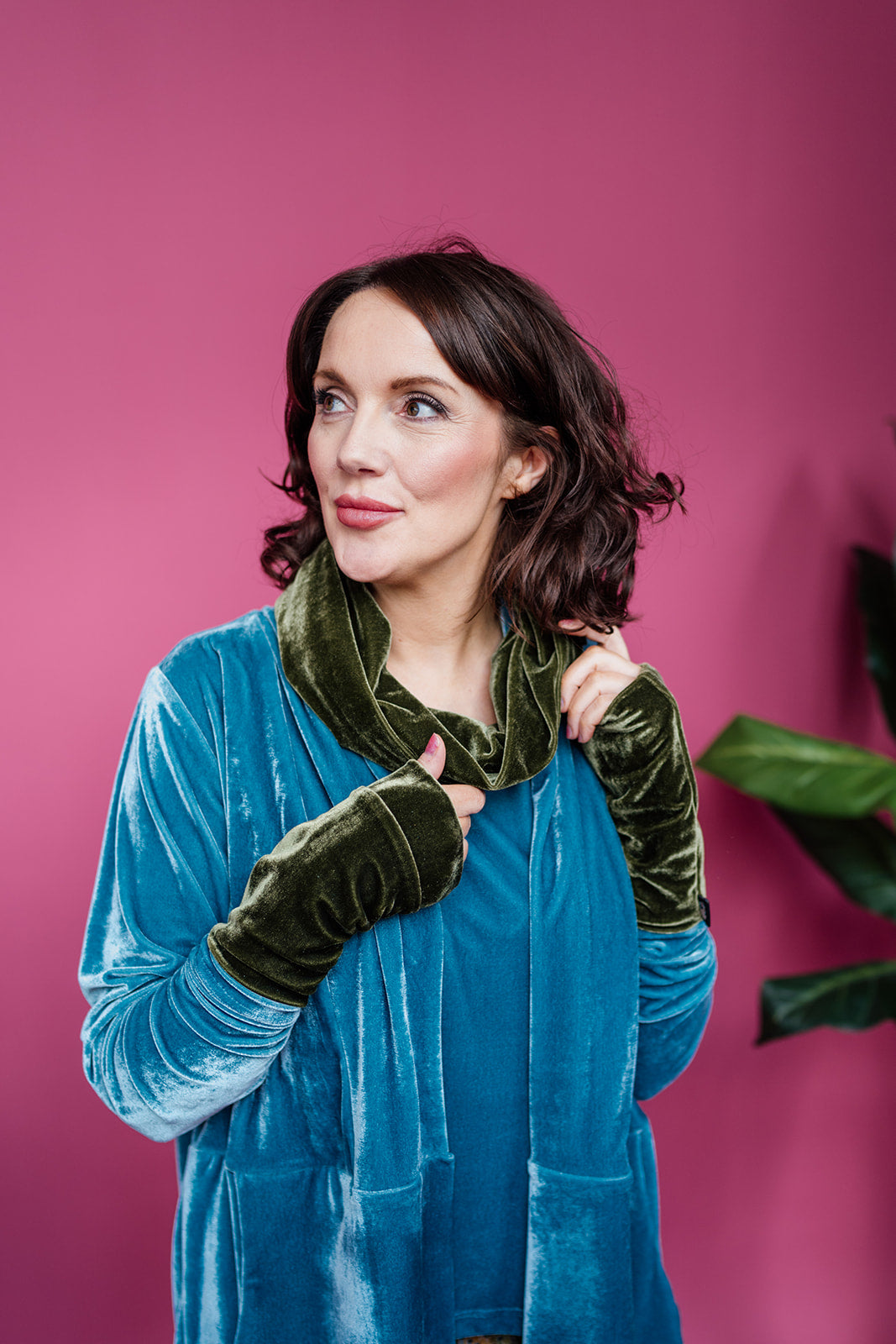 Velvet cowl in a gorgeous dark olive green. Fits over the head like a snood to drape beautifully around the neck. Matching wrist warmers also available.