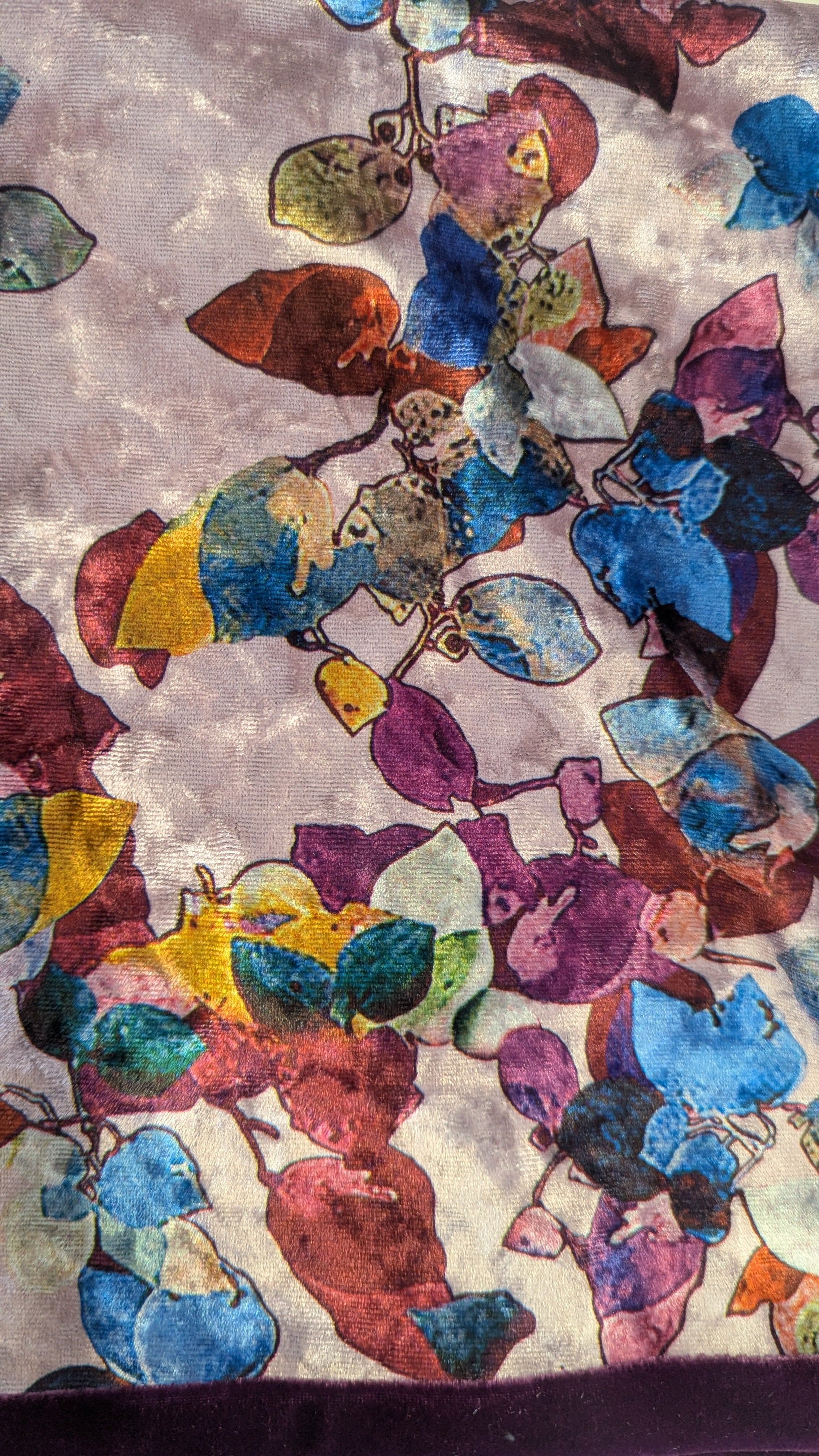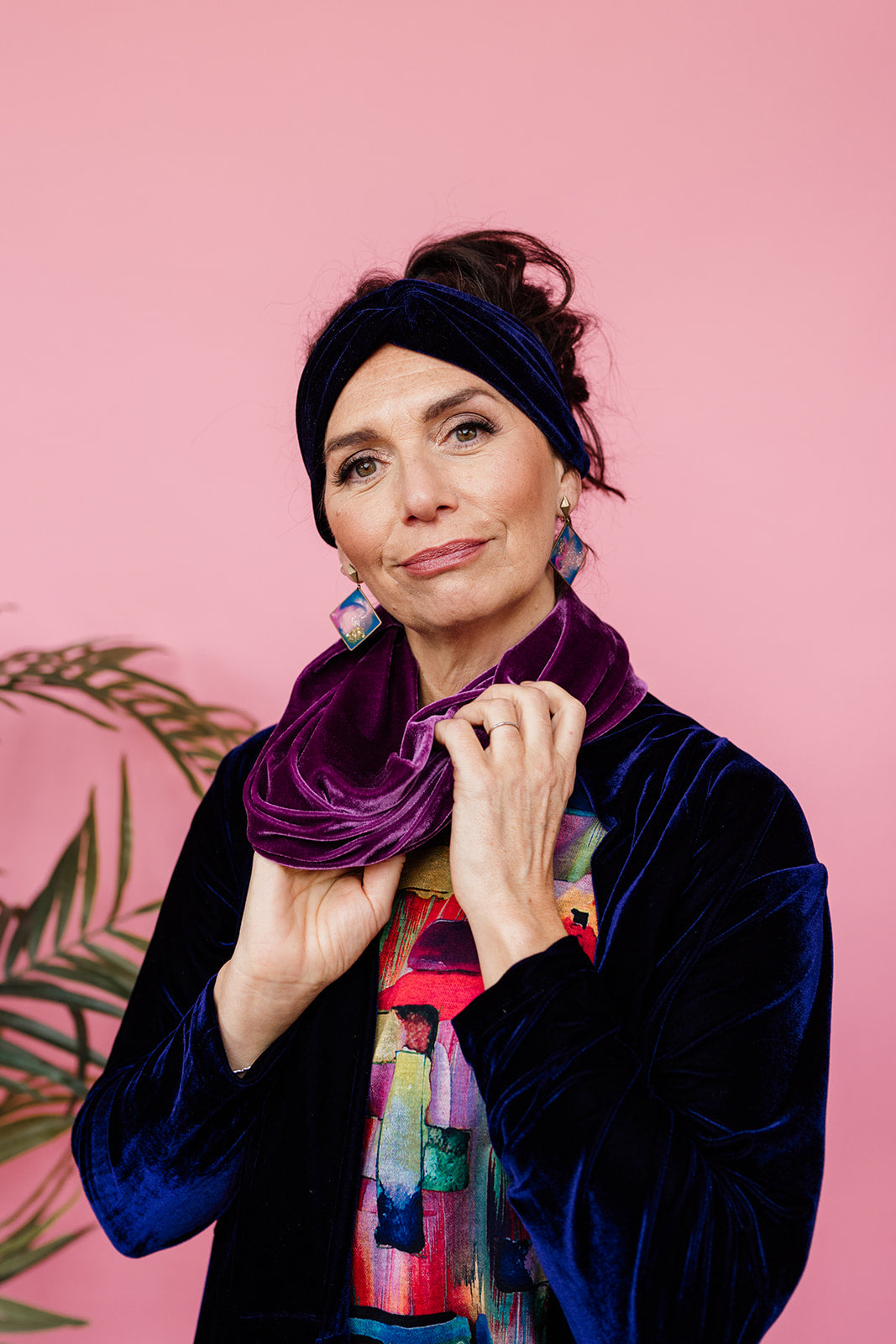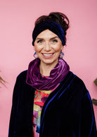 Velvet cowl in a gorgeous plum colour. Fits over the head like a snood to drape beautifully around the neck. Matching wrist warmers also available.