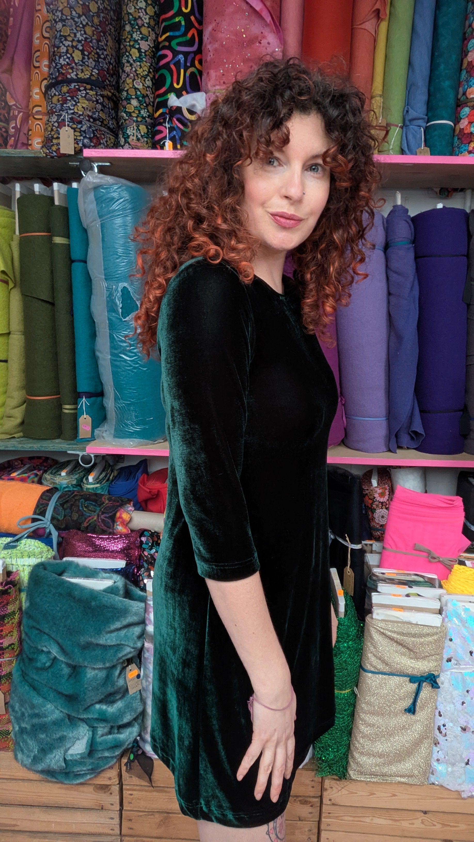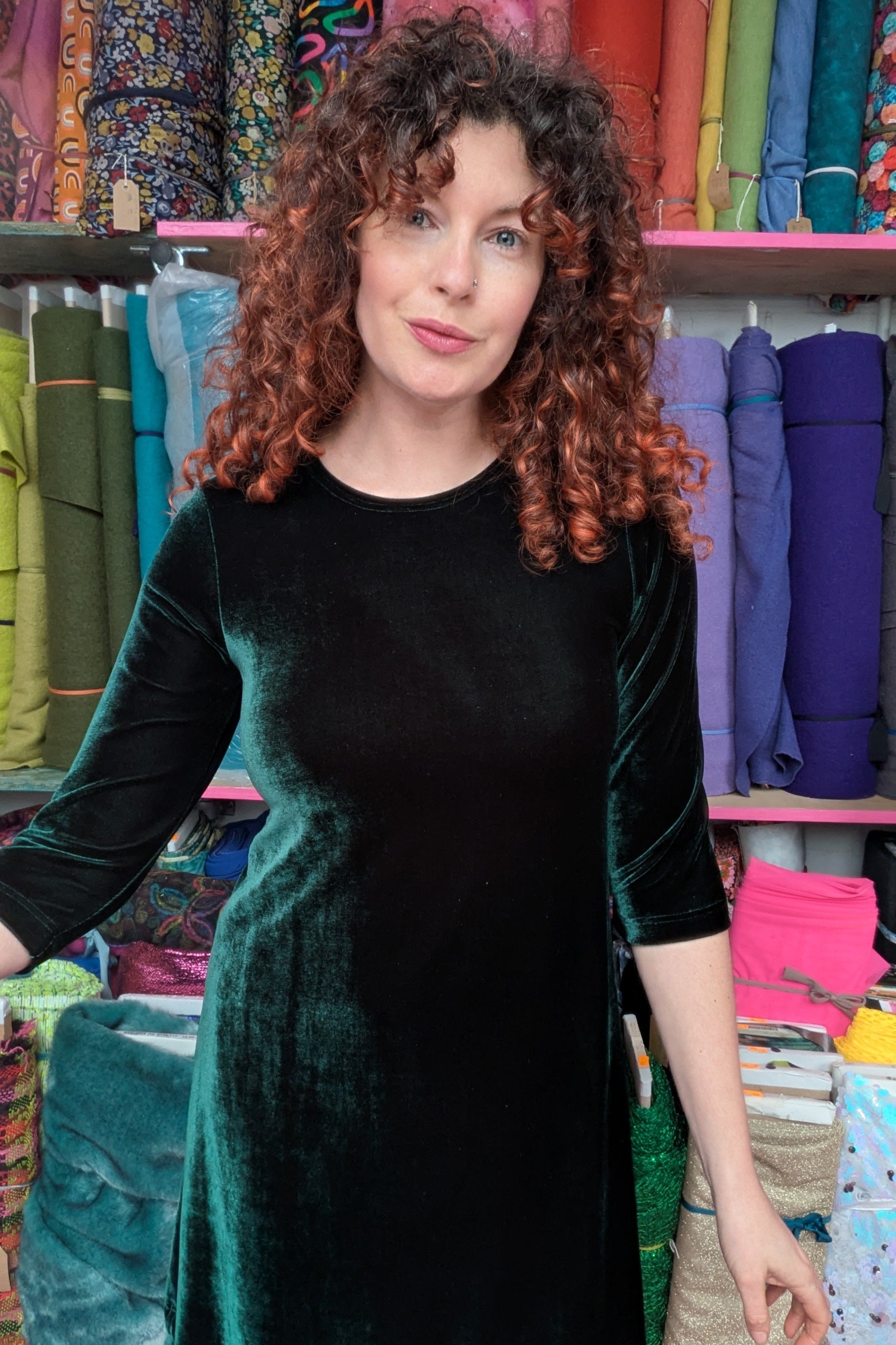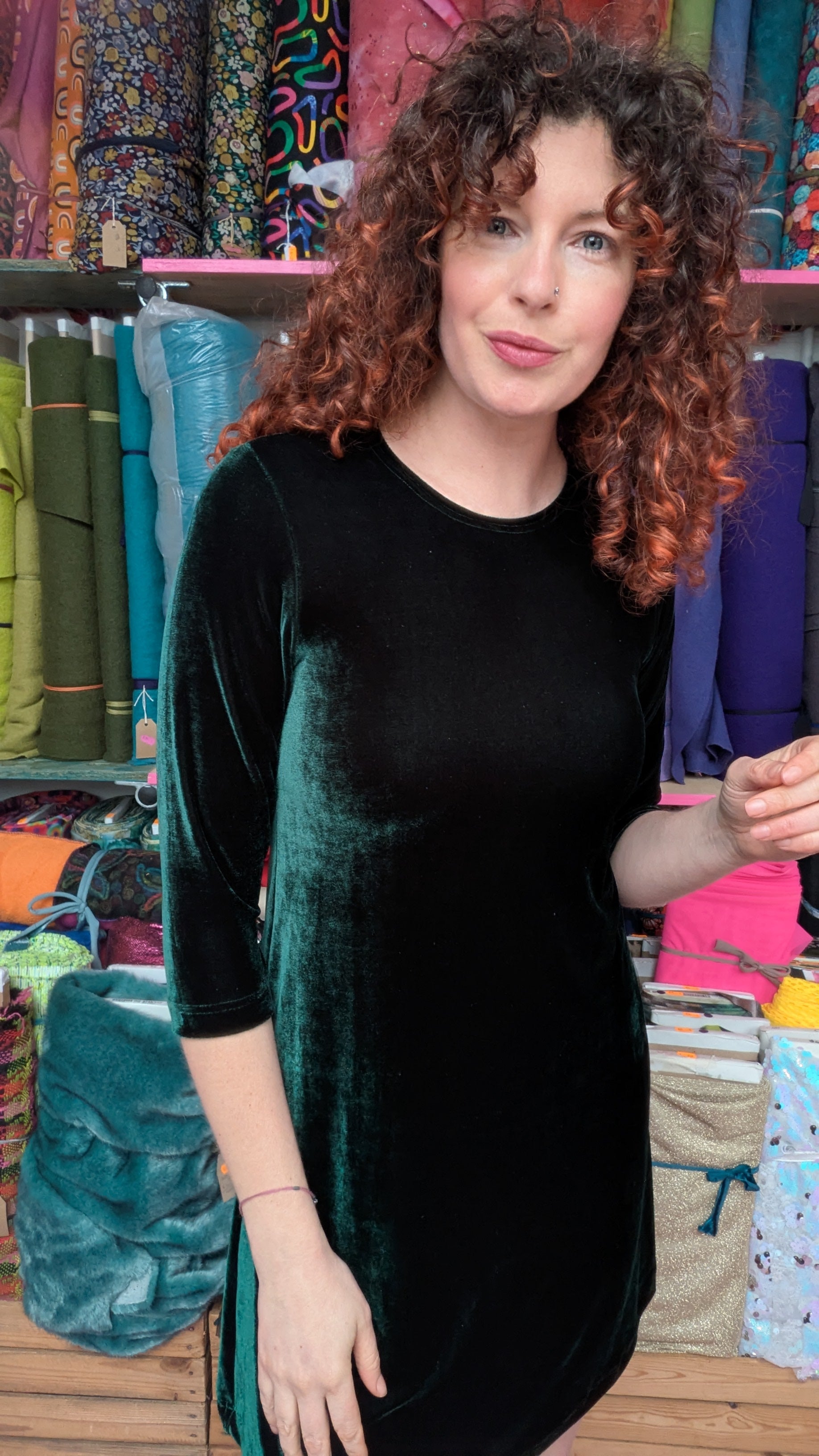 Swing dress with 3/4 sleeve in gorgeous, soft velvet and cut on an A-line for a lovely, flattering drape. This dress can be worn as a tunic over trousers, with bare legs and sandals in the summer or layered up with tights and boots to keep out the winter chill. Great for dressing up or down making is a versatile addition to any wardrobe and available in a wide range of luxurious colours.