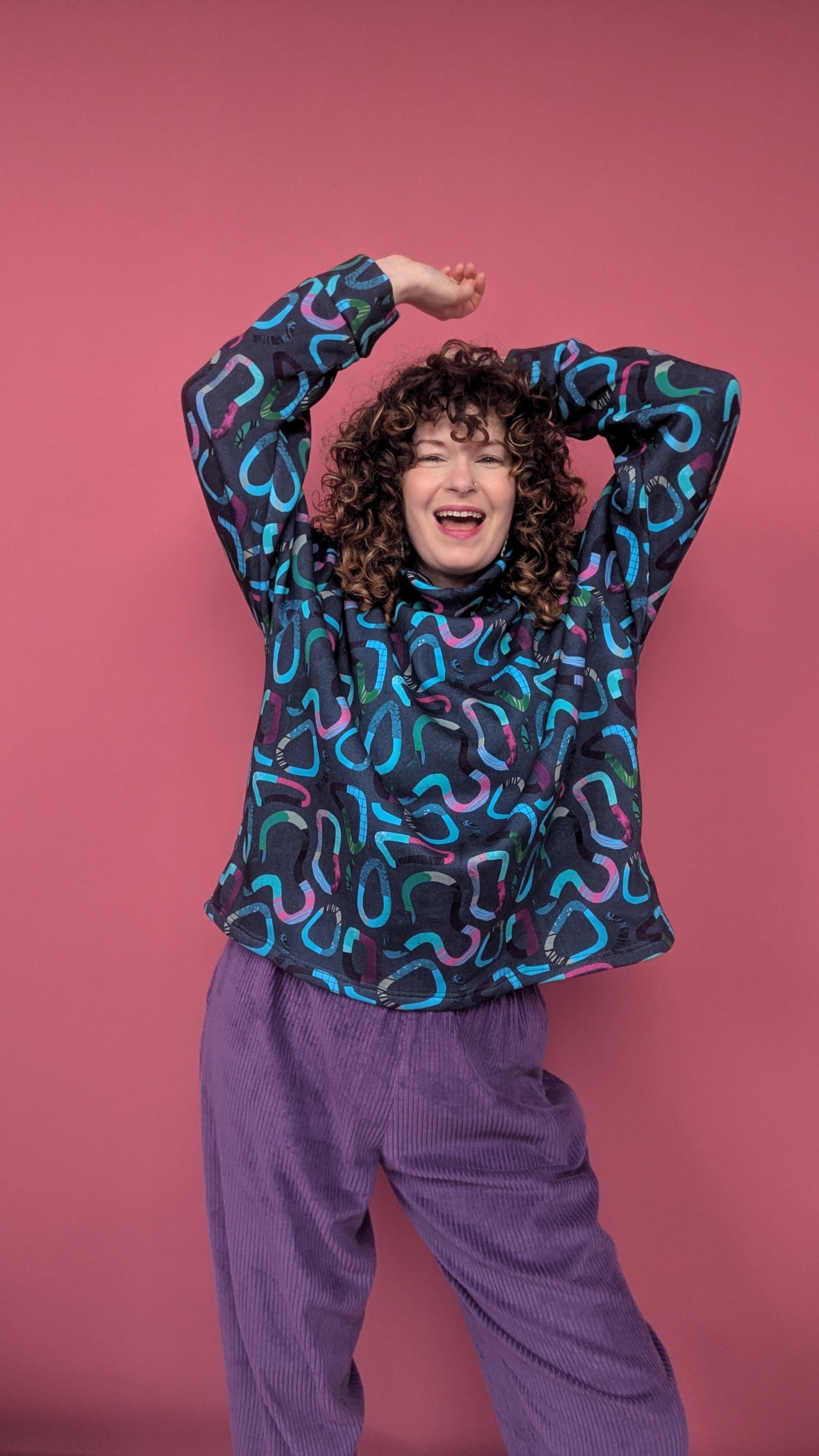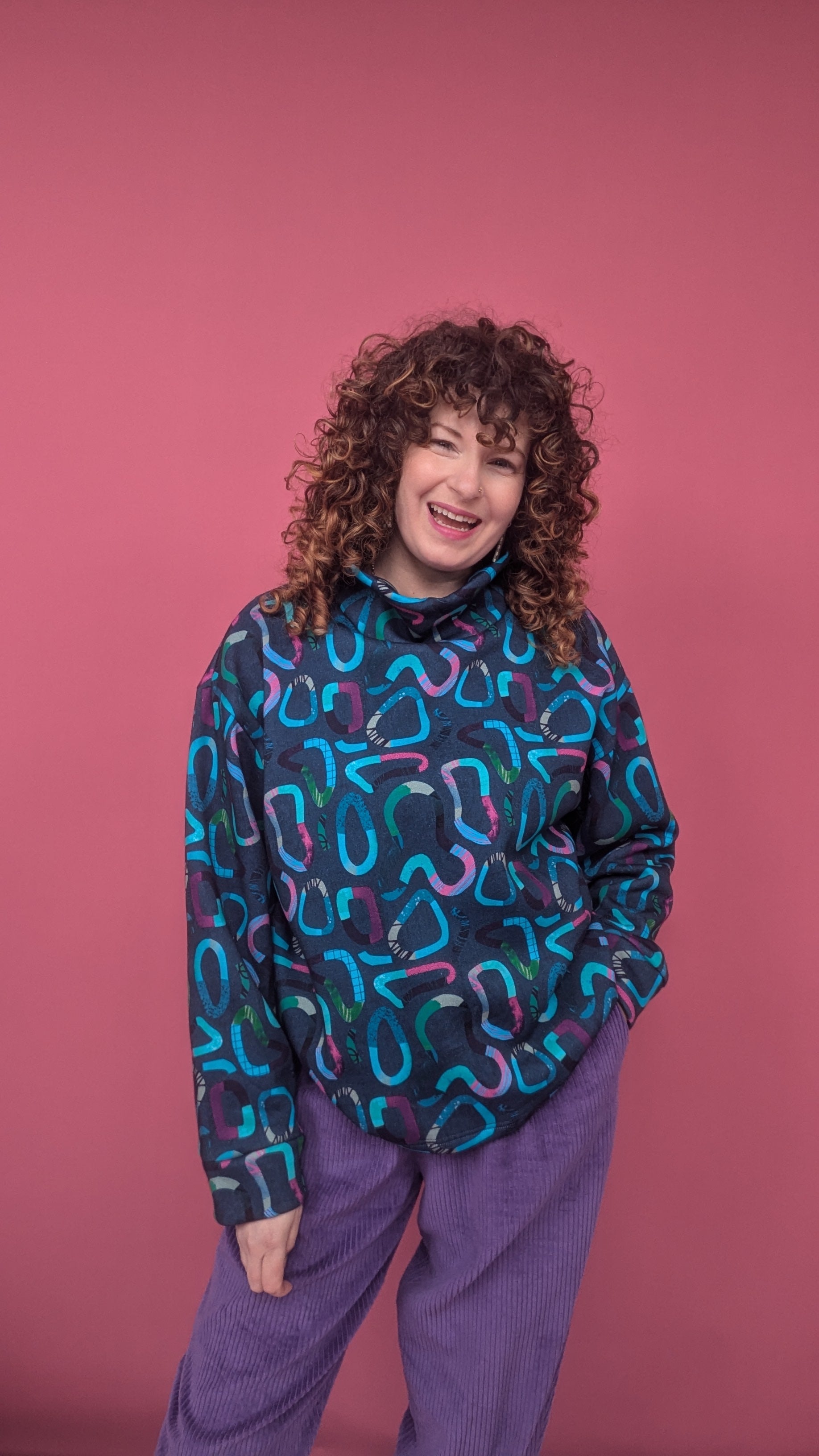 * Funnel Neck Pullover in Squiggle Blobs Dark Teal