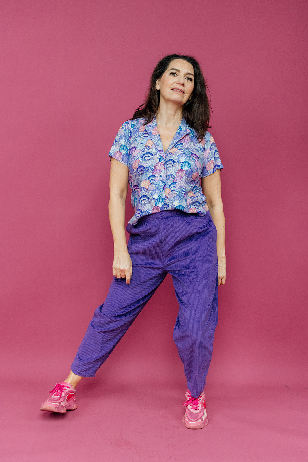 Handmade cropped bowling shirt in beautiful seashell print, with a gorgeous mix of blue, purple, pink and orange.