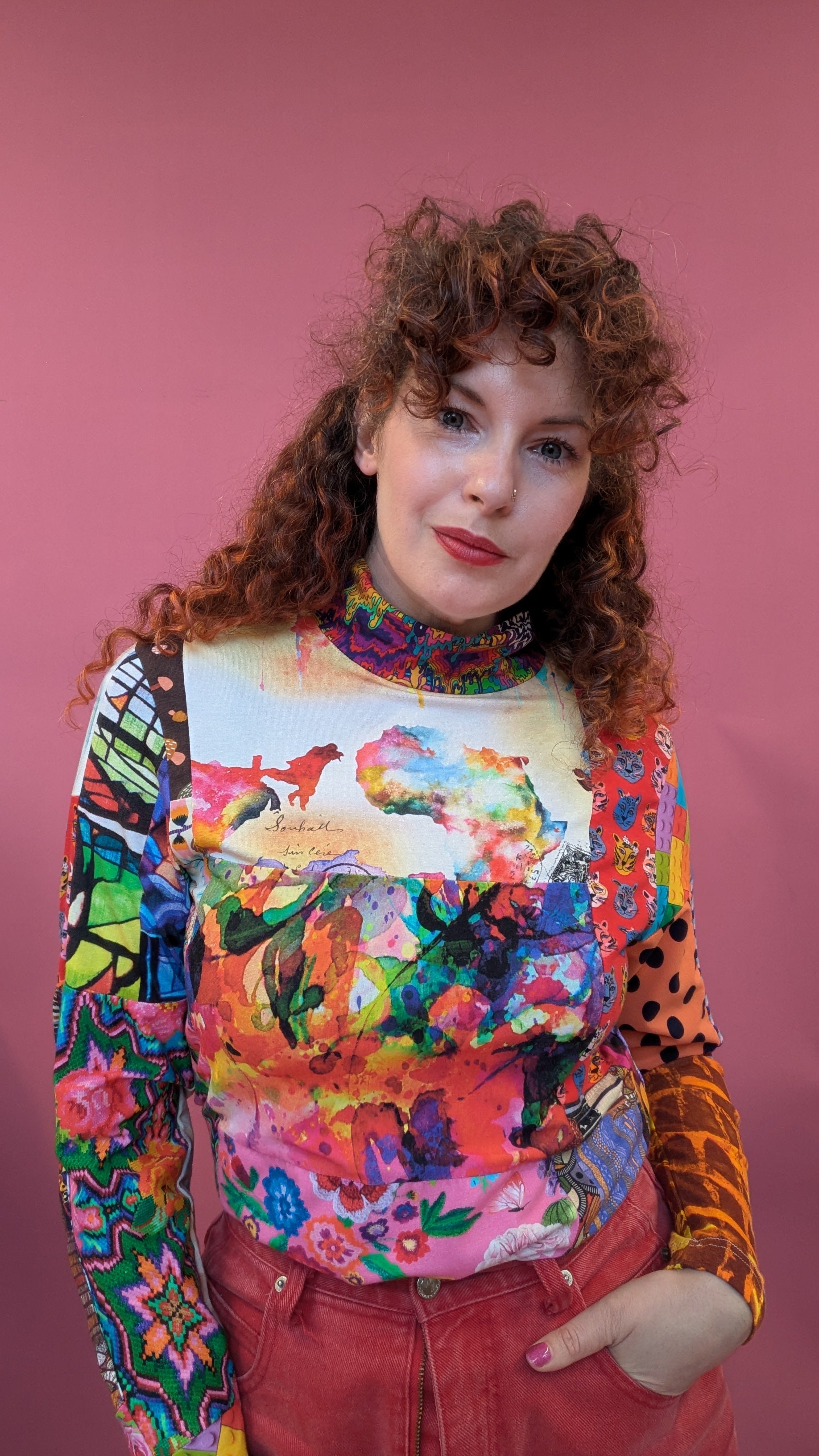 Long sleeve, mock turtleneck top in epic patchwork!