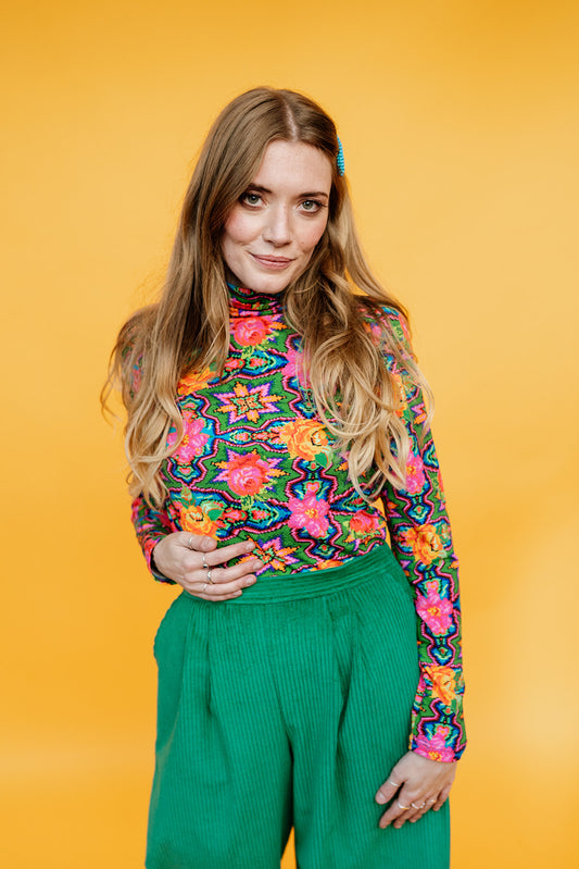 Long Sleeved Turtleneck in Green Cross Stitch Print