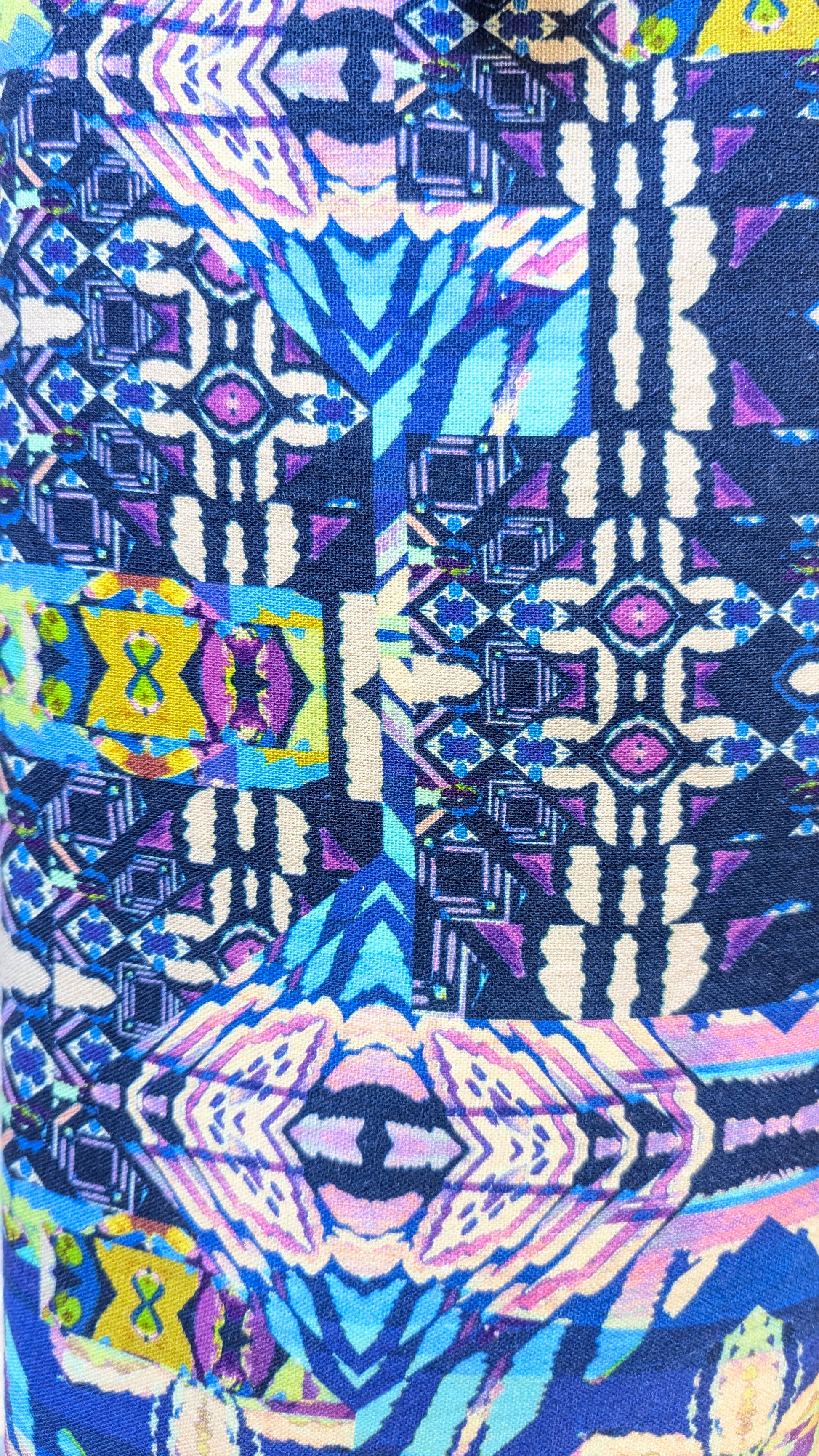 Easy to wear, ankle grazing trousers in this striking linen print. Pull on style with elastic at back waist and front pockets. Easy fit and super comfortable.
