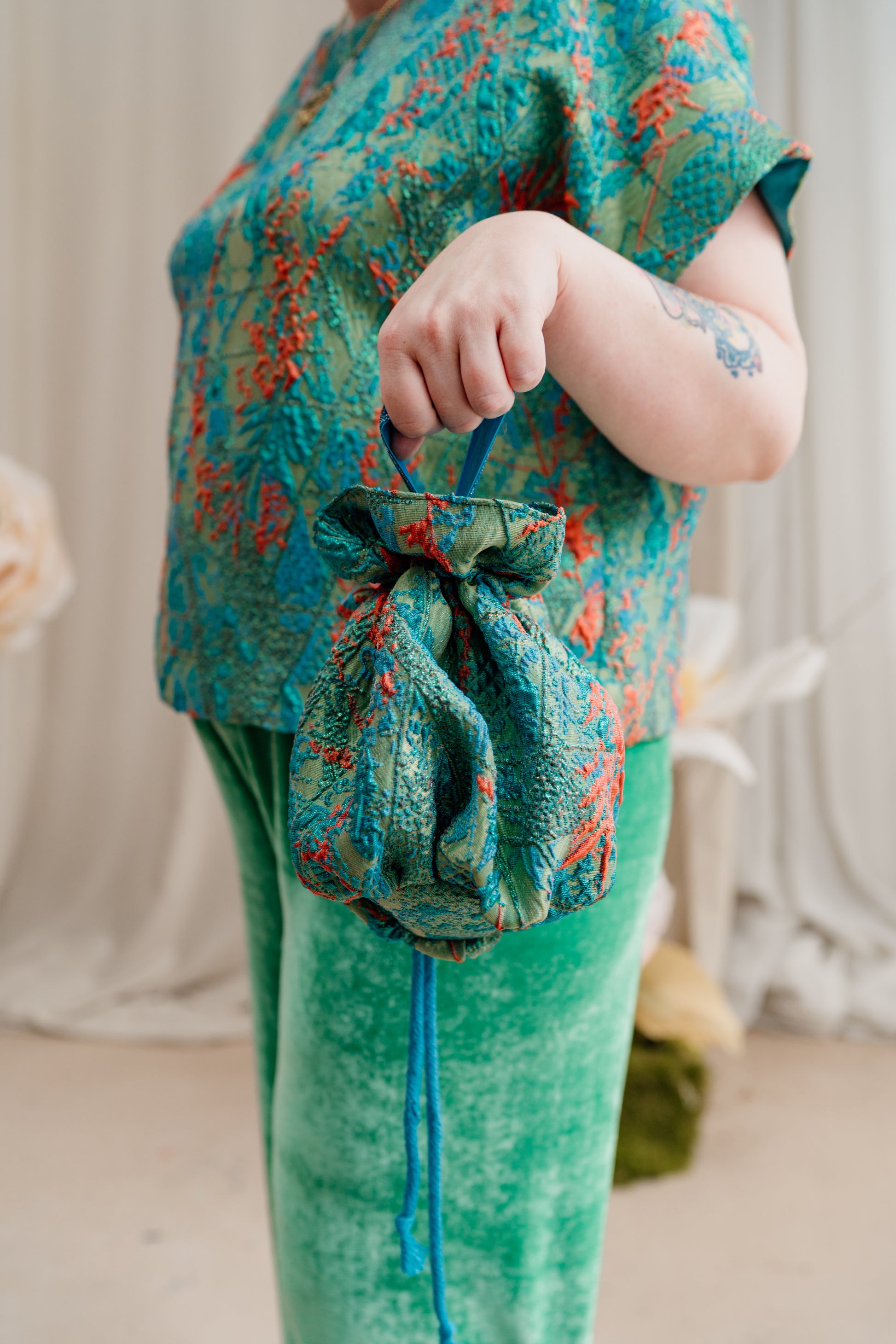 Stunning bucket bag in our speciality metallic fabric! The perfect accessory to finish off any outfit! Small but surprisingly roomy for all your on the go must-haves on a big day.