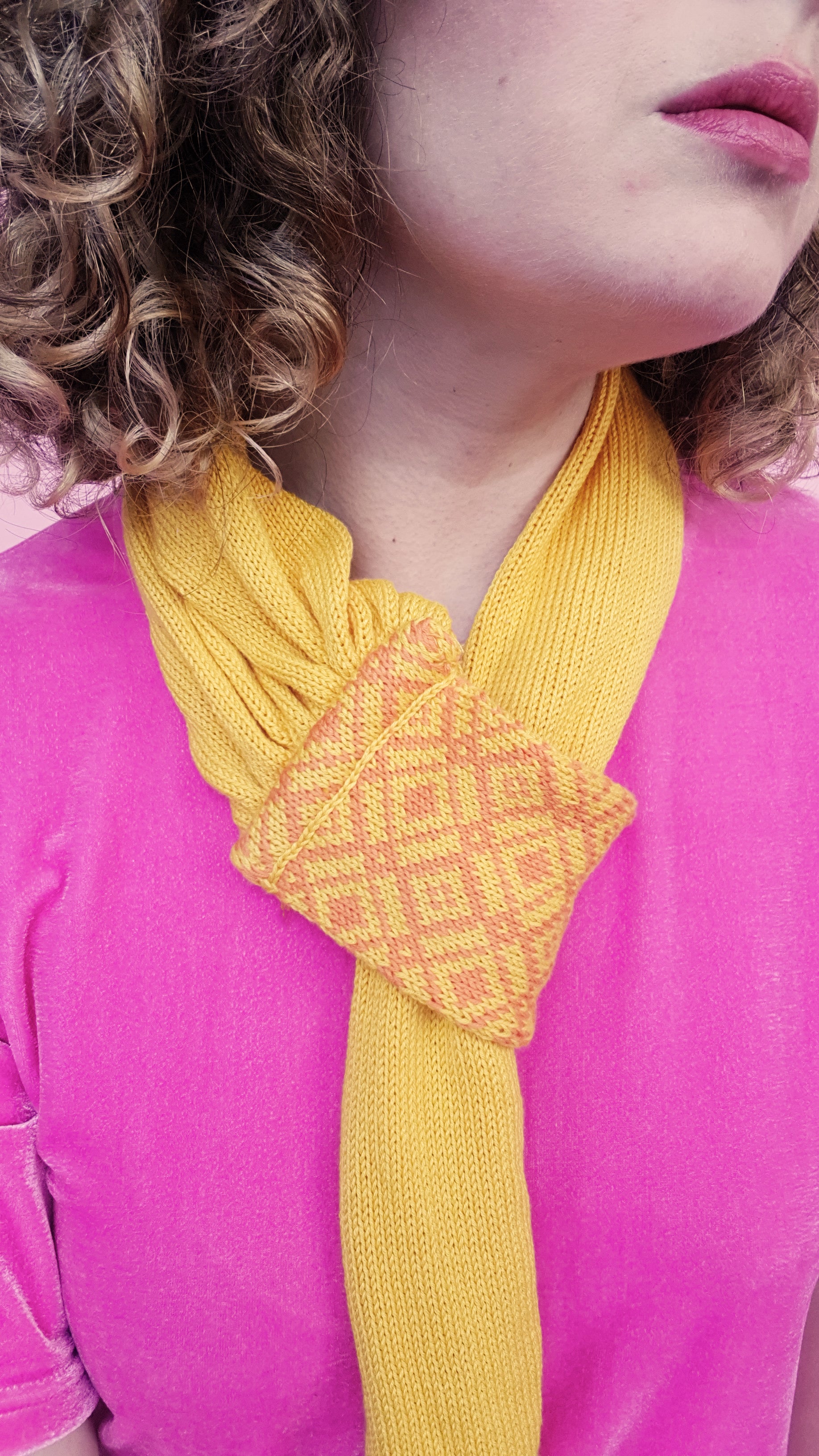Cotton scarf with pull through self fastening fair isle knitted cuff. A great scarf alternative for people who can't wear wool.