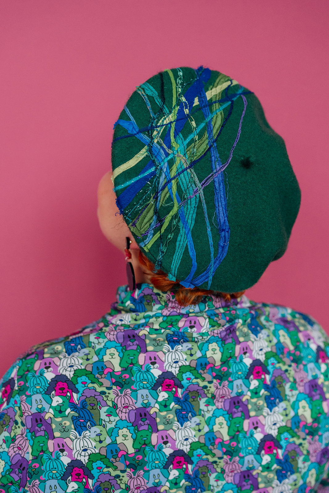 Beautiful dark green wool beret with our signature embellishment technique of painting with textiles.