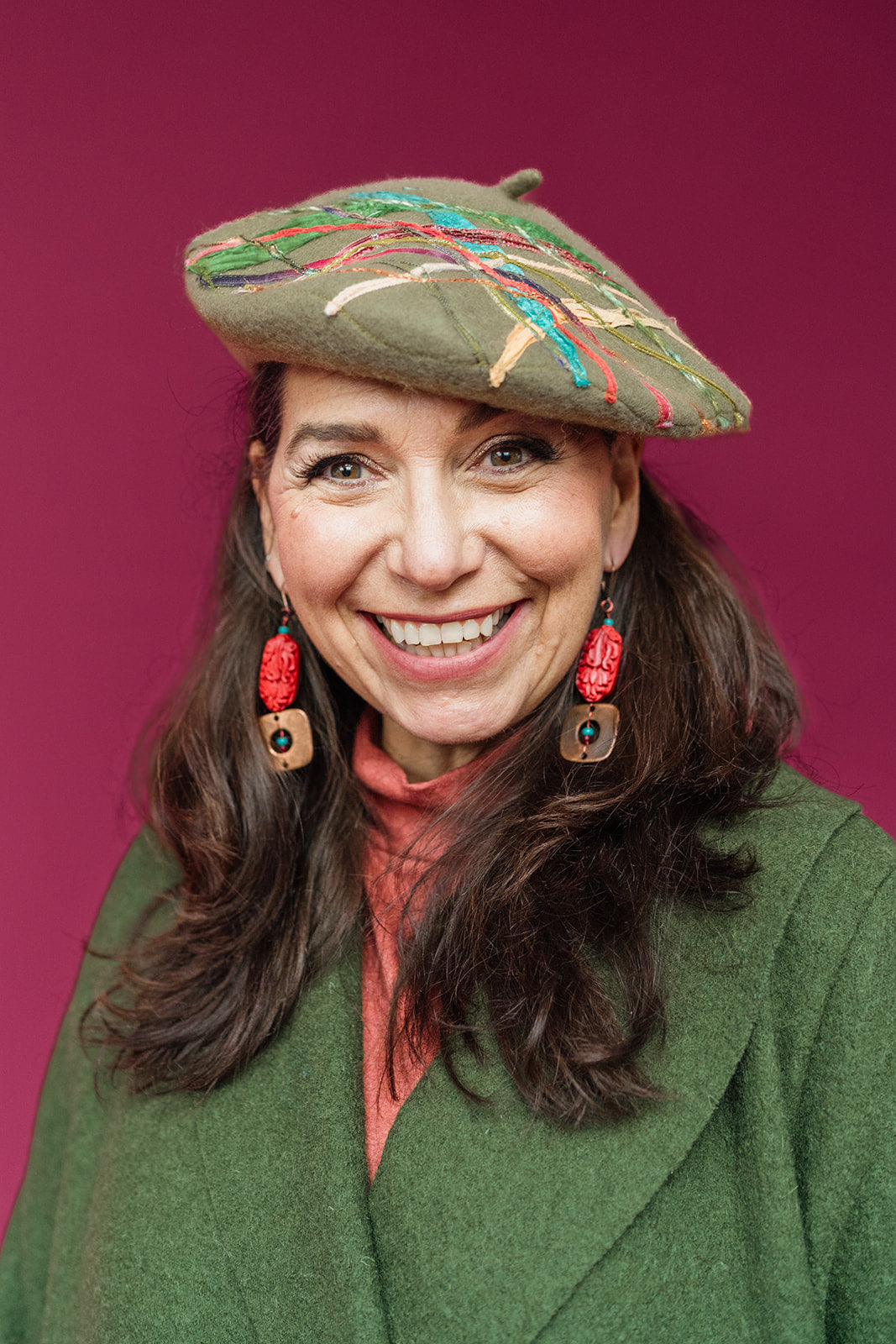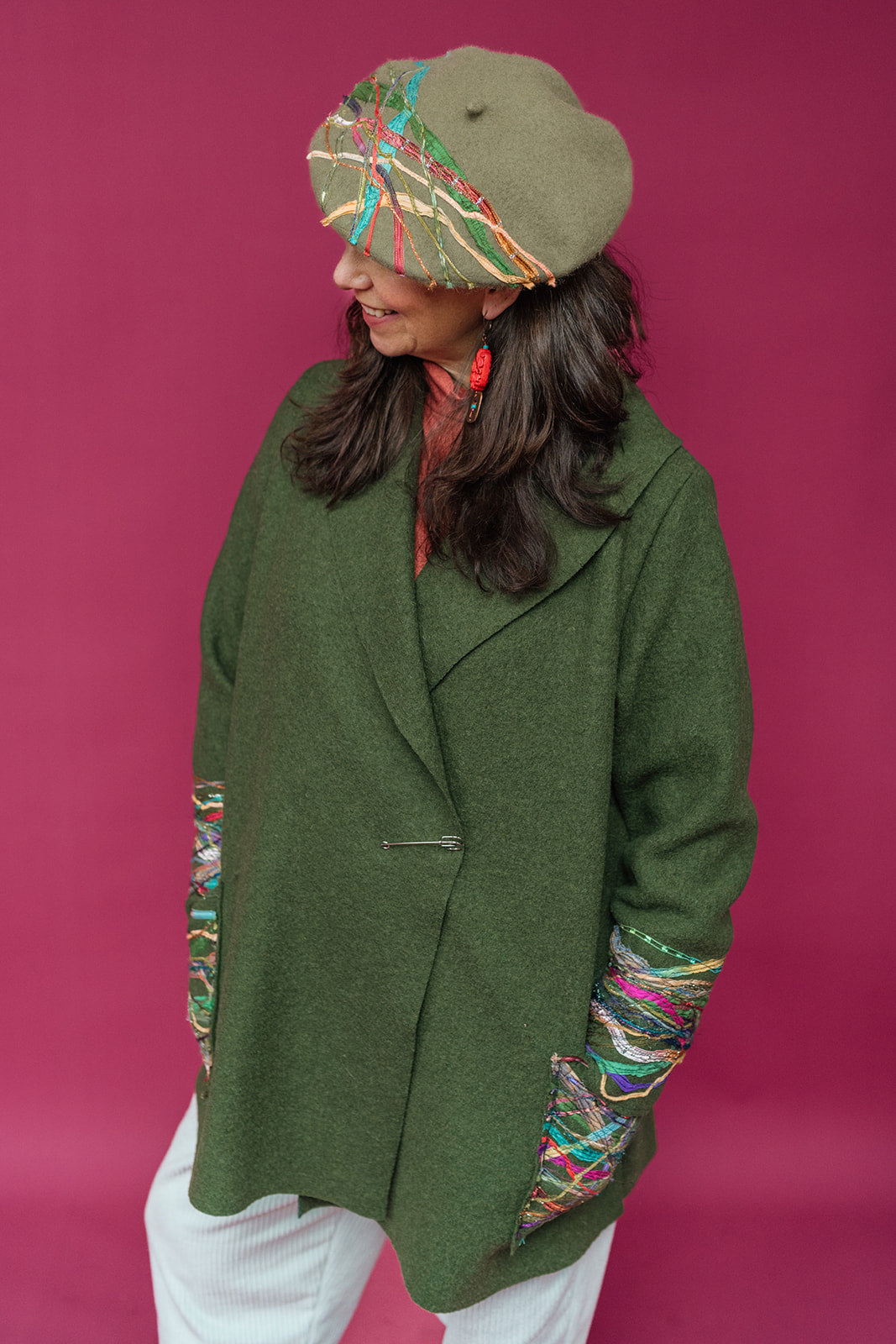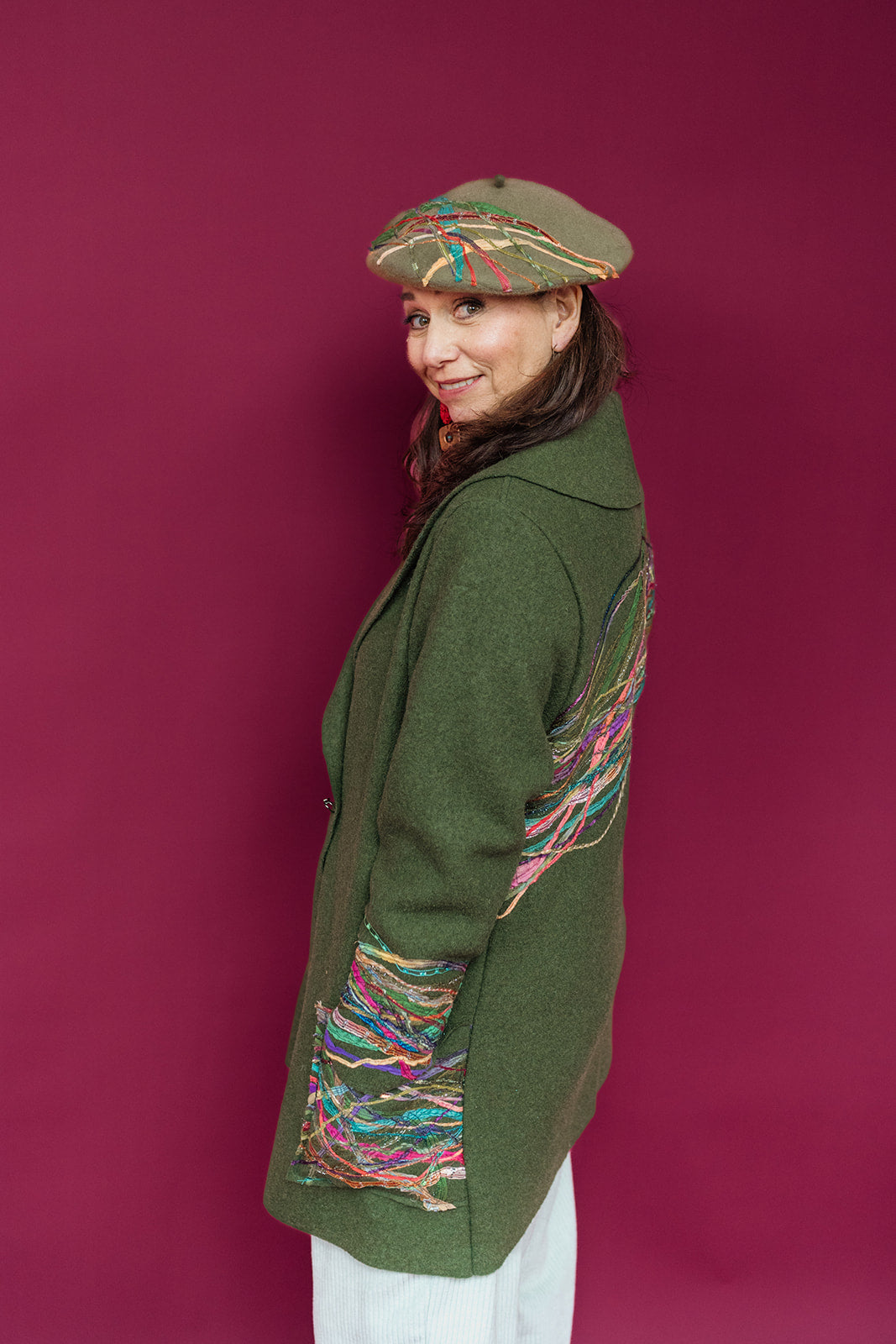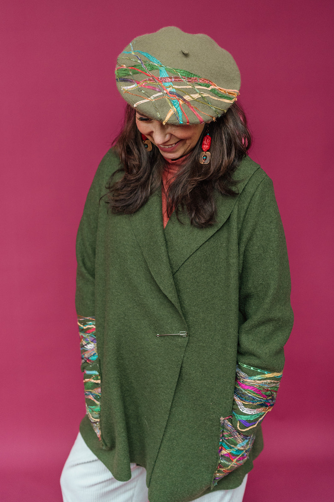 Dark olive green wool beret with our signature embellishment technique of painting with textiles.