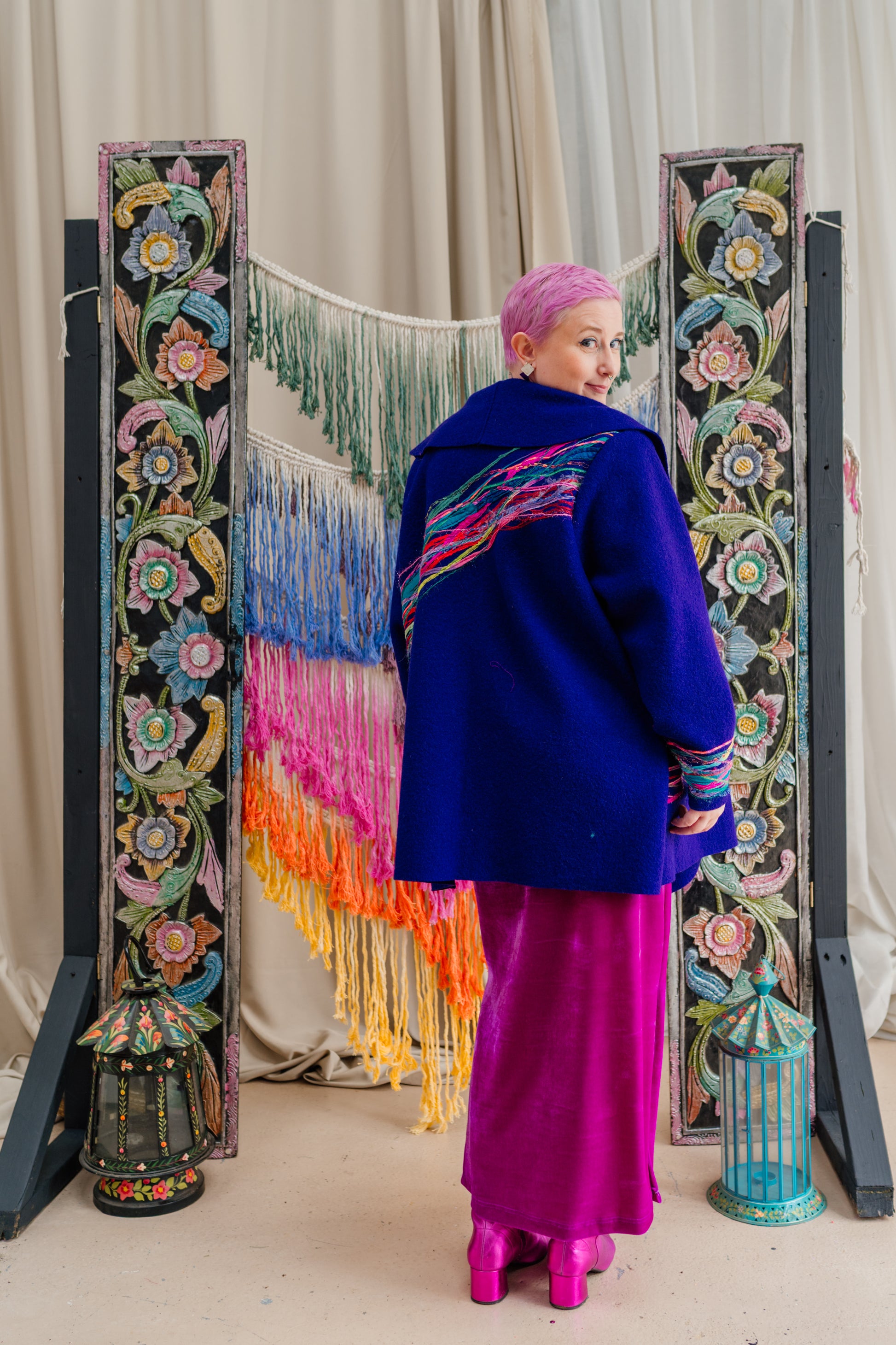 Beautifully embellished short wool coat. Finished with a striking yarn embellishment across back, cuffs and pockets. Think of it like painting with textiles, each strand is considerately placed to create a wearable work of art.