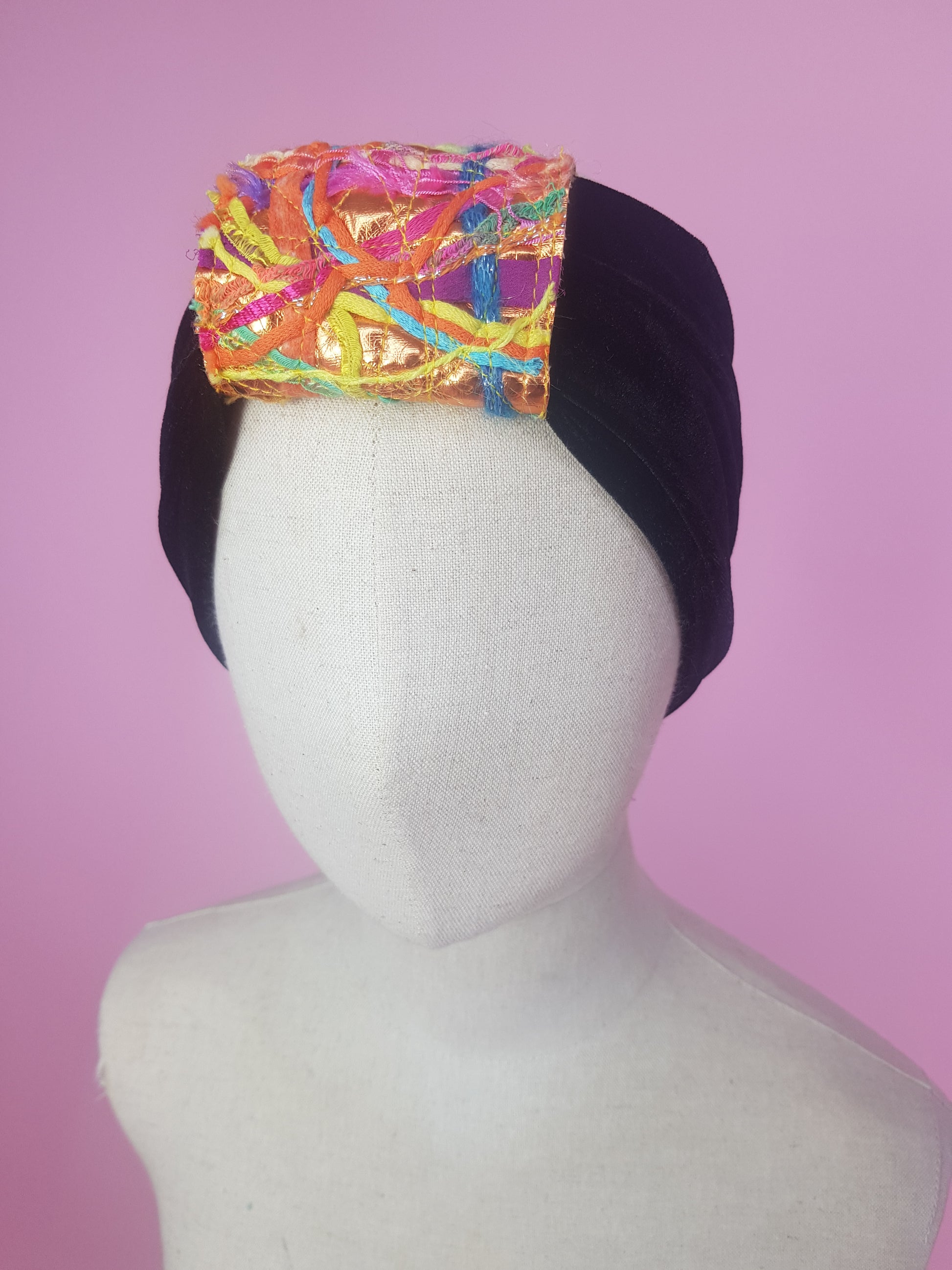Turban in velvet. Can also be worn as a neck warmer. Features embellished cuff made using machine embroidery and mixed materials on metallic vegan leather.