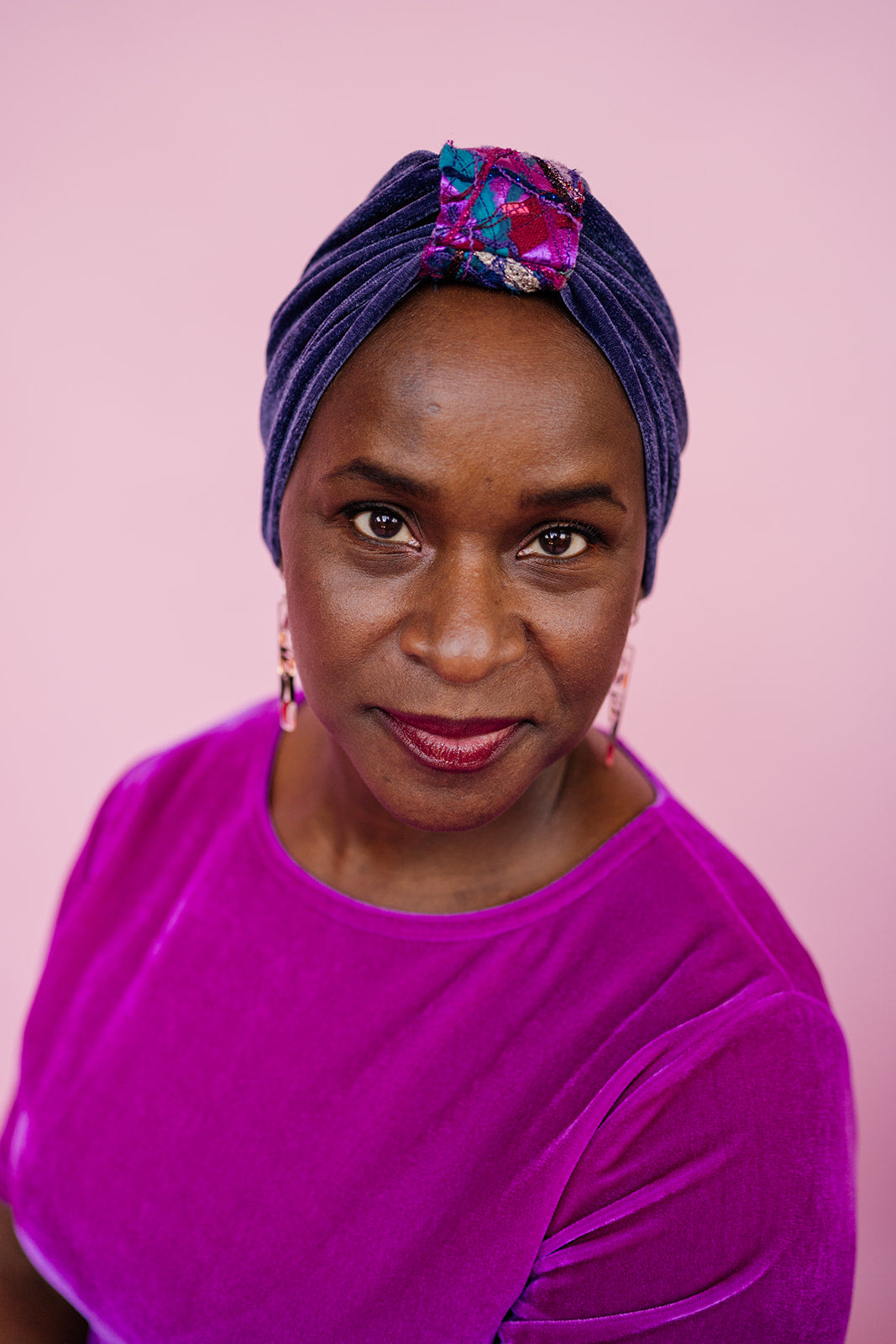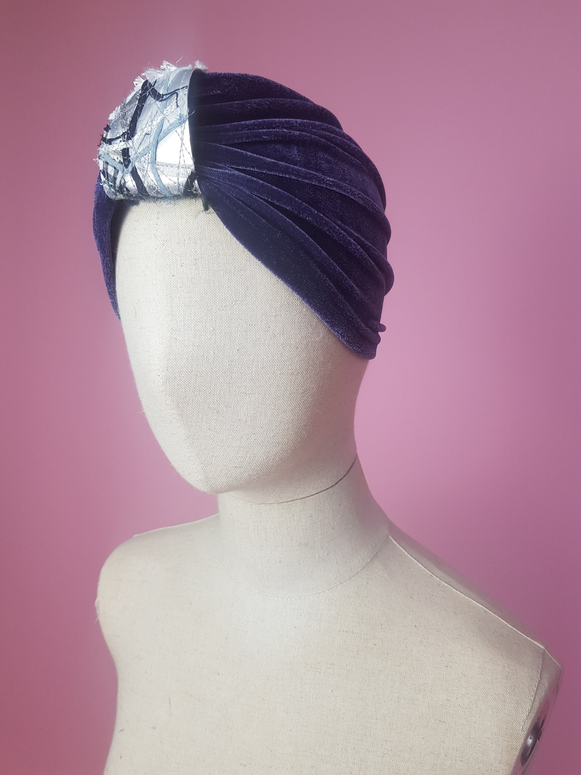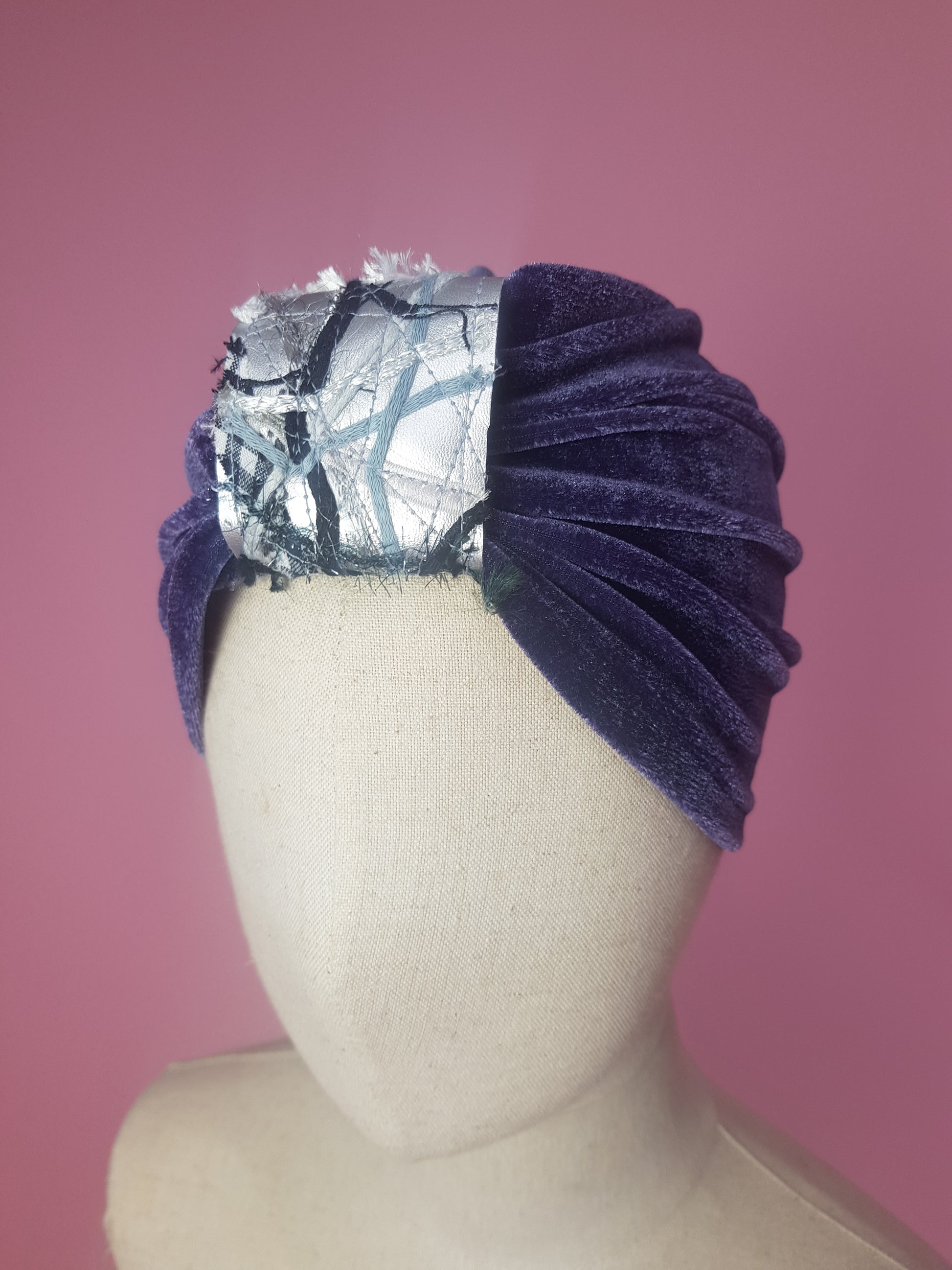 Turban in velvet. Features embellished cuff made using machine embroidery and mixed materials on metallic vegan leather.