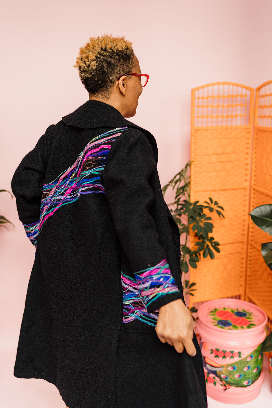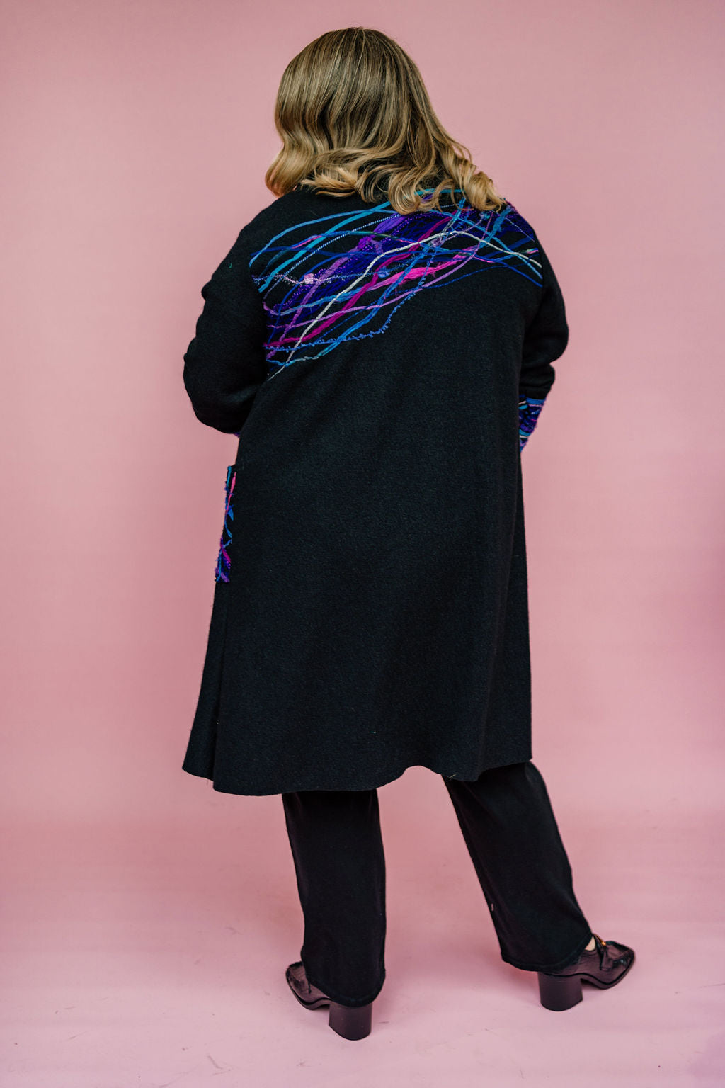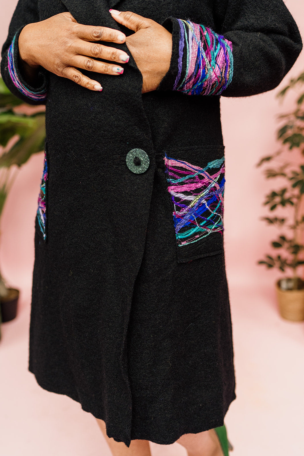 Beautifully embellished long wool coat in black. Finished with a striking yarn embellishment across back, cuffs and pockets. Think of it like painting with textiles, each strand is considerately placed to create a wearable work of art.