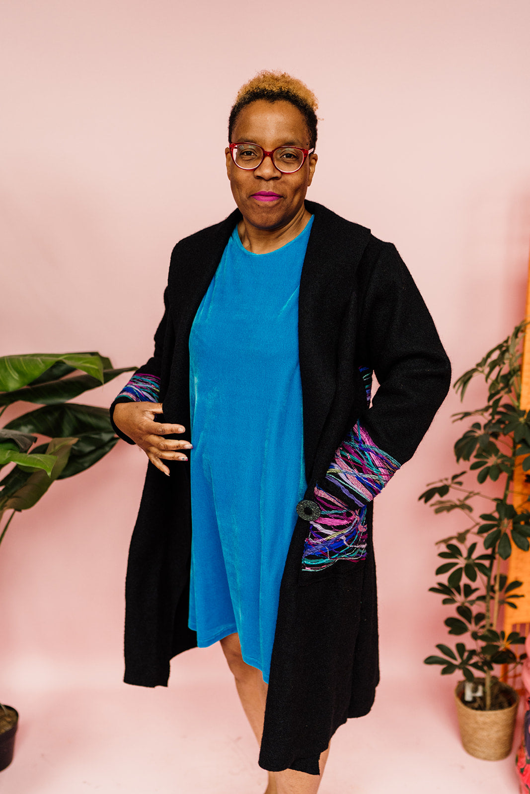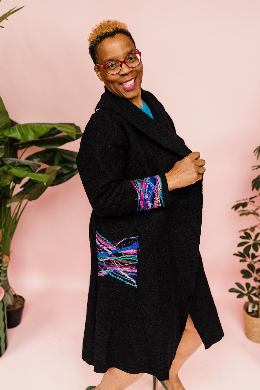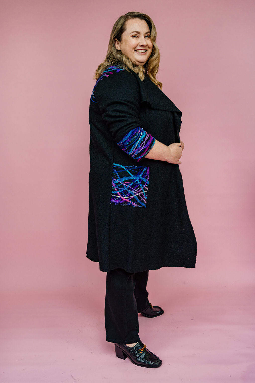 Beautifully embellished long wool coat in black. Finished with a striking yarn embellishment across back, cuffs and pockets. Think of it like painting with textiles, each strand is considerately placed to create a wearable work of art.