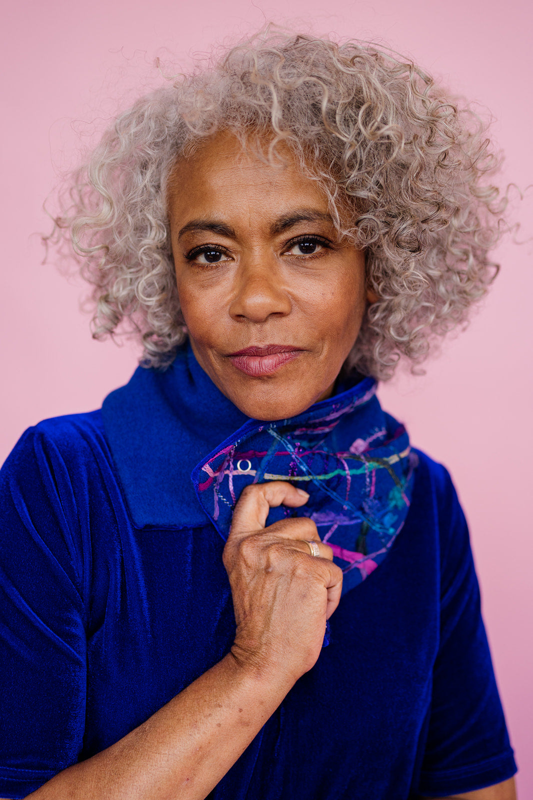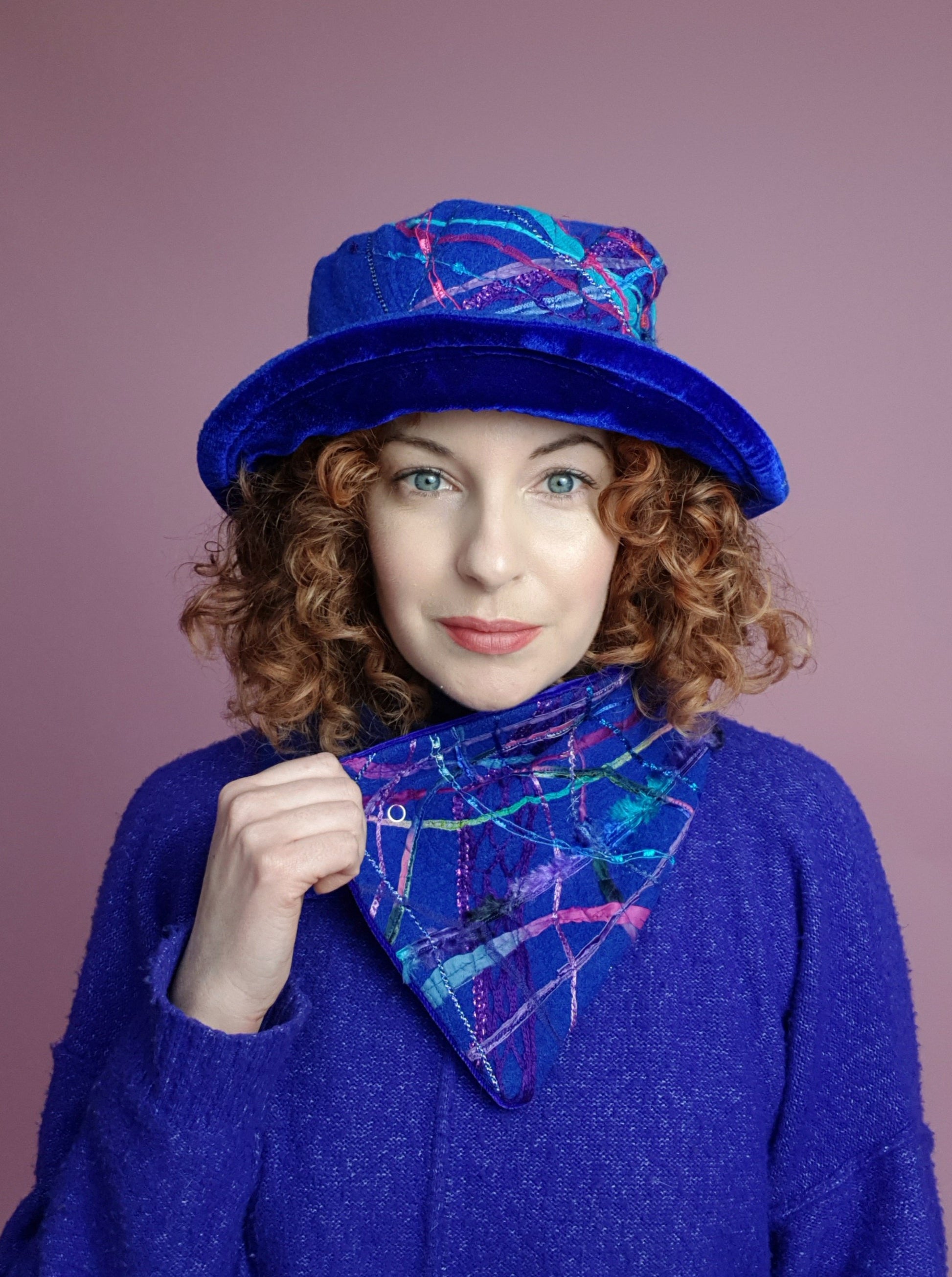 Royal blue neck wrap in boiled wool with a vivid lapis blue velvet lining and snap closure. Features handmade embellishments using machine embroidery and mixed materials. Each neck wrap is unique and may vary slightly from that pictured.